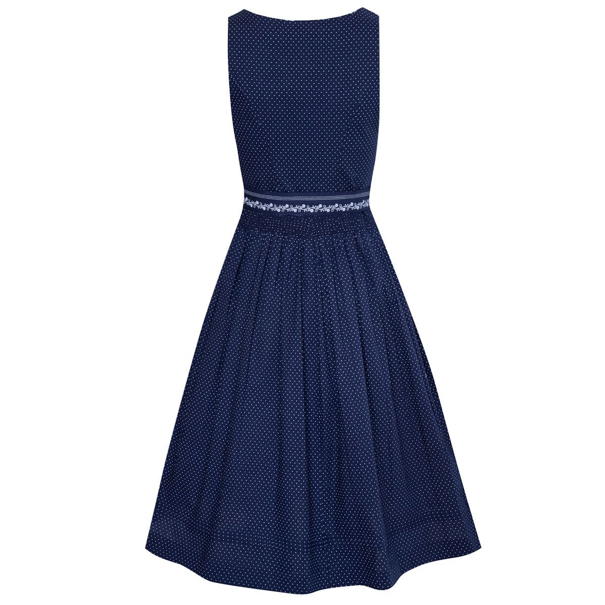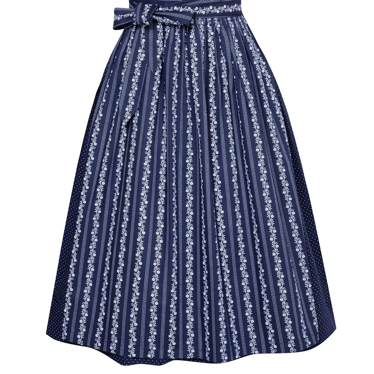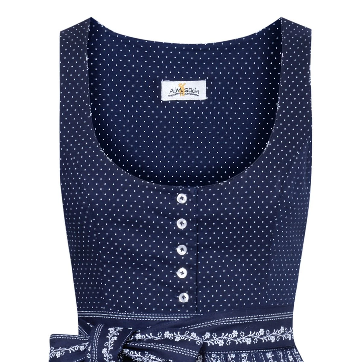 Hübsches midi Dirndl Nina in markantem Dunkelblau von der Marke Almsach.. Dieses schöne Dirndl hat ein durchgehend dunkelblaues Dirndlkleid mit einem dezenten weißen Muster. Das Dirndlkleid hat einen Rundhalsausschnitt. Bei diesem Modell ist die Schürze dunkelblau mit einem hübschen, leicht verspielten Muster versehen. Der Dirndlrock hat eine Länge von 70 Zentimetern.Hinweis zur Abbildung: Sofern nicht anders beschrieben, werden unsere Dirndl ohne Dirndlbluse geliefert. Dirndl und Bluse können Sie bei uns in verschiedenen Größen bestellen, so passt die Tracht perfekt. Unser Tipp: Variieren Sie z. B. zwischen weißen und schwarzen Dirndlblusen, viele unserer Dirndl können mit beiden Farben und verschiedenen Dirndlblusen (z. B. Langarmbluse, Kurzarmbluse) getragen werden. Zudem können fast alle unsere Dirndl für kleines Geld (ca. 15 Euro) beim Schneider angepasst werden wenn es einmal nicht passt. So wird ein wunderschönes Dirndl zu Ihrem perfekt sitzenden Dirndl Unikat!Die Damen Dirndl in dunkelblau können unterschieden werden nach Balkonettausschnitt, den eckigen Balkonettausschnitt und den Herzausschnitt sowie den Unterbrustausschnitt und V-Ausshnitt. Wir haben die passenden Dirndblusen Dekoleéformen zu Ihrem neuen dunkelblauen Dirndl zum Oktoberfest. Sollten Sie ein blaues Dirndl kaufen mit Unterbrustschnitt, dann sollten Sie auch eine passende Dirndlbluse bestellen. Ein blaues Dirndl welches keine 100 Euro kostet ist ebenfalls ein Top Dirndl bei uns. Wir achten auf Marken und Qualität beim Einkaufen und können Ihnen alle unsere Dirndl nur empfehlen.