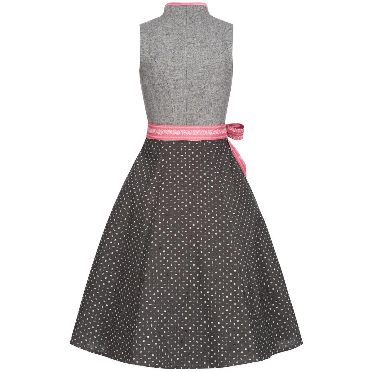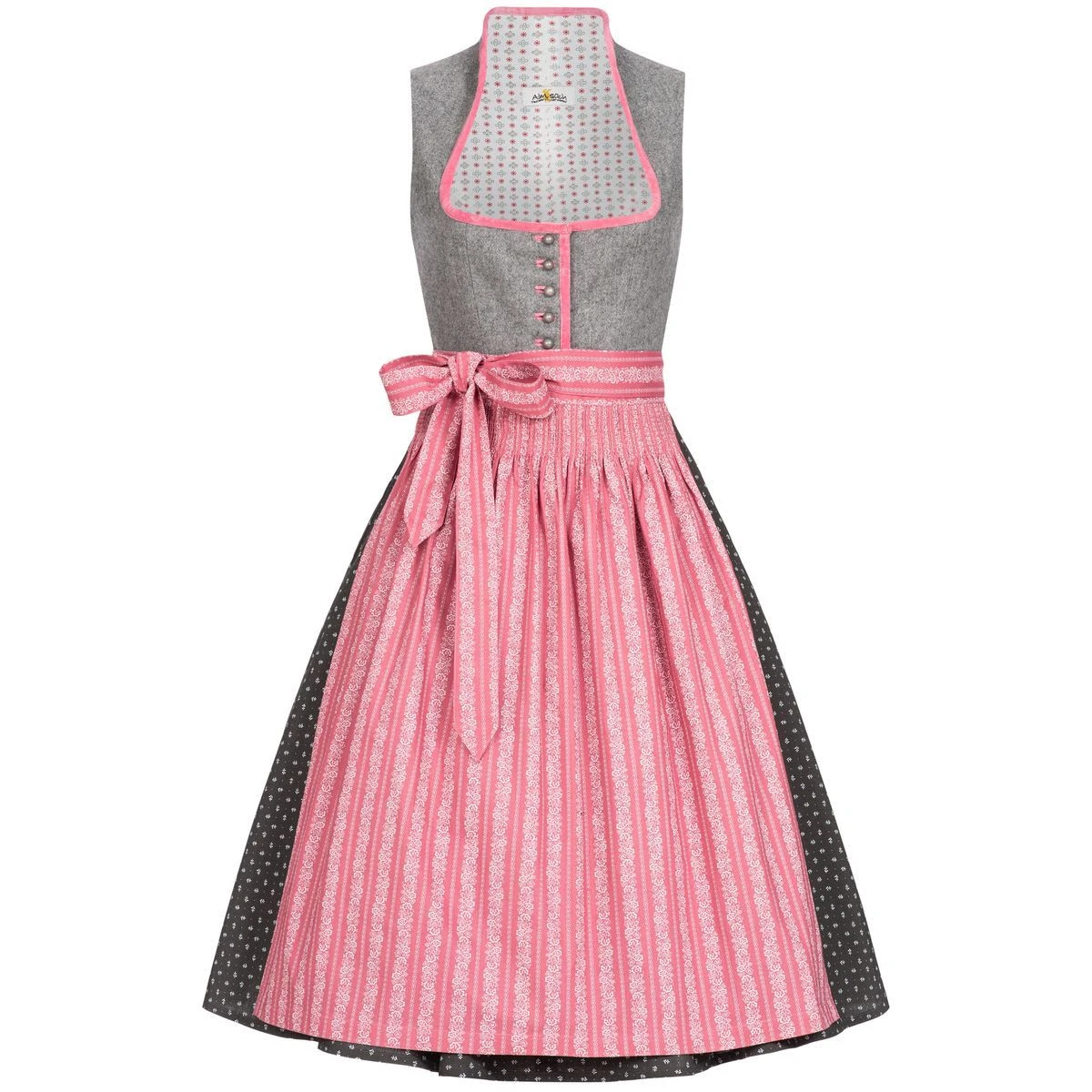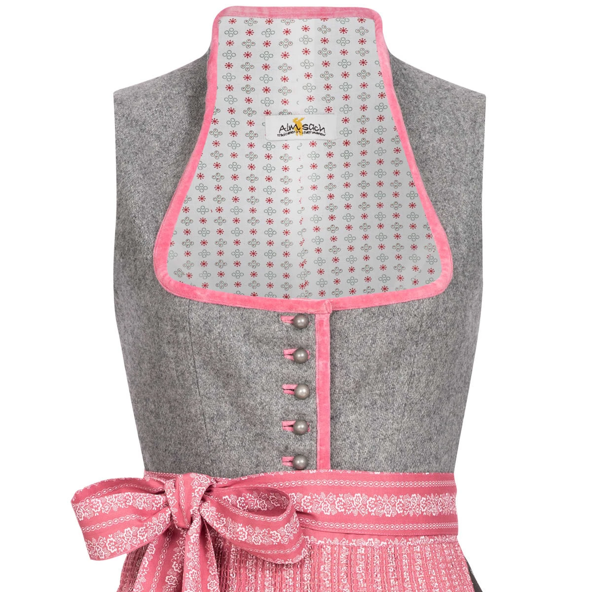 Ein schickes Midi Dirndl in Grau-Altrosa von Almsach. Das Mieder des Dirndls ist aus reiner Wolle gefertigt worden. Zudem befindet sich innen nochmals ein Stofffutter, das für ein angenehmes Tragegefühl sorgt. Das Dekolleté und der gesamte Kragen sind mit einem samtenen Saum in der kräftigen Farbe Altrosa ausgestattet. Dieses Dirndl ist mit schlichten Knöpfen versehen, mit diesen wird das Dirndl ganz einfach verschlossen. Zudem zieht sich die Samtborte weiter bis zum Ende der Knopfleiste. Der Trachtenrock ist ebenfalls in Grau gehalten, jedoch mit einem weißen Blütenprint versehen und misst eine Länge von 70 cm. Eine praktische Einschubtasche auf der rechten Seite ist vorhanden. Die Schürze zeigt sich ebenfalls in Altrosa passend zu den Borten, mit eleganten floralen Ranken in Weiß.