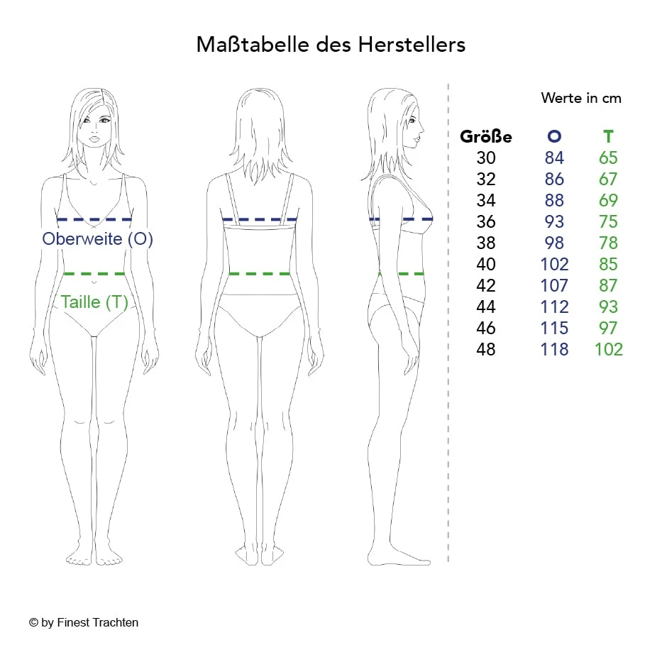 Hinweis zur Abbildung: Sofern nicht anders beschrieben, werden unsere Dirndl ohne Dirndlbluse geliefert. Dirndl und Bluse können Sie bei uns in verschiedenen Größen bestellen, so passt die Tracht perfekt. Unser Tipp: Variieren Sie z. B. zwischen weißen und schwarzen Dirndlblusen, viele unserer Dirndl können mit beiden Farben und verschiedenen Dirndlblusen (z. B. Langarmbluse, Kurzarmbluse) getragen werden. Zudem können fast alle unsere Dirndl für kleines Geld (ca. 15 Euro) beim Schneider angepasst werden wenn es einmal nicht passt. So wird ein wunderschönes Dirndl zu Ihrem perfekt sitzenden Dirndl Unikat!
