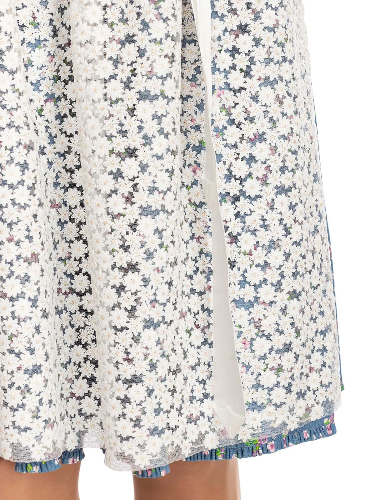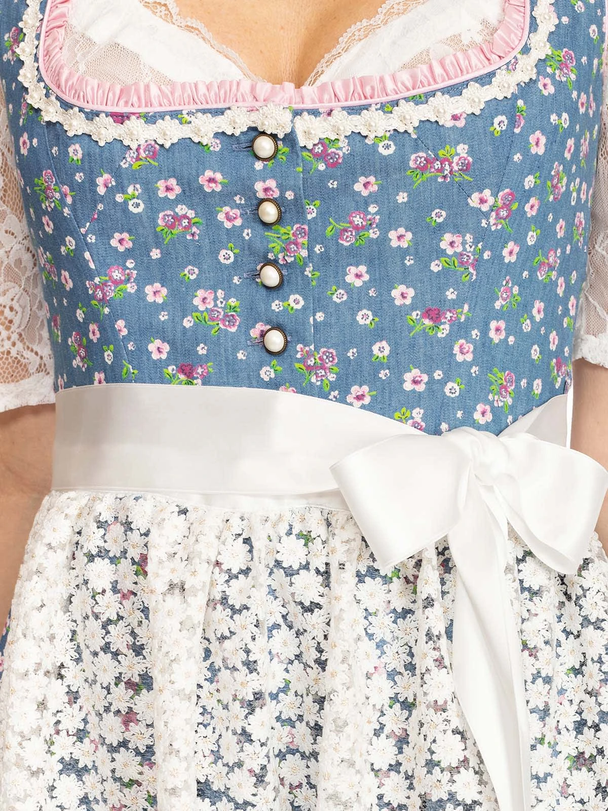 Zweiteiliges Midi-Dirndl Uta in frischem Blau. 60 Zentimeter lang ist dieses frühlingshaft-sommerliche Dirndl der Marke Alpenfee. Der himmelblaue Oberstoff aus Baumwolle ist mit einem niedlichen Blümchenmuster versehen. Das weit ausgeschnittene Mieder verfügt über einen attraktiven Knopfverschluss. Das Besondere an dem Dirndl ist die transparente Schürze, die sich aus vielen aneinandergereihten weißen Blüten zusammensetzt. Dieses frisch-fröhliche Modell eignet sich für Ausflüge, traditionelle Feste und Umzüge sowie für berufliche Anlässe.•Hinweis: Angebot ohne Dirndlbluse. •Dieses Dirndl fällt größengerecht aus. •Oberstoff und Rock 100% Baumwolle, Futter 50% Baumwolle 50% Polyester, Schürze 77% Polyester 15% Pol •Rocklänge ca. 60cm •Chemische Reinigung
