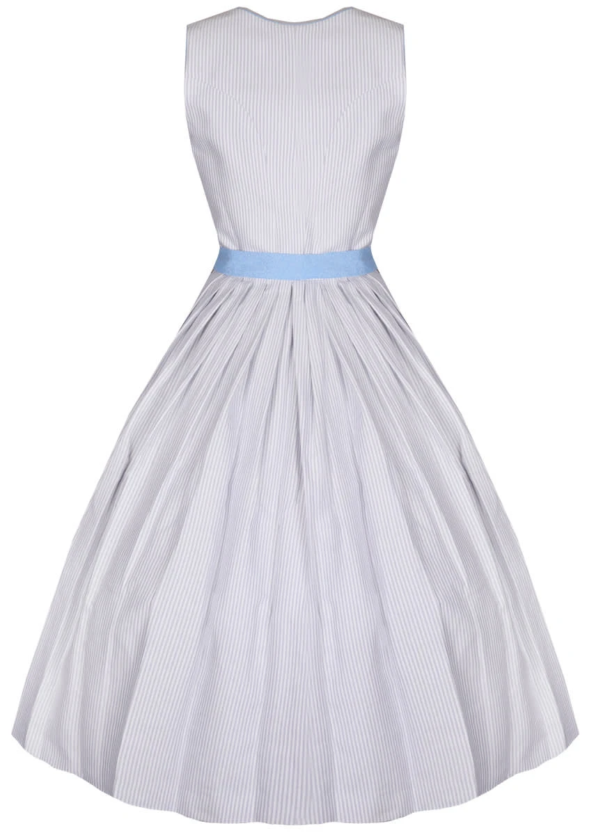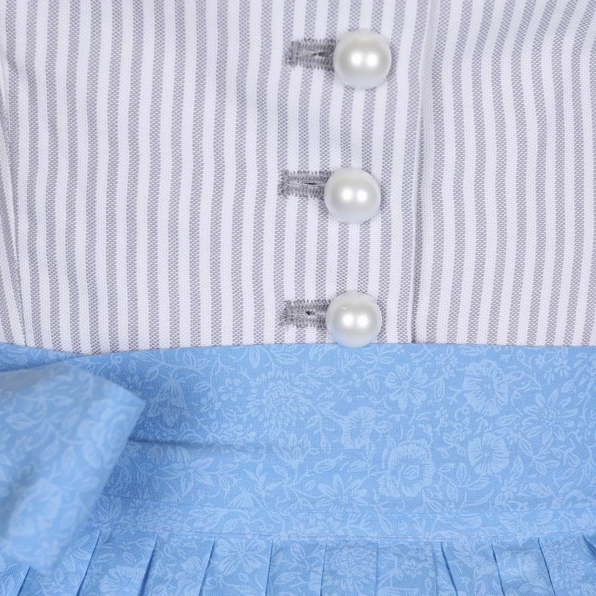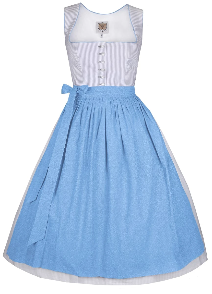Ein wunderschönes Midi Dirndl Chrissi in Grau von Apple of my Eye. Das schlichte Dirndl wurde aus einem grau/weiß gestreiften Stoff gefertigt. Der Kragen, sowie der Balkonett Ausschnitt zieren sich mit einer Paspelierung, die aus demselben Stoff, wie die Schürze besteht. Dies sorgt für ein bezauberndes Gesamtbild. Die blaue Schürze wurde mit einem dezenten, floralem Muster geschmückt. Das Dirndl wird mit Knöpfen aus Perlenoptik auf der Vorderseite verschlossen. Der Dirndlrock hat eine Länge von 70 cm und zwei praktische Einschubtaschen.