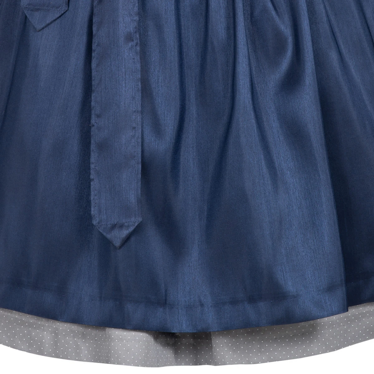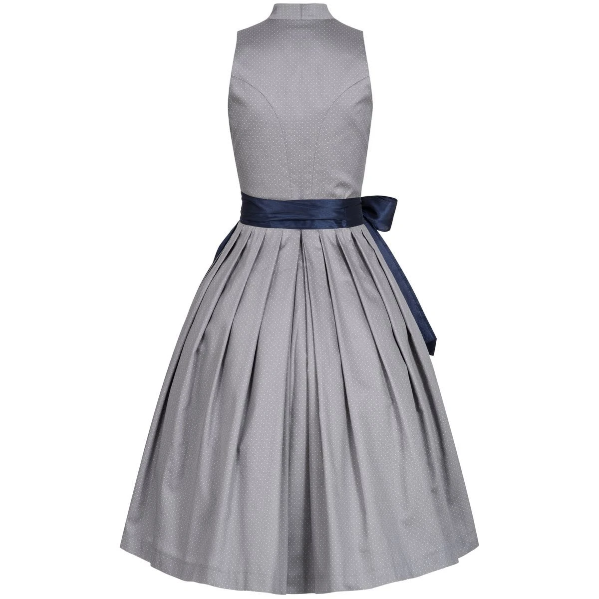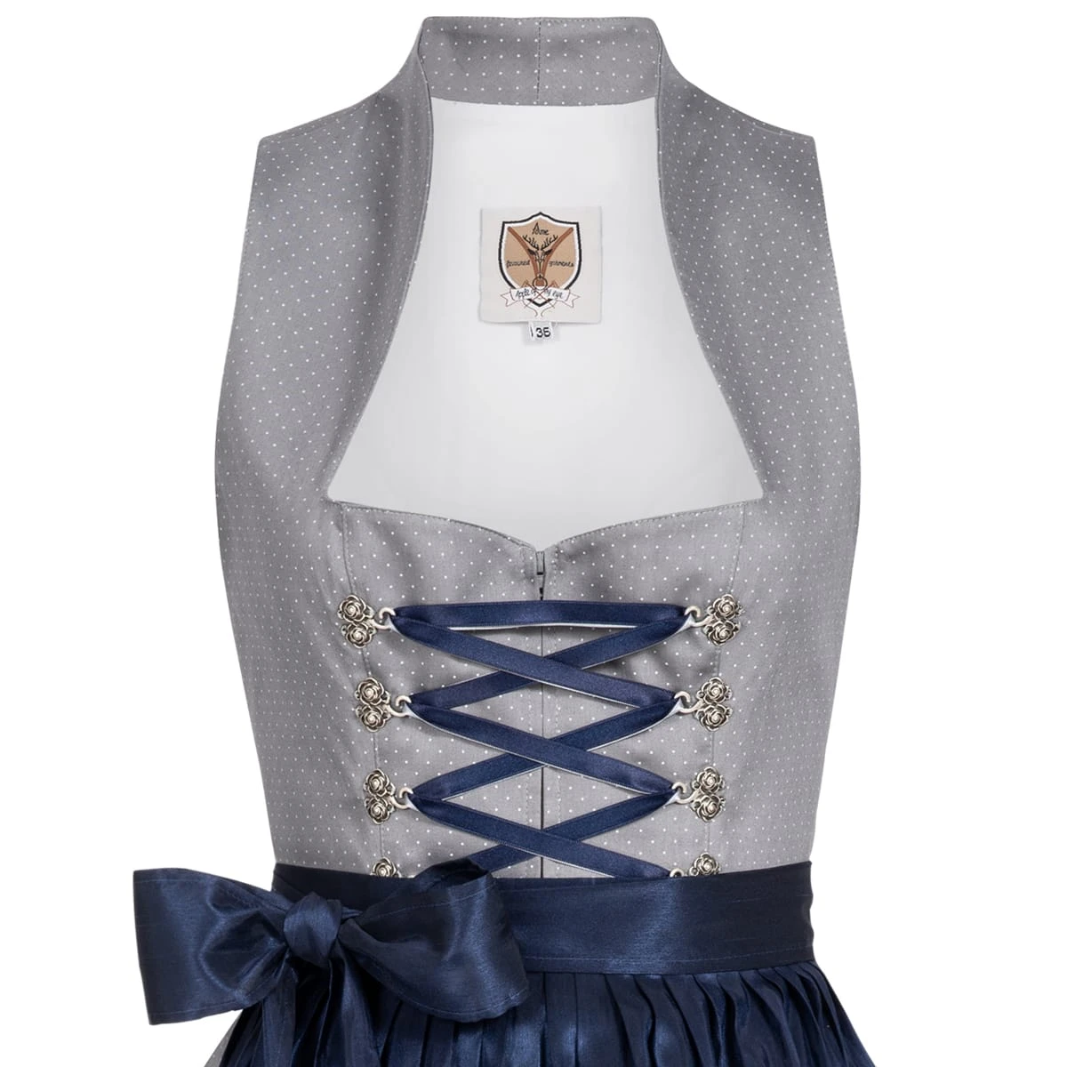 Ein außergewöhnliches Midi Dirndl Lisbeth in Grau mit Stehkragen von Apple of my Eye. Das Mieder hat einen leicht herzförmigen Ausschnitt und verfügt über einen eleganten Stehkragen. Die Hakenschnürung mit dunkelblauen Satinband wird durch Blumen geführt. Die Trachtenschürze ist in einem dunkelblauen Ton, passend zu dem Satinband und misst eine Länge von ca. 70 cm. Das Trachtenkleid ist in einem grauen Stoff mit weißen Punkten. Zur Variation wird gleich ein zweites, zum Dirndlkleid passendes Satinband mitgeliefert. Somit können sie ganz nach Ihren wünschen das mitgelieferte Satinbad zu dem dunkelblauen hinzufügen oder es ganz austauschen. Das Dirndl gibt es außerdem mit verschiedenen Farben des Dirndlkleides, aber edel und elegant ist Lisbeth allemal schon so, wie Sie bei Ihnen zu Hause ankommt.Hinweis zur Abbildung: Sofern nicht anders beschrieben, werden unsere Dirndl ohne Dirndlbluse geliefert. Dirndl und Bluse können Sie bei uns in verschiedenen Größen bestellen, so passt die Tracht perfekt. Unser Tipp: Variieren Sie z. B. zwischen weißen und schwarzen Dirndlblusen, viele unserer Dirndl können mit beiden Farben und verschiedenen Dirndlblusen (z. B. Langarmbluse, Kurzarmbluse) getragen werden. Zudem können fast alle unsere Dirndl für kleines Geld (ca. 15 Euro) beim Schneider angepasst werden wenn es einmal nicht passt. So wird ein wunderschönes Dirndl zu Ihrem perfekt sitzenden Dirndl Unikat!