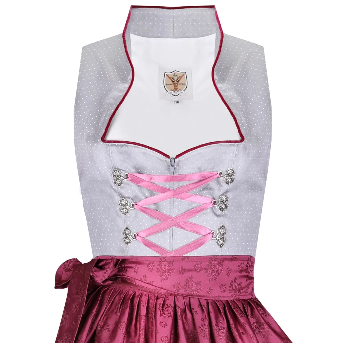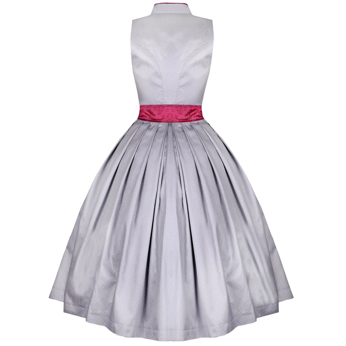 Ein bezauberndes Midi Dirndl Laura in Grau mit Stehkragen von Apple of my Eye. Das Mieder hat einen leicht herzförmigen Ausschnitt und verfügt über einen eleganten Stehkragen. Die Hakenschnürung mit Satinband wird durch Blumen geführt. Die Trachtenschürze ist in einem sommerlichen Ton, passend zu dem Satinband und misst eine Länge von ca. 70 cm. Das Trachtenkleid ist in einem grauen Stoff mit weißen Punkten.