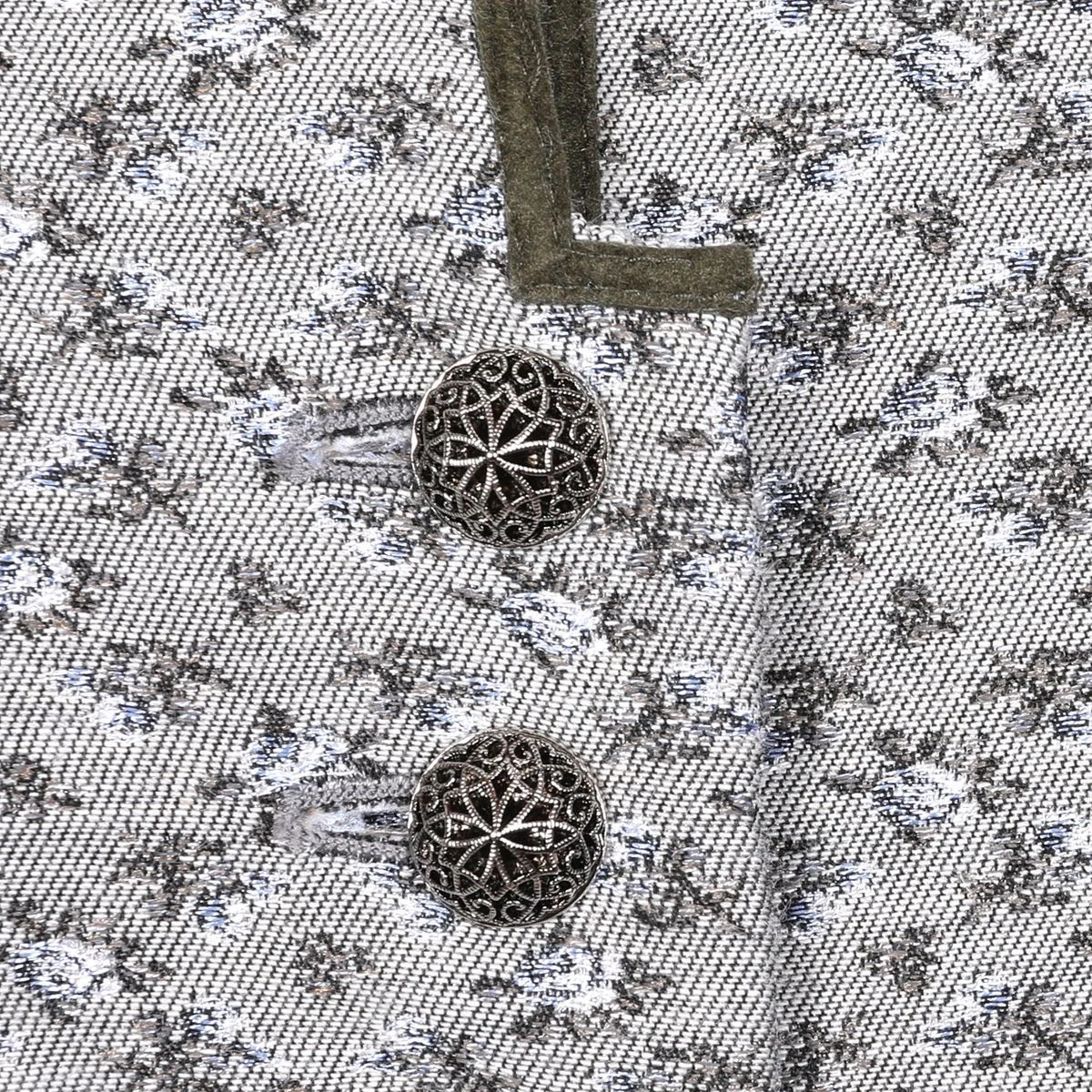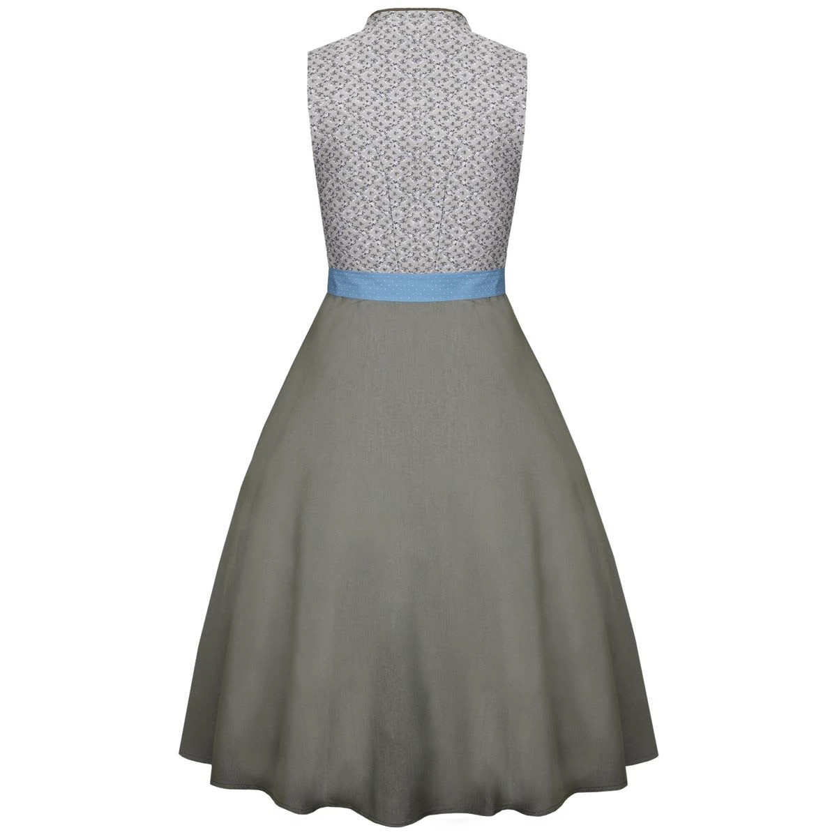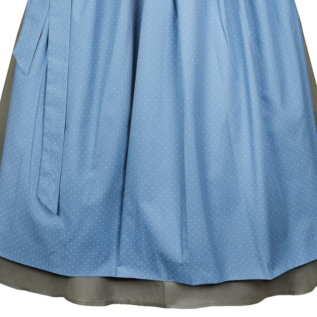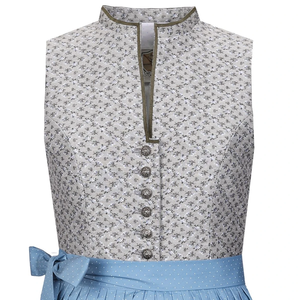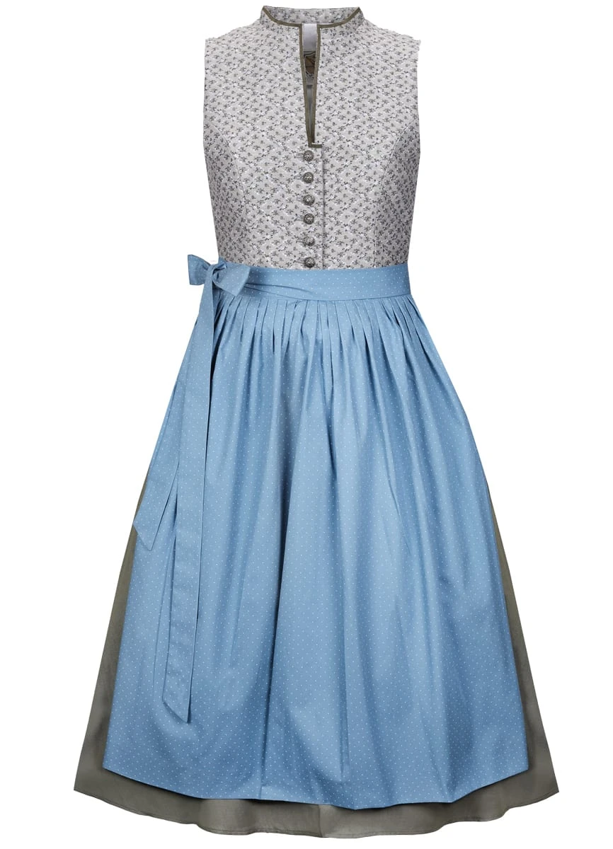 Ein bezauberndes Midi Dirndl Dorothea in Grau von Apple of my Eye. Das Mieder hat ein besonders schönes Muster im floralen Stil. Das hochgeschlossene Dirndl lässt sich bequem mit einer Knopfleiste auf der Vorderseite öffnen. Passend zum Dirndl ist die schöne Dirndlschürze in einem blauen Stoff mit weißen Punkten gefertigt worden und an der Taille zu binden. Der schlichte, dunkle Trachtenrock mit seinen praktischen Einschubtasche hat eine Länge von 70 Zentimetern.