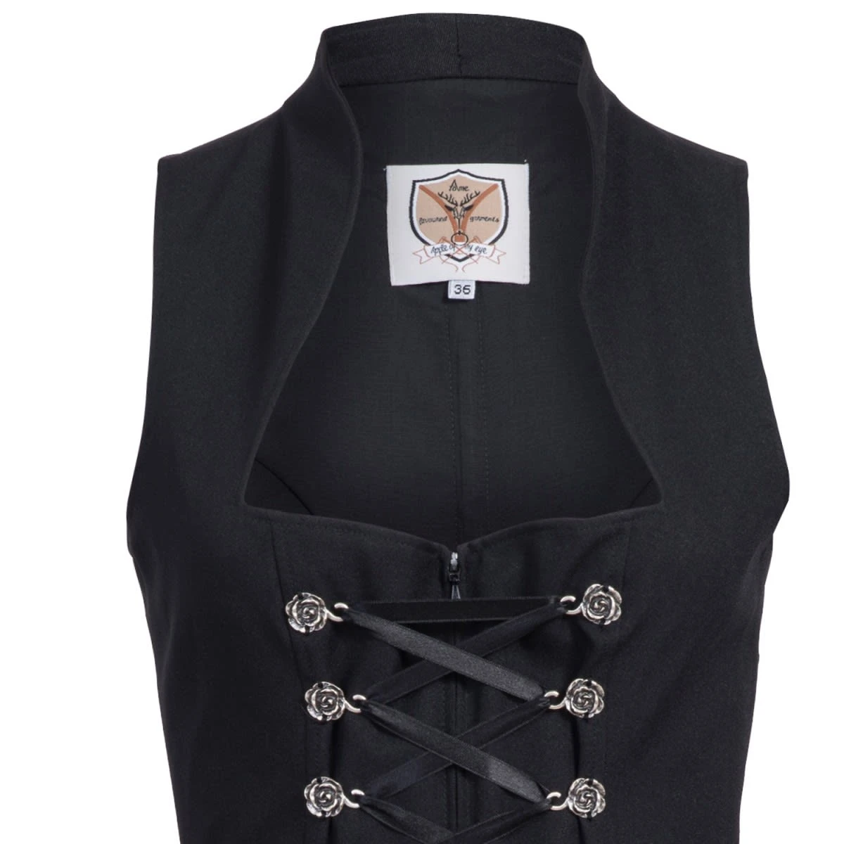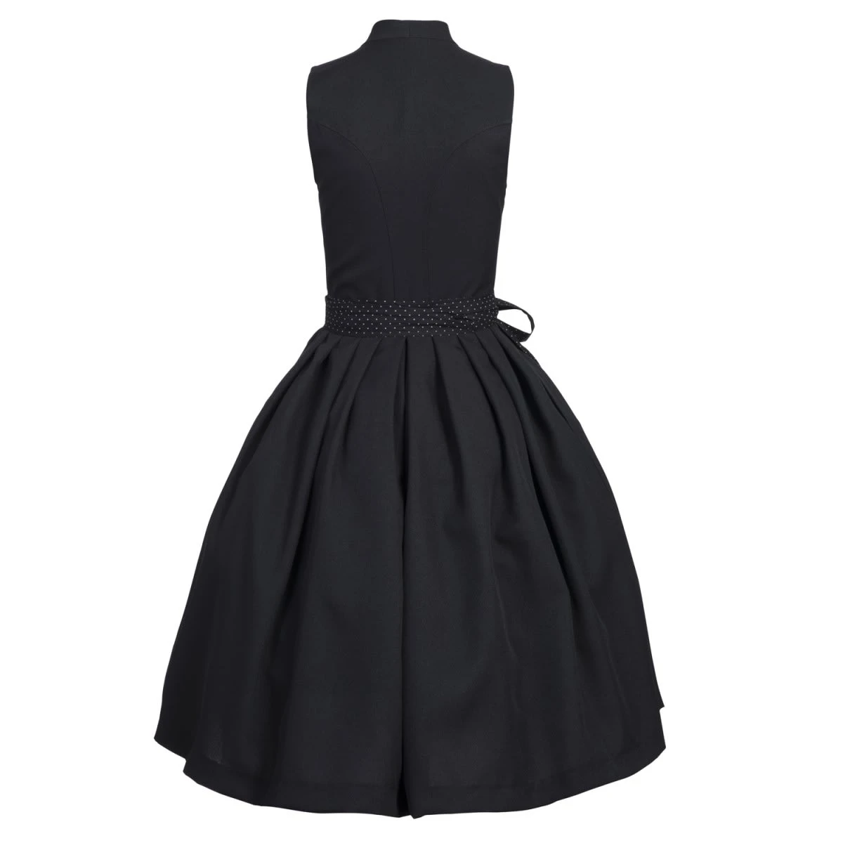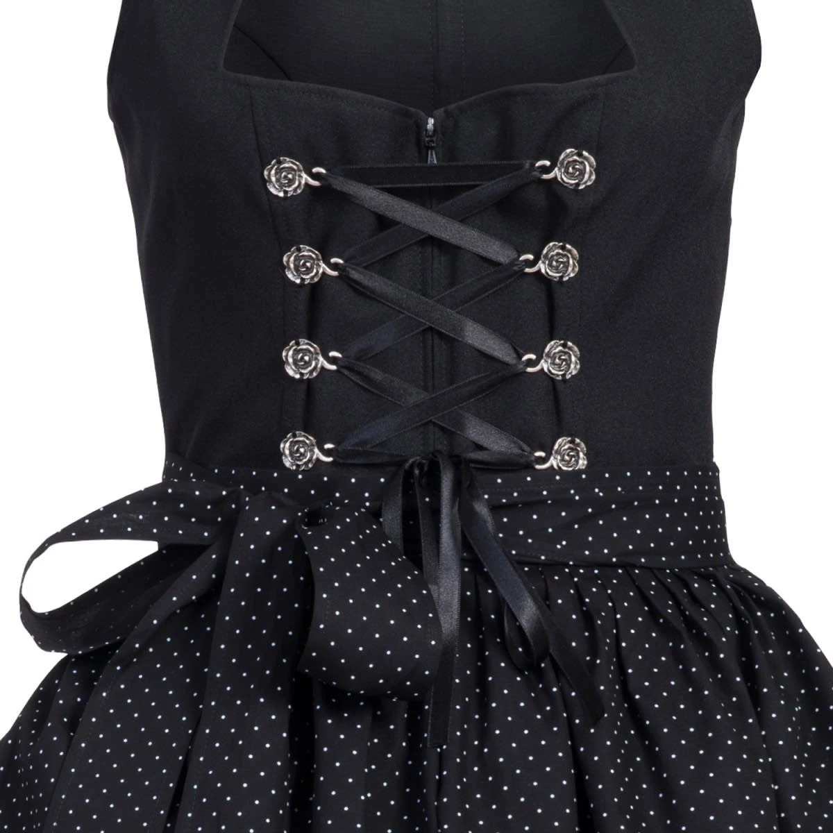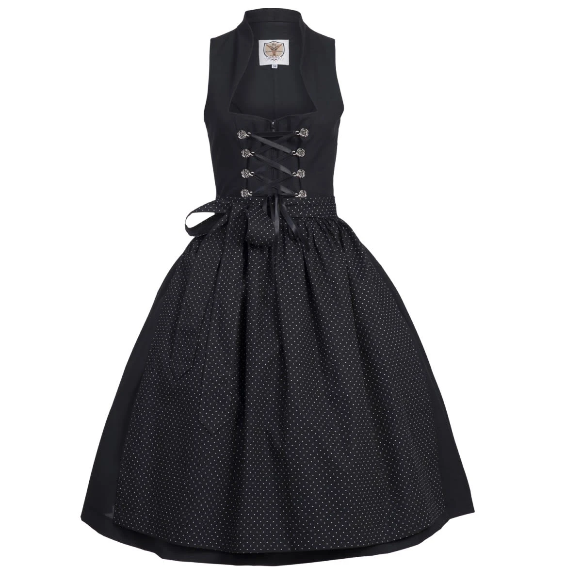 Ein wunderschönes midi Dirndl in Schwarz von Apple of my Eye. Das Mieder hat einen leicht herzförmigen Ausschnitt und die schwarze Hakenschnürung mit Satinband wird durch Blumen geführt. Das Trachtendirndl hat einen eleganten Stehkragen. Die Trachtenschürze ist in einem schwarzen Ton mit weißen Punkten gehalten. Der Rock hat eine Länge von 70 cm. Natürlich können Sie hier mit fast jeder Schürzenfarbe und einem farbigen Band (günstiges Satinband aus der Geschenkverpackungsabteilung) tolle Effekte erzielen. Hier sind Ihrer Kreativität keine Grenzen gesetzt! Aber edel und elegant ist Zenzi allemal schon so, wie Sie bei Ihnen zu Hause ankommt.Hinweis: Die Schlaufenbänder, mit denen die Dirndlschürze am Dirndl gehalten wird dienen lediglich der Aufbewahrung und dem Transport der Schürze. Sie können diese abtrennen und sollte die Schürze ohne deren Verwendung binden. So sind Sie mit der Dirndlschürze in der Höhe flexibel.Unser Tipp: Variieren Sie z. B. zwischen weißen und schwarzen Dirndlblusen, viele unserer Dirndl können mit beiden Farben und verschiedenen Dirndlblusen (z. B. Langarmbluse, Kurzarmbluse) getragen werden. Zudem können fast alle unsere Dirndl für kleines Geld (ca. 15 Euro) beim Schneider angepasst werden wenn es einmal nicht passt. So wird ein wunderschönes Dirndl zu Ihrem perfekt sitzenden Dirndl Unikat!Die Damen Dirndl in schwarz können unterschieden werden nach Balkonettausschnitt, den eckigen Balkonettausschnitt und den Herzausschnitt sowie den Unterbrustausschnitt und V-Ausshnitt. Bitte achten Sie darauf das wir auch die passenden Dirndblusen Dekoleéformen passend zu Ihrem neune schwarzen Dirndl haben. Sollten Sie ein schwarzes Dirndl kaufen mit Unterbrustschnitt, dann sollten Sie auch eine passende Dirndlbluse bestellen.