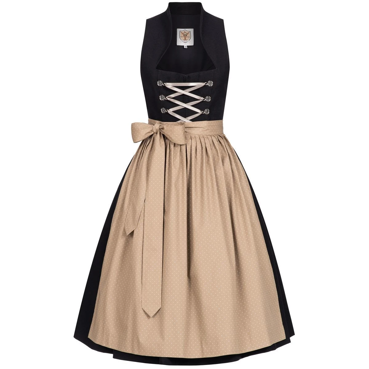Ein entzückendes Midi Dirndl Rosmarie in Schwarz-Beige von Apple of my Eye. Das Mieder hat einen leicht herzförmigen Ausschnitt und die Hackenschnürung mit Satinband wird durch Blumen geführt. Diese Schnürung überdeckt den Reißverschluss, mit dem das Dirndl verschloßen wird. Das Trachtendirndl hat einen eleganten Stehkragen. Die Schürze in Beige ist mit weißen Punkten versehen und wird an der Taille gebunden. Der Rock hat eine Länge von 70 cm und zwei praktische Einschubtaschen.