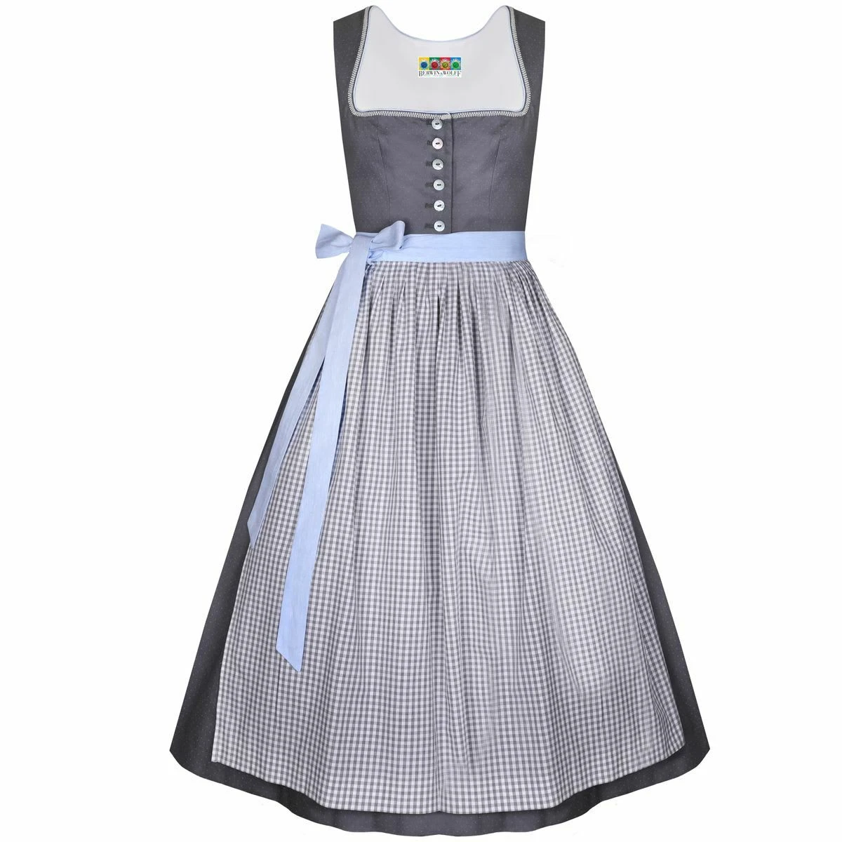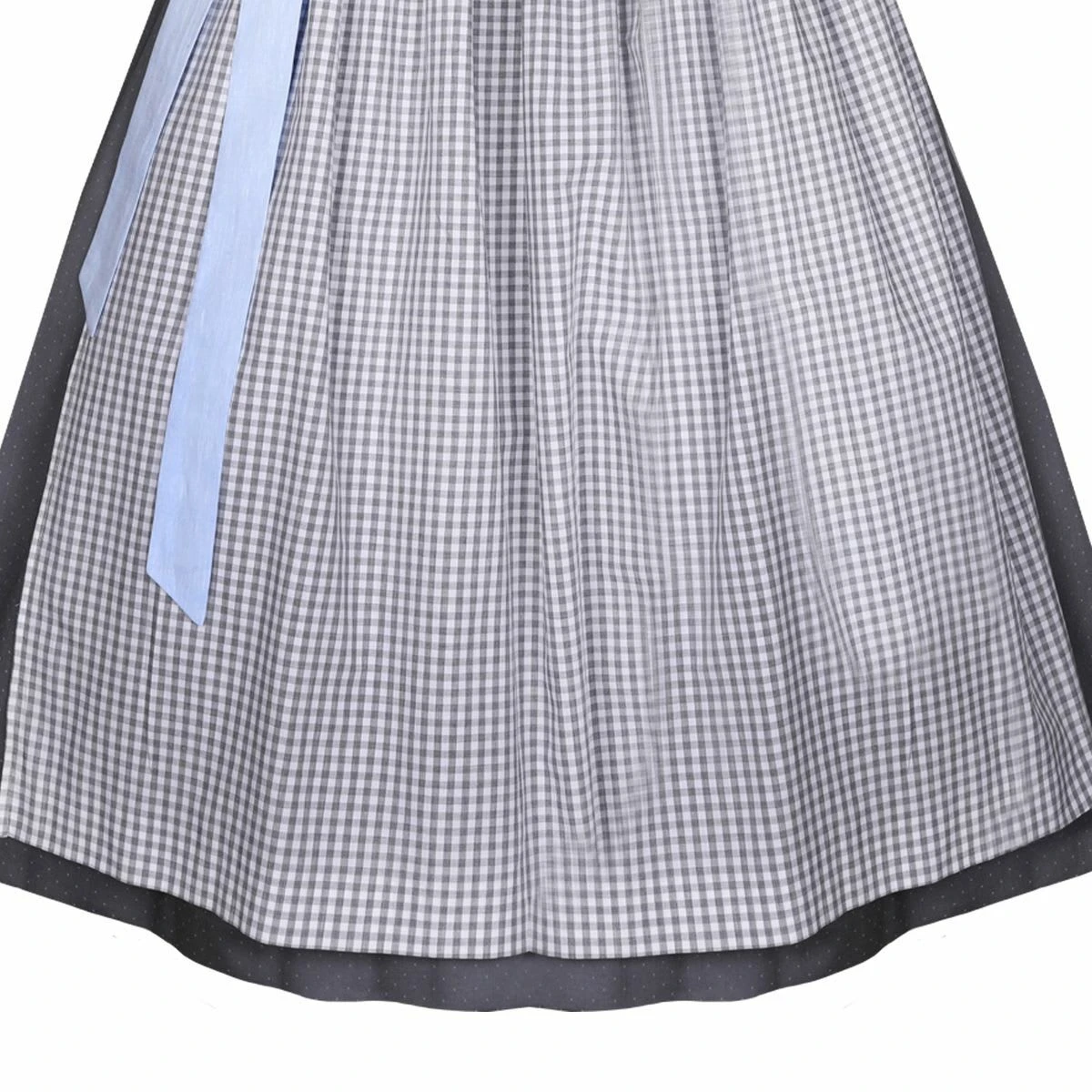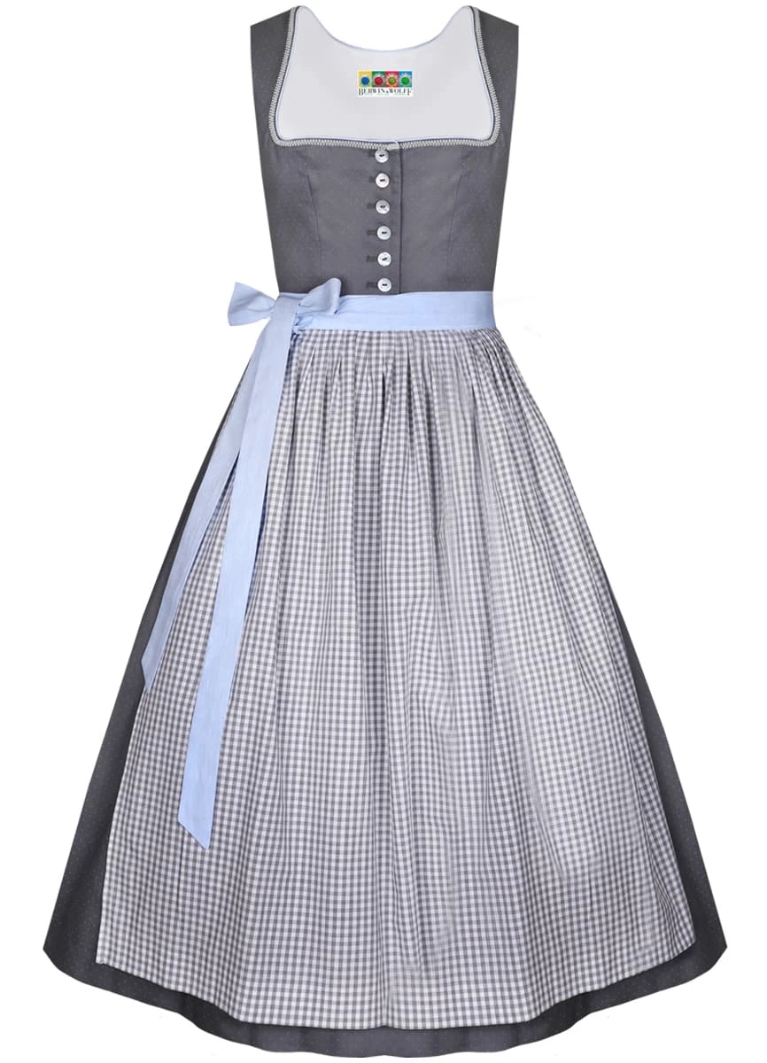 Ein hübsches Midi Dirndl Petra in Anthrazit von Berwin und Wolff. Das schlichte Drindlkleid schmückt sich mit hellgrauen Punkten. Der Balkonettausschnitt ziert sich mit einer hübschen Borte. Das Dirndl wird mit einer Knopfleiste auf der Vorderseite verschlossen. Die grau-karierte Schürze wird mit einem blauen Band an der Taille verschlossen. Der Dirndlrock misst eine Länge von 75cm und besitzt zwei praktische Einschubtaschen.