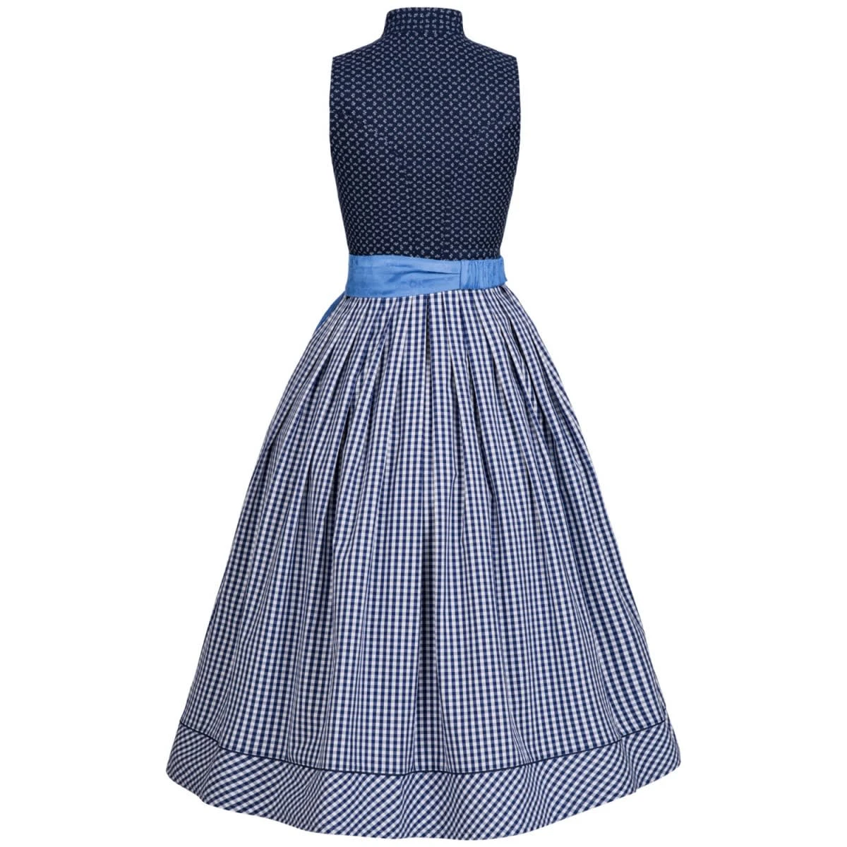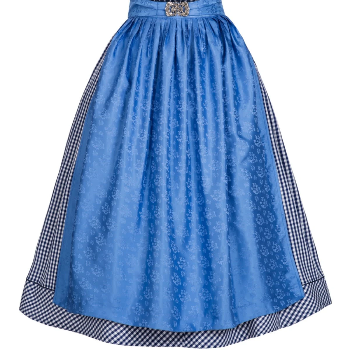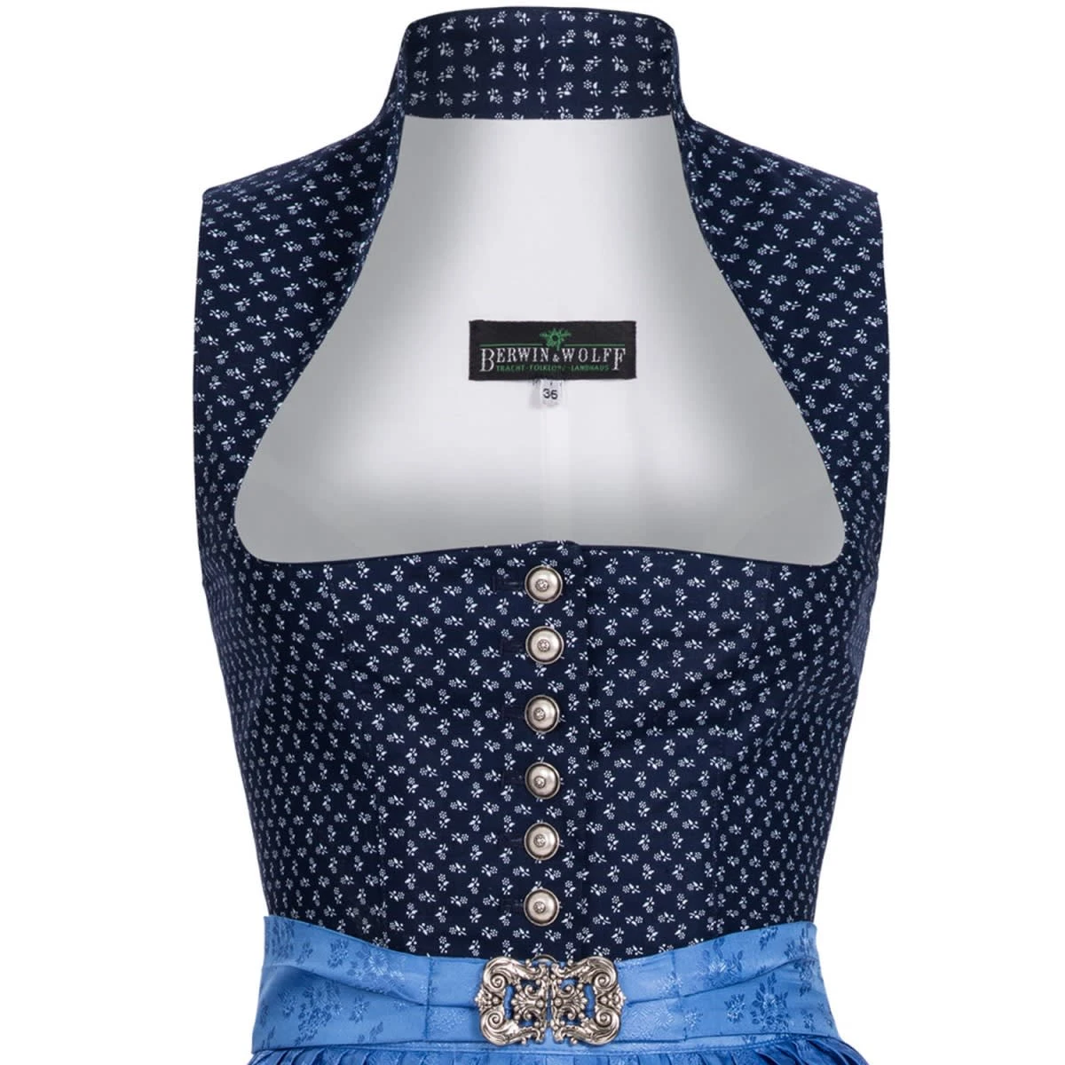 Ein exklusives midi Dirndl in feschem Blau von Berwin und Wolff. Das Dirndl hat einen eleganten Stehkragen, der sich zum Ausschnitt hin verbreitert und damit ein üppiges Dekolleté zaubert. Das blaue Mieder hat ein dezent, florales Muster in Weiß, wie auch die sehr hübsche Schürze in hellerem Blau, die ebenfalls ein florales Stickmuster zeigt. Der Dirndlrock ist 70 cm lang und präsentiert sich in einem marineblauen und weißem Karomuster. Das besondere Highlight ist bei diesem Dirndl die elegante Schließe für die Schürze, da diese Schürze nicht, wie üblich, gebunden wird. Hinweis: Die Schlaufenbänder, mit denen die Dirndlschürze am Dirndl gehalten wird dienen lediglich der Aufbewahrung und dem Transport der Schürze. Sie können diese abtrennen und sollte die Schürze ohne deren Verwendung binden. So sind Sie mit der Dirndlschürze in der Höhe flexibel.Unser Tipp: Variieren Sie z. B. zwischen weißen und schwarzen Dirndlblusen, viele unserer Dirndl können mit beiden Farben und verschiedenen Dirndlblusen (z. B. Langarmbluse, Kurzarmbluse) getragen werden. Zudem können fast alle unsere Dirndl für kleines Geld (ca. 15 Euro) beim Schneider angepasst werden wenn es einmal nicht passt. So wird ein wunderschönes Dirndl zu Ihrem perfekt sitzenden Dirndl Unikat!Die Damen Dirndl in blau können unterschieden werden nach Balkonettausschnitt, den eckigen Balkonettausschnitt und den Herzausschnitt sowie den Unterbrustausschnitt und V-Ausshnitt. Wir haben die passenden Dirndblusen Dekoleéformen passend zu Ihrem neuen blauen Dirndl zum Oktoberfest haben. Sollten Sie ein blaues Dirndl kaufen mit Unterbrustschnitt, dann sollten Sie auch eine passende Dirndlbluse bestellen.Ein blaues Dirndl welches keine 100 Euro kostet ist perse kein schlechtes Dirndl. Wir achten auf Marken und Qualität beim Einkaukfen und können Ihnen die Berwin und Wolff Dirndl nur empfehlen.