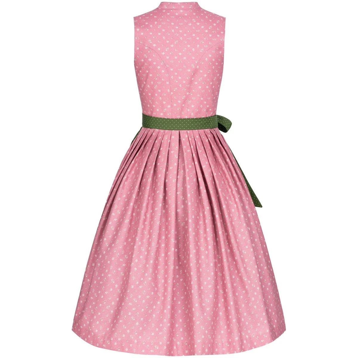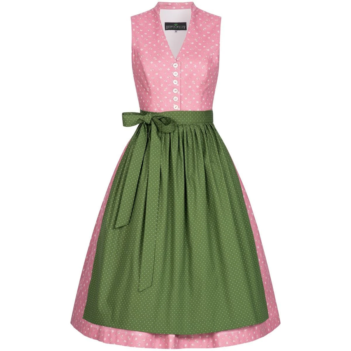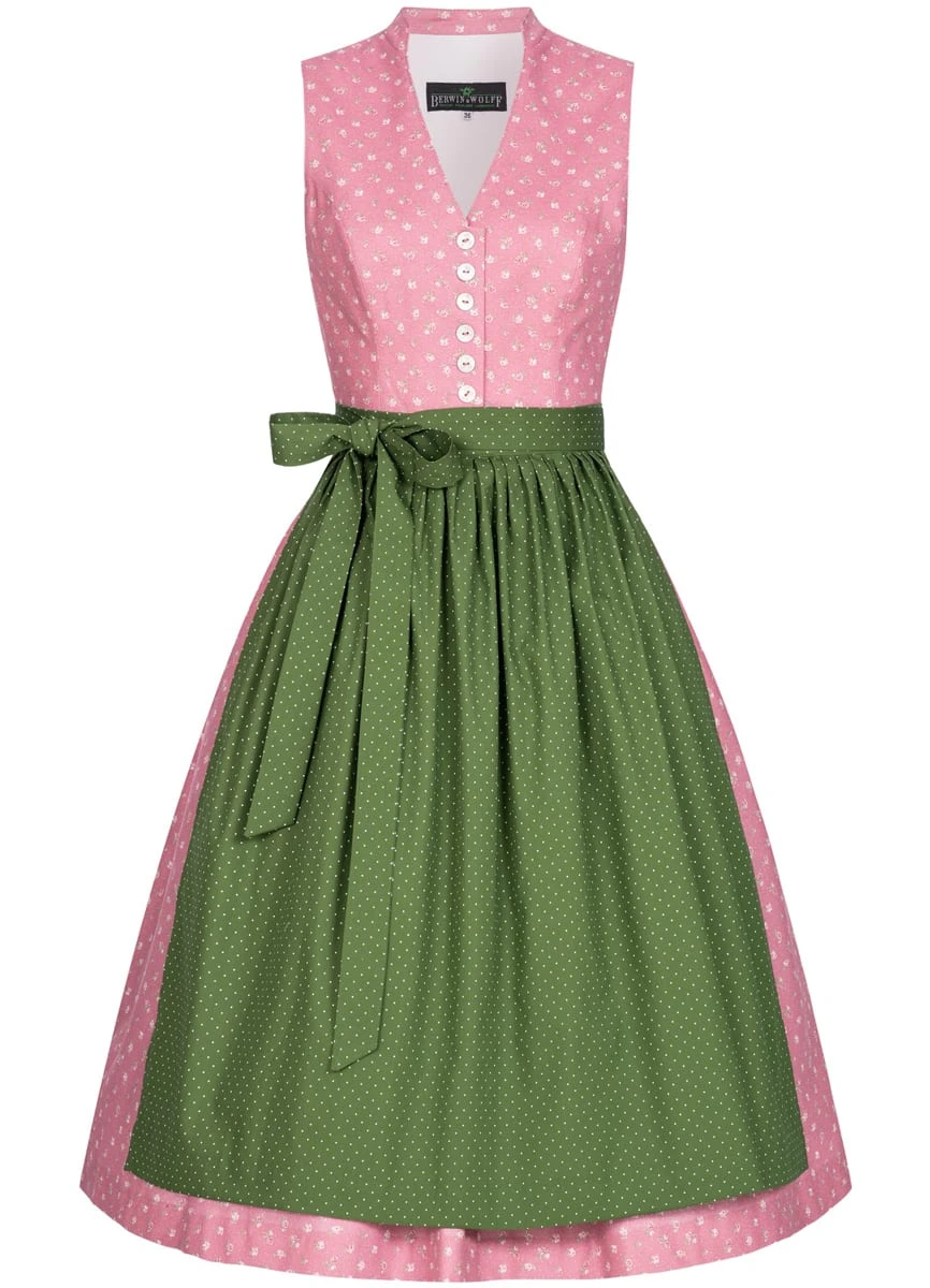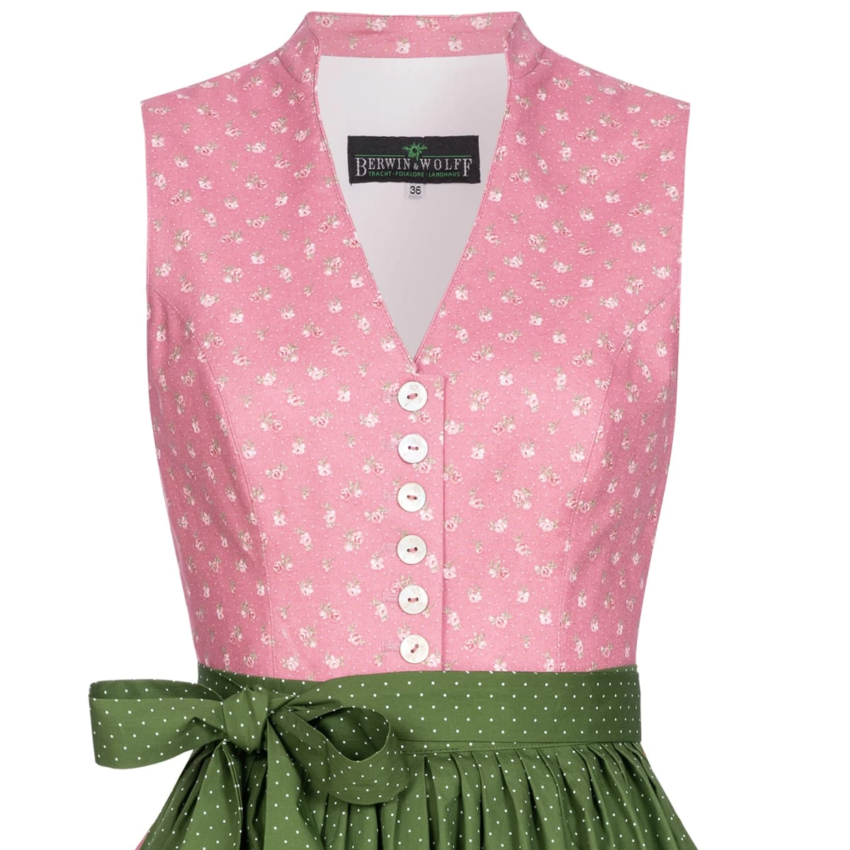 Ein hübsches Midi Dirndl in Rosa von Berwin und Wolff. Das Dirndl hat einen eleganten Stehkragen, der Ausschnitt geht zu einem V-Ausschnitt über. Das komplette rosa Dirndlkleid schmückt sich mit einem schönen floralem Muster. Die grüne Schürze mit weißen Punkten ist ein toller Kontrast. Das Dirndl wir mit einer schlichten Knopfleiste auf der Vorderseite verschlossen. Der Dirndlrock hat eine Länge von 70cm und besitzt zwei praktische Einschubtaschen.