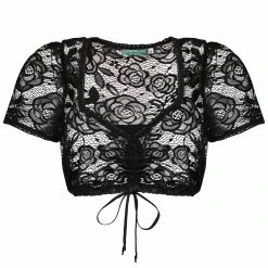 Hübsche Dirndlbluse Marianne in Schwarz von der Firma Country Line. Die Dirndlbluse mit Herzausschnitt, der durch ein Gummiband individuell getragen werden kann, besitzt kurze Ärmel. Die schwarze Bluse zeigt sich in einer groben Spitze aus Rosen. Die untere Hälfte der Rückseite besteht aus blickdichter Baumwolle und sorgt somit für einen angenehmen Tragekomfort. Bezaubernde Dirndlbluse für wärmere Tage.