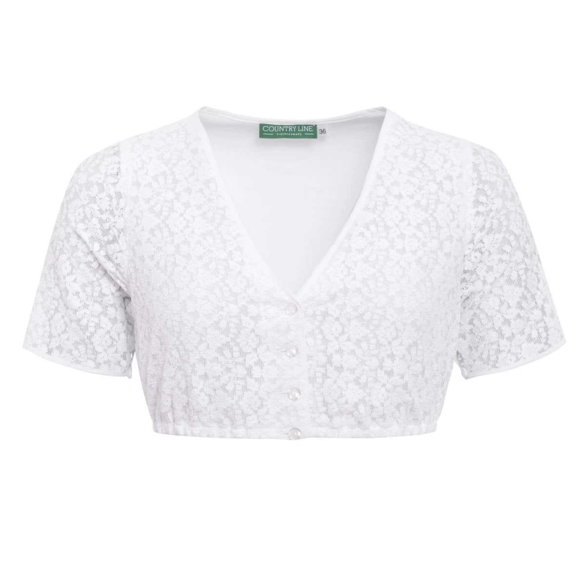 Wunderschöne Dirndlbluse Annalies in Weiß von der Firma Country Line. Die Dirndlbluse mit V-Ausschnitt ist in schlichter Spitze gehalten. Durch zusätzliches Futter ist die Bluse besonders angenehm, da Sie die Spitze im Dekolleté nicht direkt auf der Haut tragen. Die Dirndlbluse können Sie bequem mit Knöpfen öffnen.Zur Wiesn brauchen Sie die passende Dirndlbluse. Bitte achten Sie darauf das die Dirndlbluse zu Ihrem Dirndlausschnitt passt. An dieser Stelle können wir Ihnen folgende Dirndlblusen Hilfestellung geben: Es gibt den Balkonettausschnitt, den eckigen Balkonettausschnitt und den Herzausschnitt sowie den Unterbrustausschnitt und V-Ausshnitt. der tiefest Ausschnitt ist der Unterbrustausschnitt, bei diesem gewähren Sie den meisten Einblick. Im Anschluss kommt der Herzausschnitt, dieser ich leicht zu erkenne, da die Aschnittform wie ein Herz aussieht welches auf dem Kopf steht. Der Balkonettauschnitt ist am Dirndl sehr gut zu erkennen, weil der Ausschnitte gerade von links nach rechts verläuft. Der eckige Balkonett-Auschnitt am Dirndl als auch der Dirndlbluse ist ein 90 Grad Winkel. Der Stehkragen oder auch Schalkragen (Schneewittchenkragen) orientiert sich nur am Kragen. Und passt auch nur zu den Dirndln die ebenfalls einen Stehtkragen haben. Der V-Asuschnitt ist die eleganteste Variante an einer Dirndlbluse. Außerdem sollten Sie darauf achten welche Armlänge ihre Dirndbluse haben sollte. Ein langarm Dirndbluse kann bei kühlerem Wetter sehr warm sein und edel sieht die Dirndbluse auch noch aus. Für ein schönes Dekoltee mit der Dirndlbluse sollten Sie sich eventuell auch einen DirndBH zulegen. Wir können Ihnen den Dirndl Push-UP BH in Weiß von My Choice empfehlen. Dieses Modell ist ein Wundermittel für Ihre Dirndlbluse mit Dirndl. Bei großer BH Größe und ohne Push Wirkung haben wir seit Jahren sehr gute Erfahrung mit dem Modell Hammerschmid Dirndl BH in weiß oder Hammerschmid Dirndl BH Annemarie in weiß. Unsere BH´s sind eine reine Empfehlung.