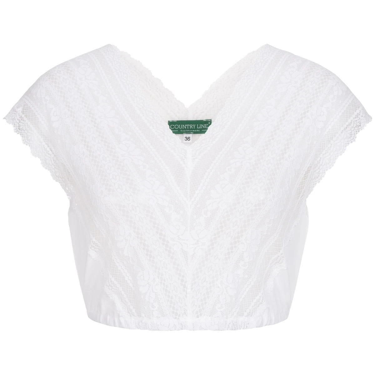 Eine wunderschöne Dirndlbluse Svenja in Weiß von Country Line. Die Dirndlbluse wurde zum größten Teil aus hübscher Spitze gefertigt. Der reizende V-Ausschnitt, spiegelt sich ebenfalls am Rücken und sorgt somit für Eleganz. Am Bund befindet sich ein eingenähtes Gummiband und kann dadurch flexibel an- und ausgezogen werden. Die Bluse besitzt keine Ärmel – dies ist total angesagt!