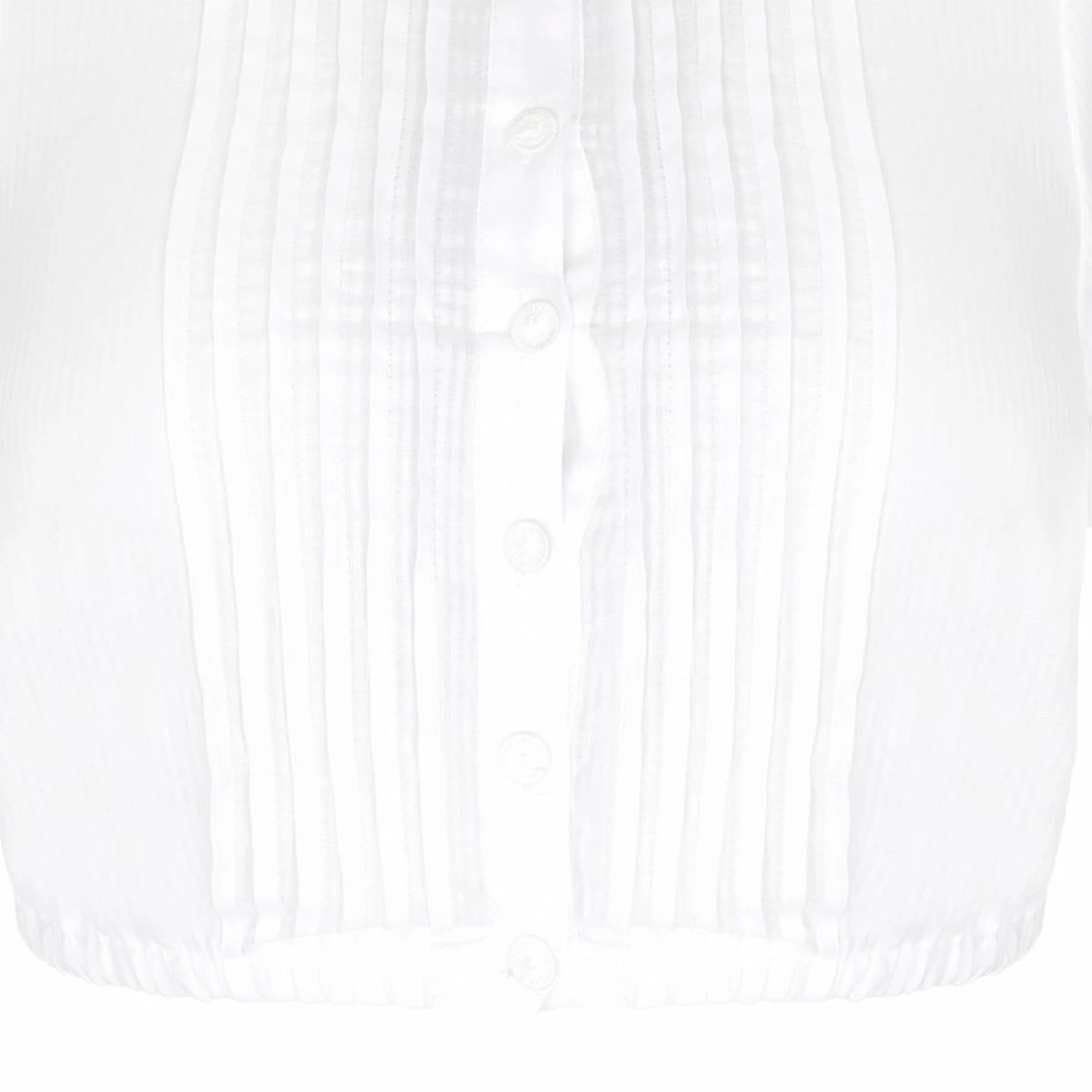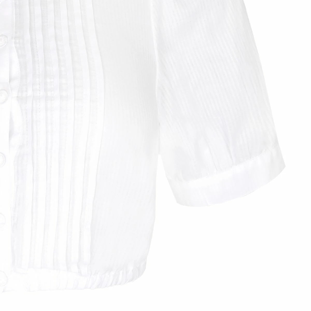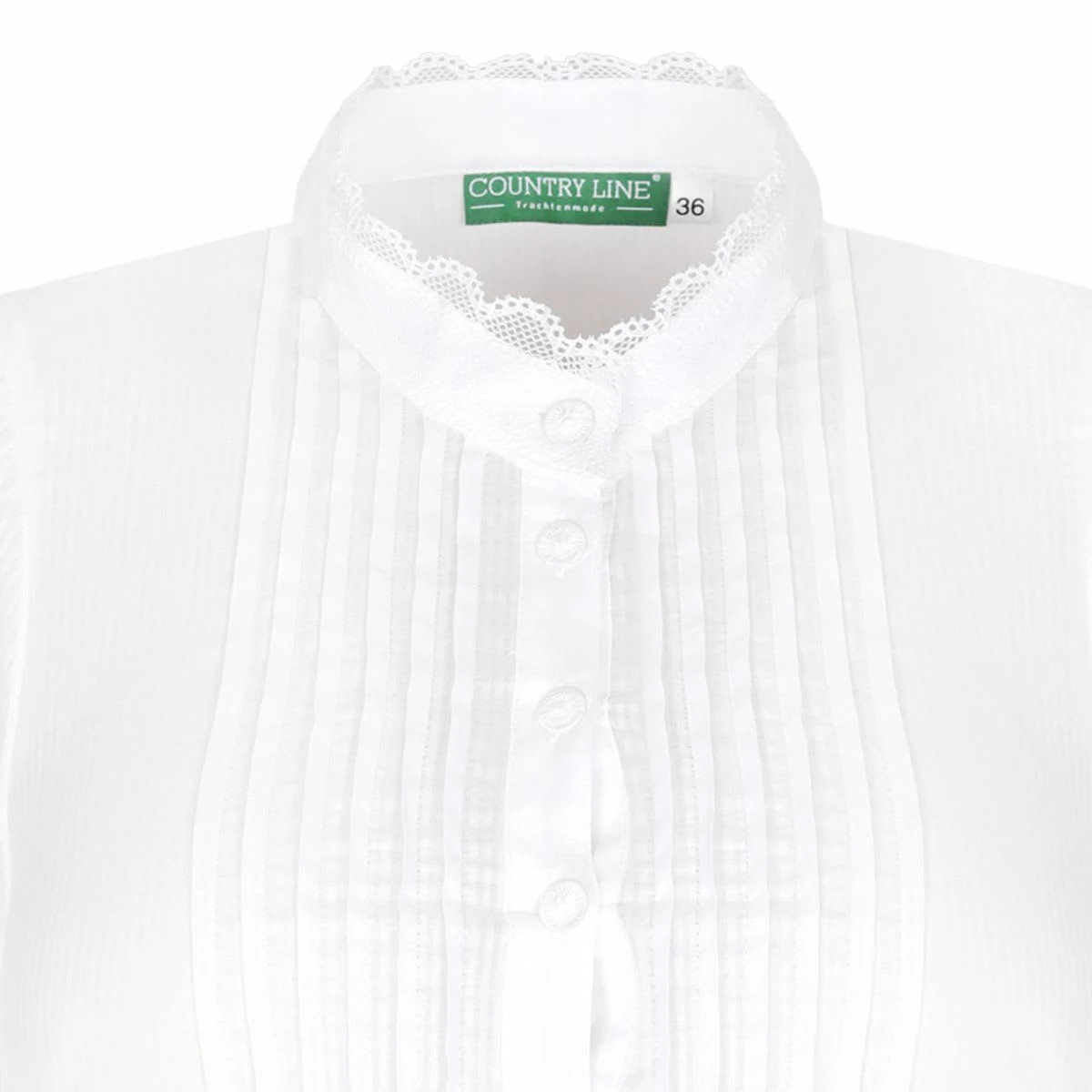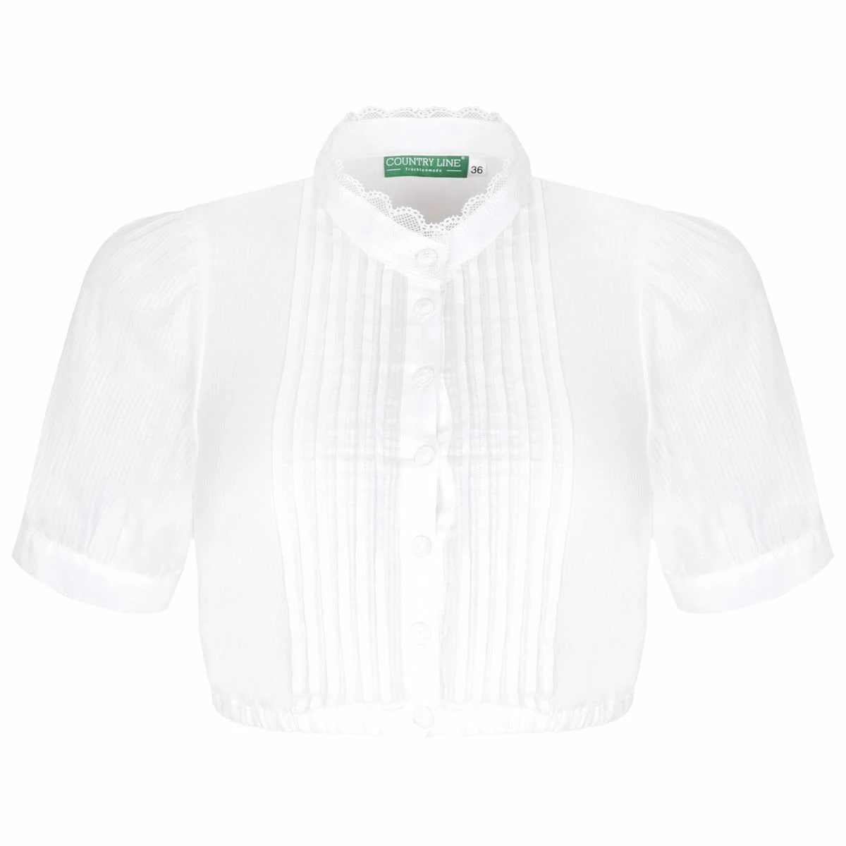 Traditionelle Dirndlbluse Ulrike in Weiß von der Firma Country Line. Die Dirndlbluse wird mit einer schlichten Knopfleiste bis zum Hals verschlossen. Der Stehkragen wurde mit hübscher Spitze geschmückt. An den kurzen Ärmeln befindet sich ein Dekoknopf. Auf der Vorderseite zeigt sich die Bluse mit Biesen. Die weiße Dirndlbluse besteht zu 100% aus Baumwolle und ist leicht transparent.