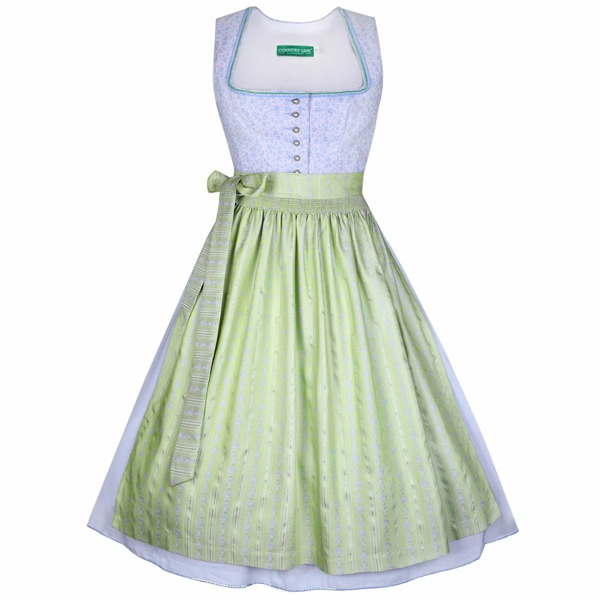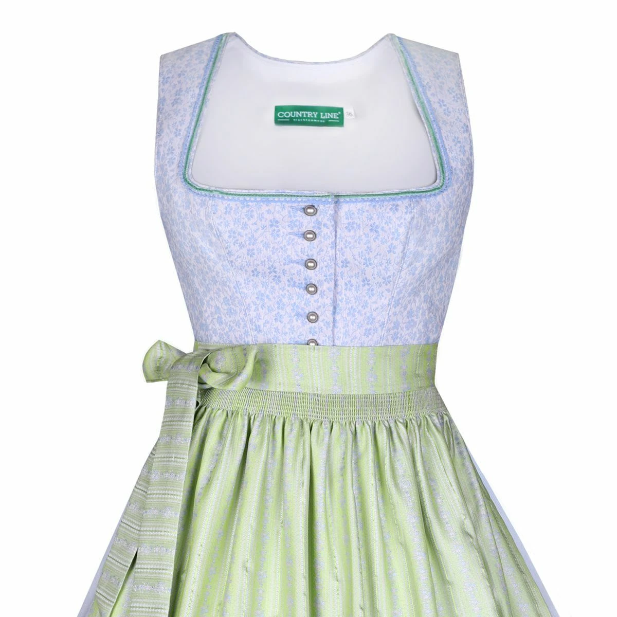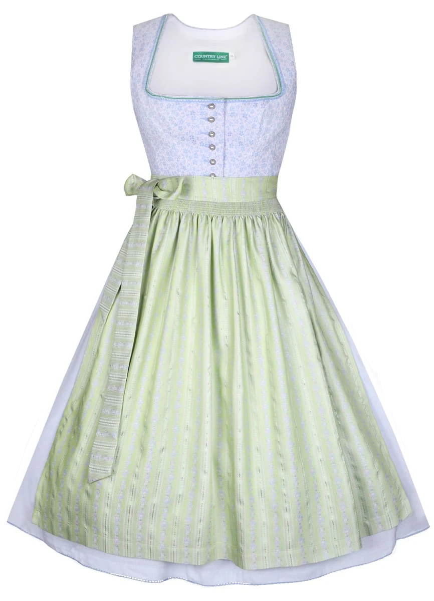 – Das Midi Dirndl von Country Line hat eine Länge von 70 cm. Das Dirndlkleid überzeugt durch die sommerliche Farbkombination. Die Schürze glitzert in der Sonne.