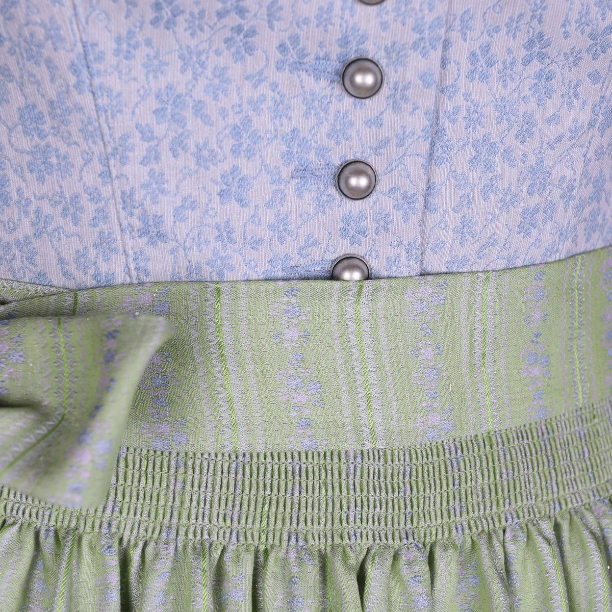 Tolles Midi Dirndl Petra in Hellblau von Country Line. Das Mieder hat ein besonders schönes Blumenmuster. Der Kragen, sowie der Balkonett Ausschnitt wurden mit einer schlichten Samt / Häkelborte verziert. Mit der Knopfleiste auf der Vorderseite wird das Dirndl geöffnet. Der Trachtenrock ist gestreift und die Häkelborte lässt sich am Saum wiederfinden. Die grüne Schürze ziert sich mit Blumenranken und wurde aus einem glitzernden Stoff gefertigt. Funkelt wunderschön in der Sonne. Der Rock hat 2 Einschubtaschen und eine Länge von 70 Zentimetern.