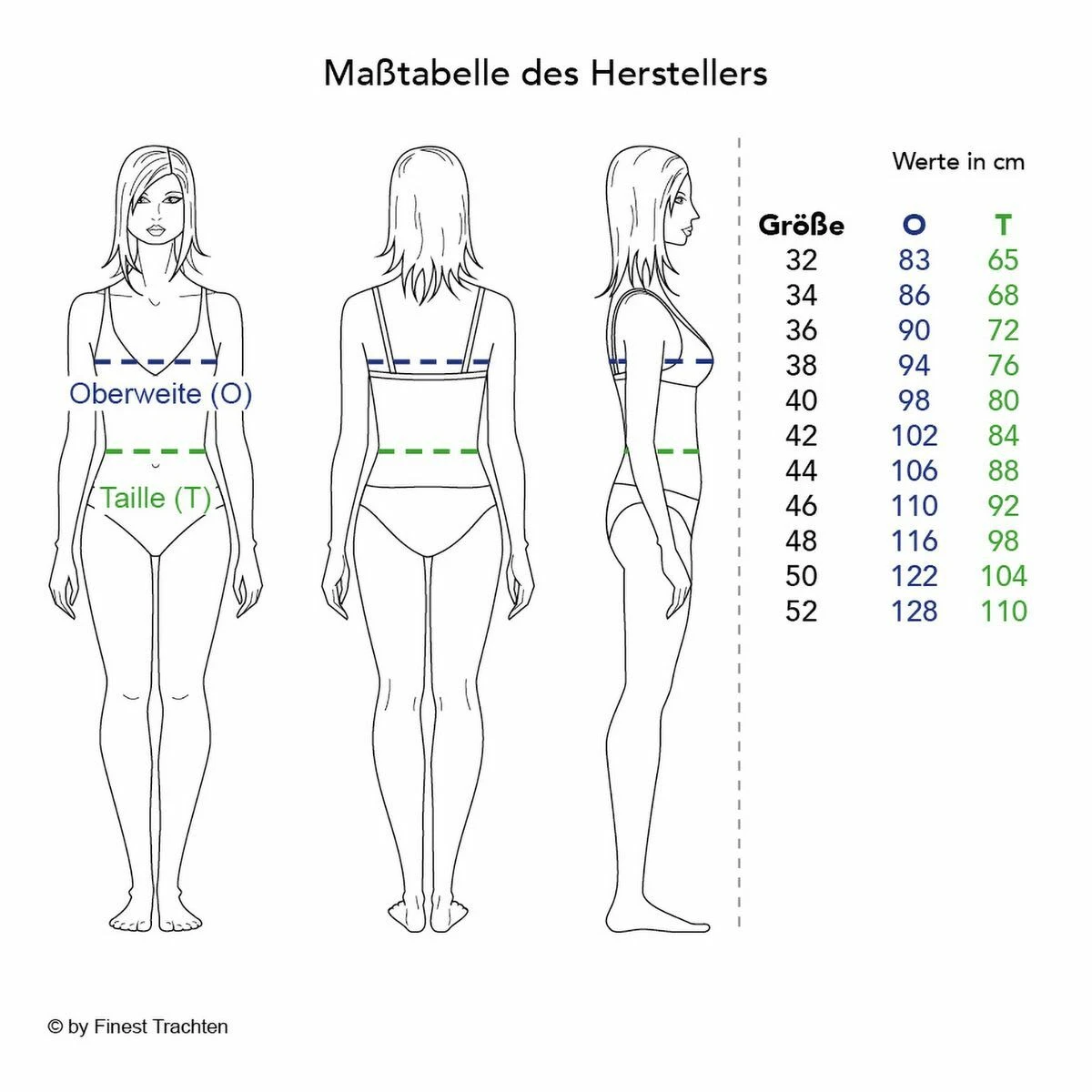 Hinweis zur Abbildung: Sofern nicht anders beschrieben, werden unsere Dirndl ohne Dirndlbluse geliefert. Dirndl und Bluse können Sie bei uns in verschiedenen Größen bestellen, so passt die Tracht perfekt. Unser Tipp: Variieren Sie z. B. zwischen weißen und schwarzen Dirndlblusen, viele unserer Dirndl können mit beiden Farben und verschiedenen Dirndlblusen (z. B. Langarmbluse, Kurzarmbluse) getragen werden. Zudem können fast alle unsere Dirndl für kleines Geld (ca. 15 Euro) beim Schneider angepasst werden wenn es einmal nicht passt. So wird ein wunderschönes Dirndl zu Ihrem perfekt sitzenden Dirndl Unikat!