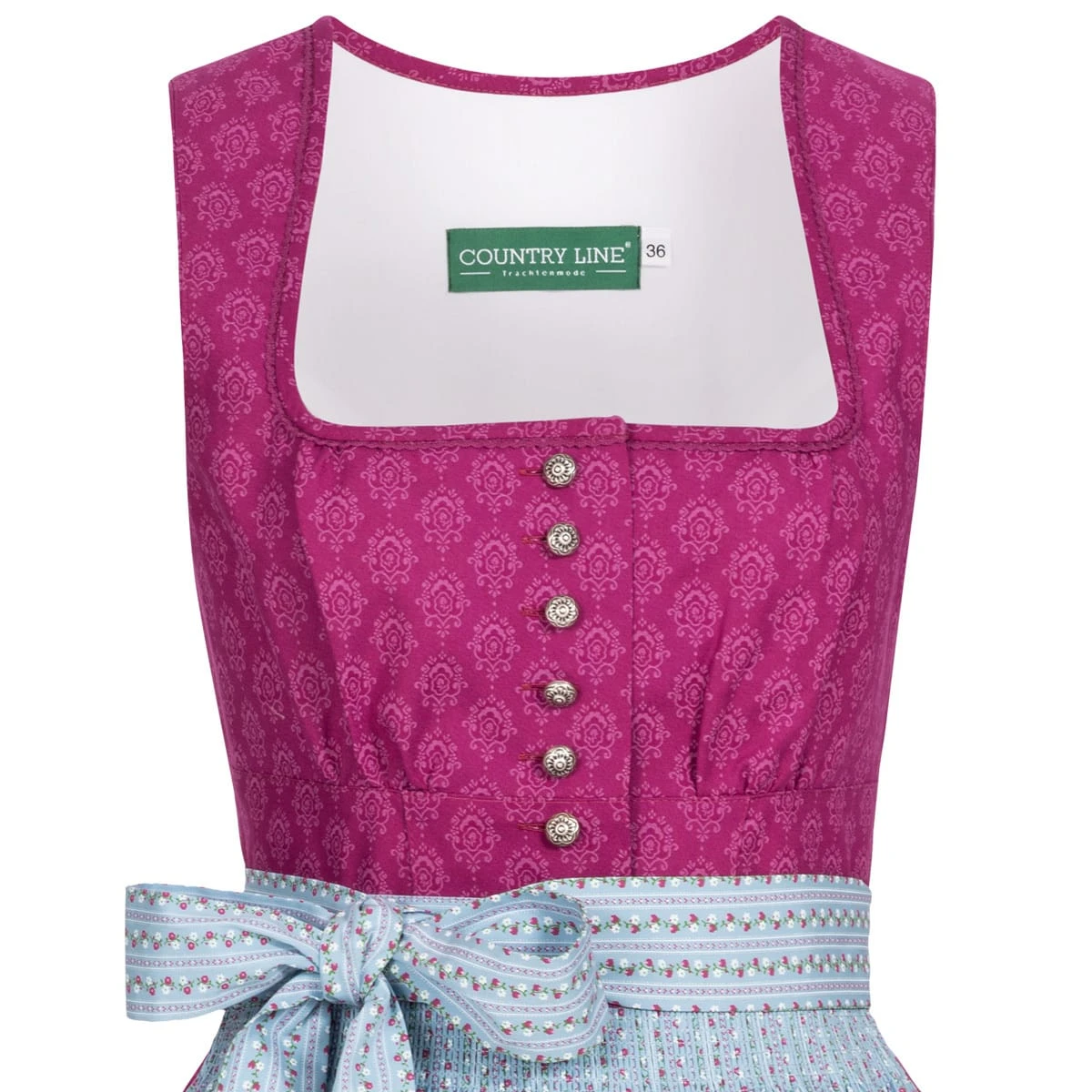 Ein reizendes Midi Dirndl Cindy in Pink von Country Line. Das komplette Dirndlkleid erstreckt sich in einem weißen Ornamentmuster. Die hellblaue Schürze mit floralen Muster, harmoniert perfekt zum Dirndl und sorgt somit für ein tolles Gesamtbild. Das Dirndl lässt sich mit einer Knopfleiste auf der Vorderseite verschließen. Der Balkonett Ausschnitt zaubert ein hübsches Dekolleté. Der Dirndlrock misst eine Länge von 60cm.