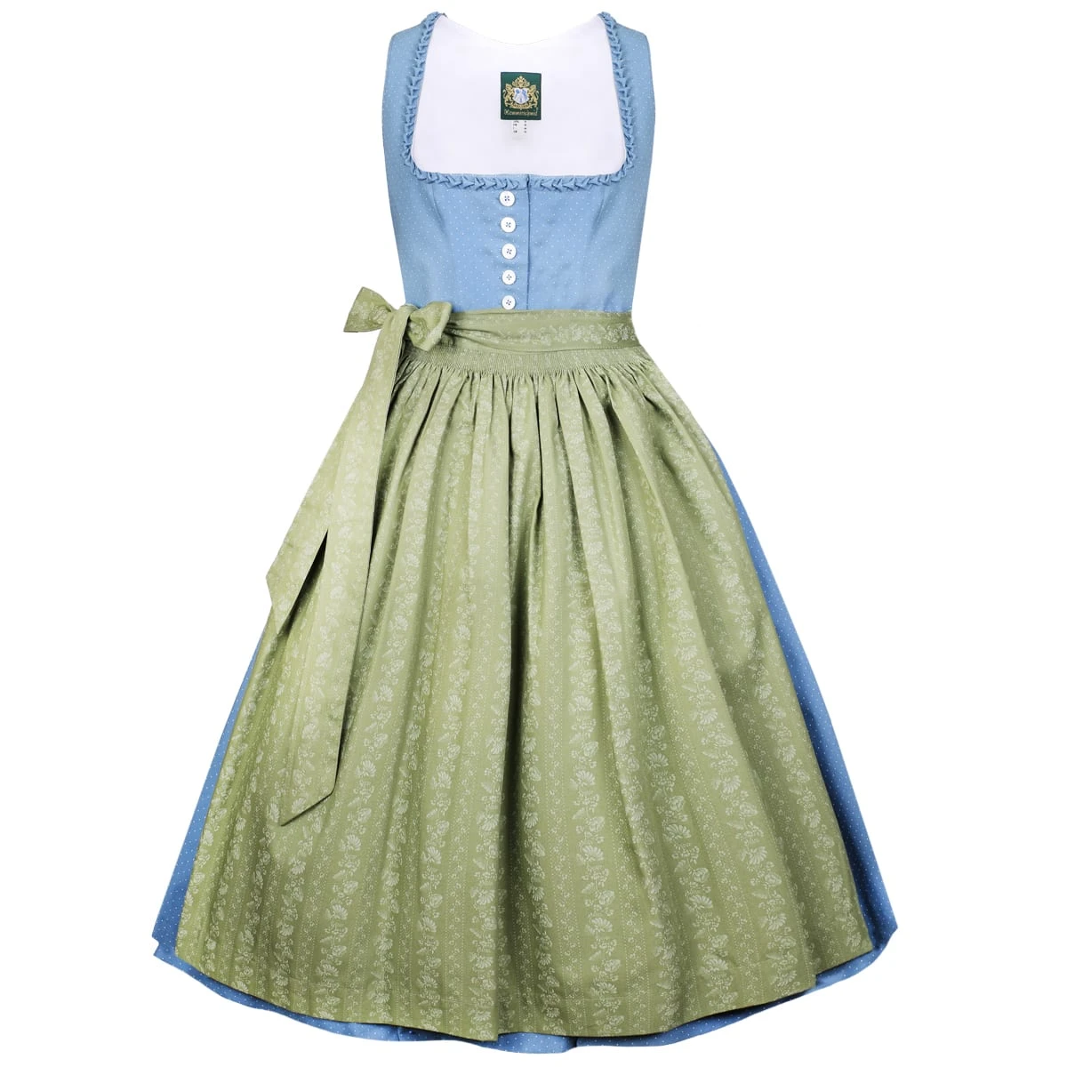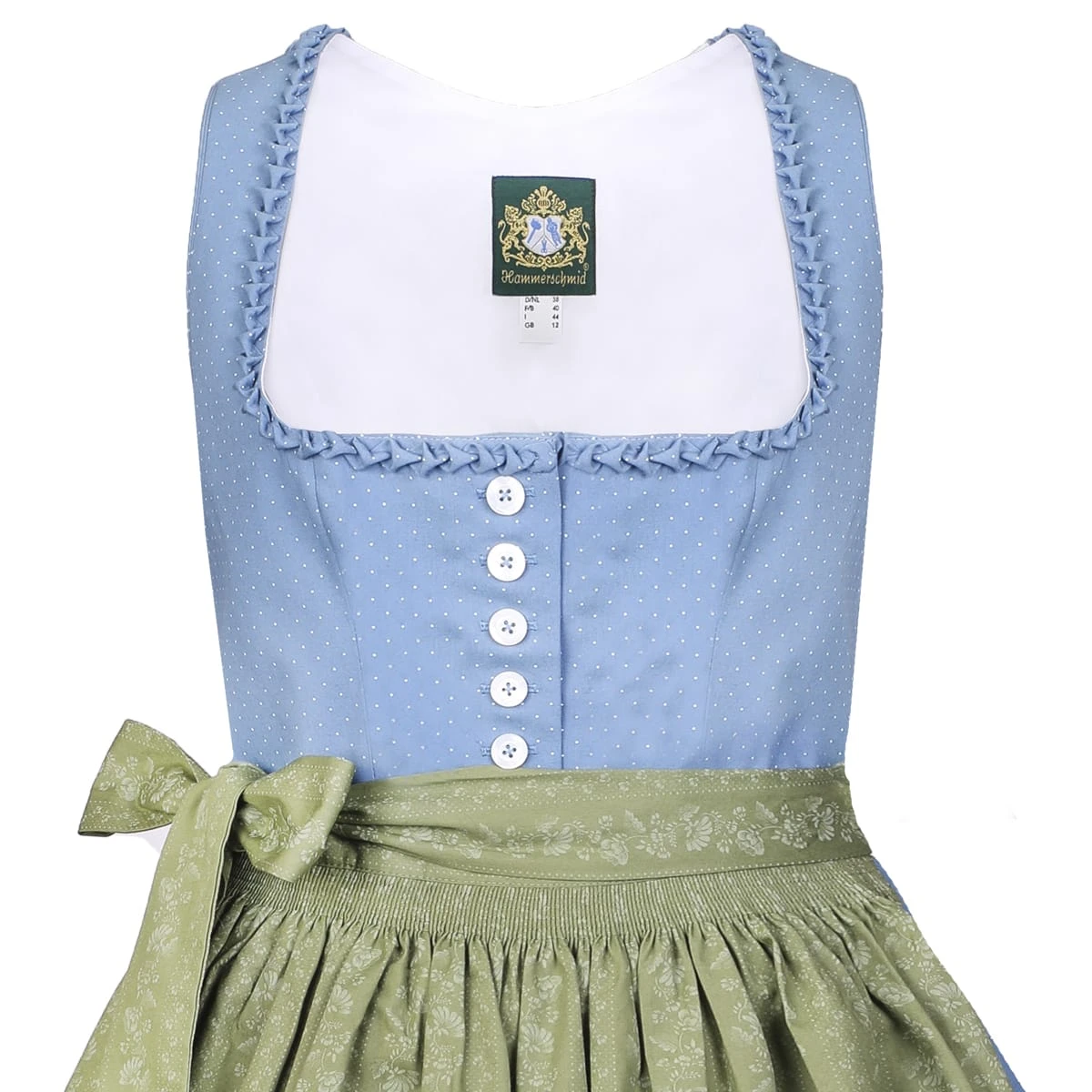 Ein Midi Dirndl Pillersee in Blau von der Marke Hammerschmid. Hier zeigt der Hersteller ein nettes Dirndl. Auf dem gesamten Kleid sind kleine weiße Punkte verteilt, die das Dirndl besonders weiblich wirken lassen. Das Mieder mit dem Balkonette- Ausschnitt unterstützt Ihre Fraulichkeit noch dazu. Es lässt sich durch Knöpfe ganz leicht öffnen. Auf der grünen Dirndlschürze ranken sich Blüten in Hellgrün und sorgen für einen zusätzlichen Blickfang. Der Rock hat praktische Eingrifftaschen und misst eine Länge von 70 cm.Hinweis zur Abbildung: Sofern nicht anders beschrieben, werden unsere Dirndl ohne Dirndlbluse geliefert. Dirndl und Bluse können Sie bei uns in verschiedenen Größen bestellen, so passt die Tracht perfekt. Unser Tipp: Variieren Sie z. B. zwischen weißen und schwarzen Dirndlblusen, viele unserer Dirndl können mit beiden Farben und verschiedenen Dirndlblusen (z. B. Langarmbluse, Kurzarmbluse) getragen werden. Zudem können fast alle unsere Dirndl für kleines Geld (ca. 15 Euro) beim Schneider angepasst werden wenn es einmal nicht passt. So wird ein wunderschönes Dirndl zu Ihrem perfekt sitzenden Dirndl Unikat!