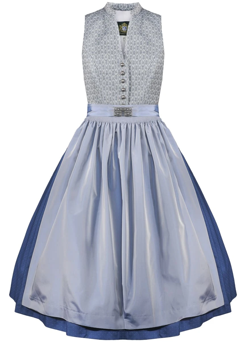 – Das blaue Dirndl von Hammerschmid hat eine Länge von 70 cm. Durch den Stehkragen und V-Ausschnitt wirkt das Dirndl besonders elegant. Mit der Knopfleiste auf der Vorderseite wird das Dirndl verschlossen.
