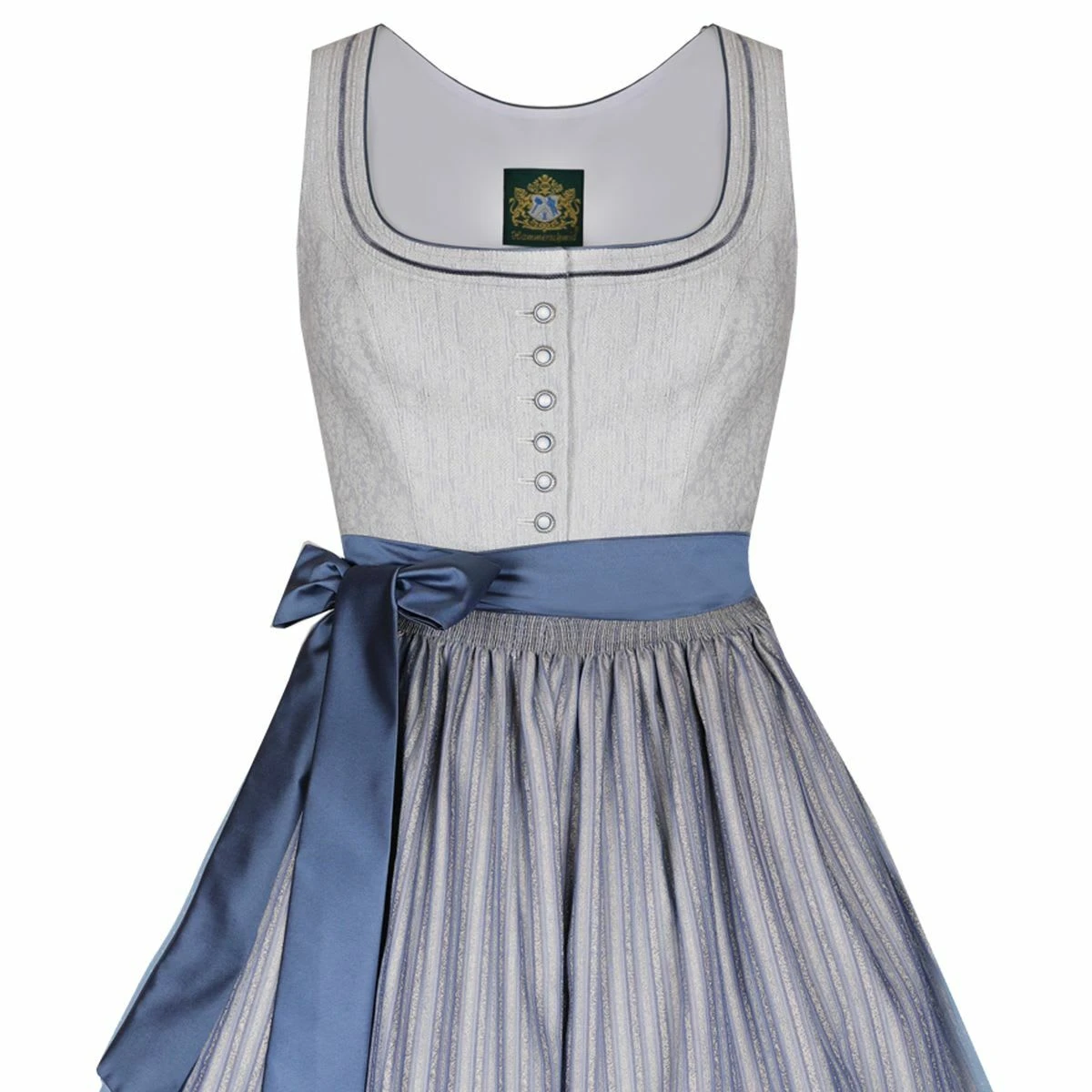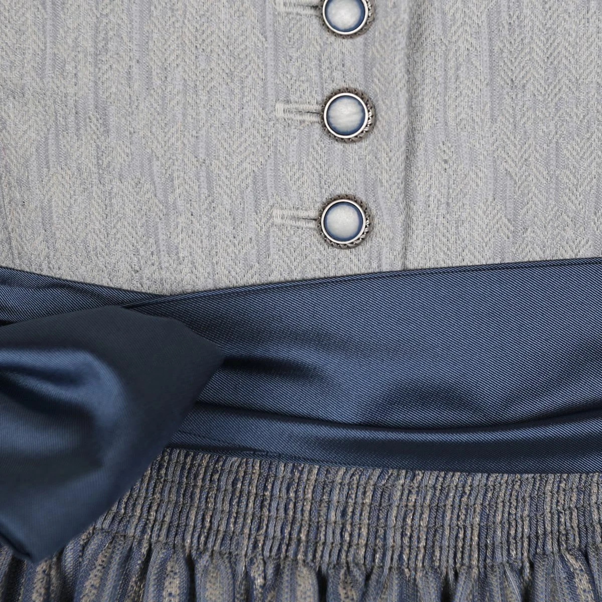 Ein wunderschönes langes Dirndl Koflersee in Grau von der Marke Hammerschmid. Dieses schlichte, graue Mieder wird mit einer Knopfleiste auf der Vorderseite geöffnet. Der Balkonett-Ausschnitt, sowie der Kragen zieren sich mit einer schlichten Samtborte. Diese Borte zeigt sich am Dirndlrock wieder. Der Dirndlrock zeigt sich in einem schönen sommerlichen Blau mit weißen Punkten. Die gestreifte Schürze harmoniert perfekt zum Dirndl und wird an der Taille gebunden. Der Trachtenrock misst eine Länge von 80cm. Der eingearbeitete Strech-Anteil sorgt für ein angenehmen Tragekomfort.