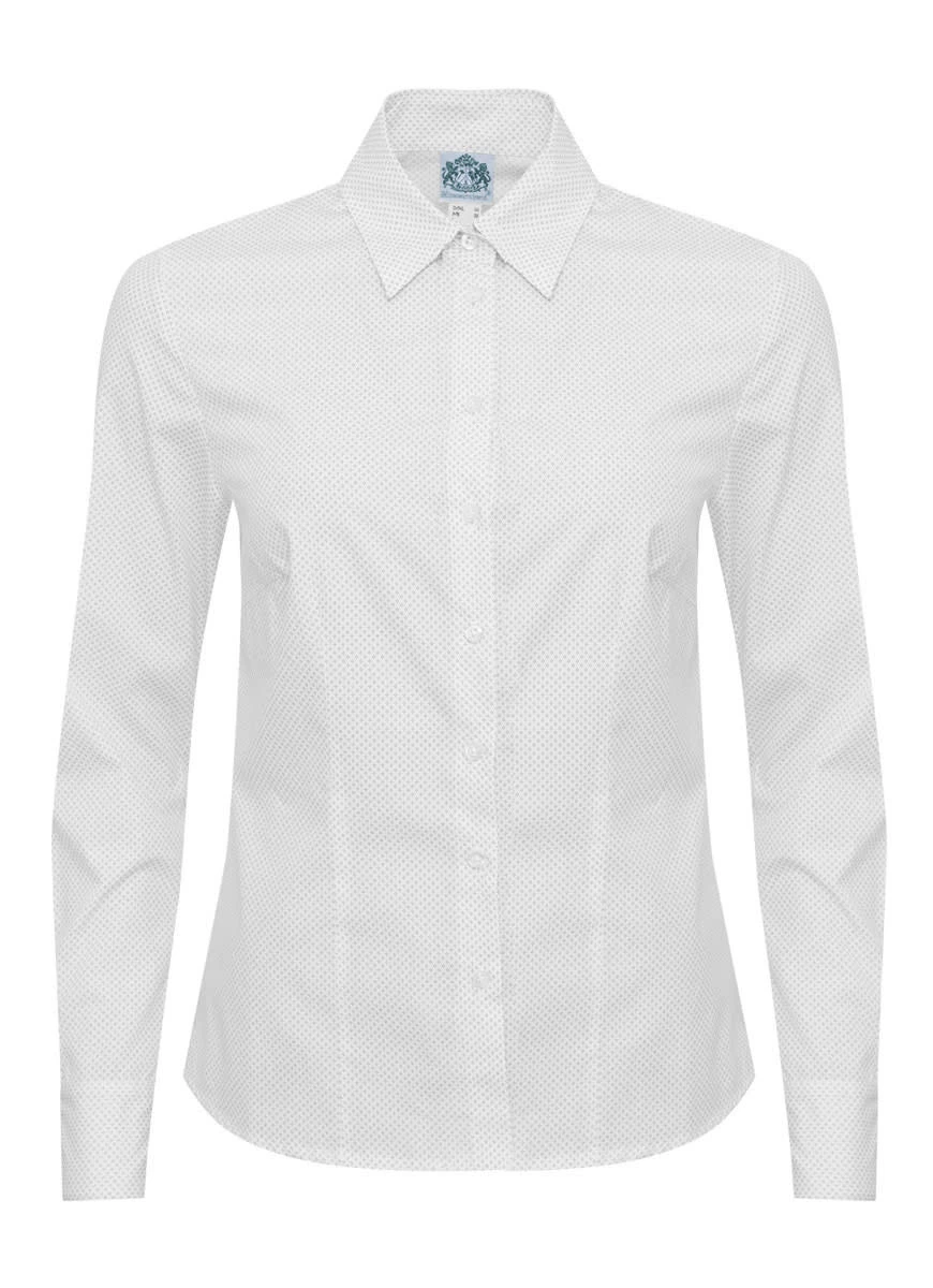 Eine klassische Trachtenbluse Hermine in Weiß von Hammerschmid. Die Bluse hat einen eleganten Stehkragen, mit der Knopfleiste auf der Vorderseite lässt sich die Bluse bequem bis zum Kragen schließen. Die gesamte Trachtenbluse ist mit einem schlichten schwarzen Muster versehen. Die hübsche Bluse ist tailliert geschnitten und schmeichelt der weiblichen Figur. Die Trachtenbluse ist vielseitig kombinierbar, nicht nur elegant zur Lederhose, sondern auch schön zur Jeans für den Alltag.