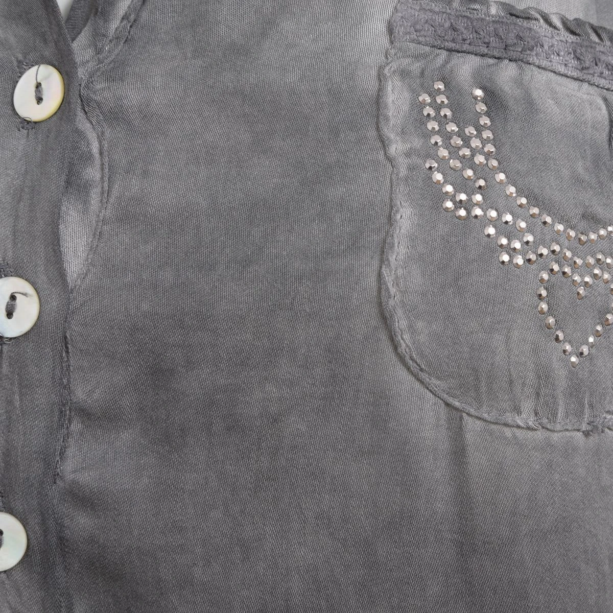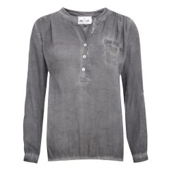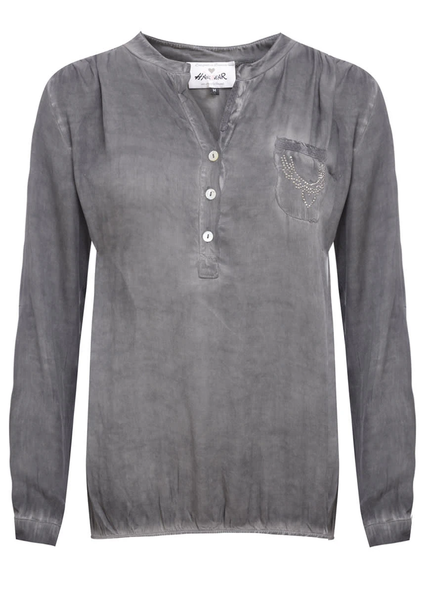 Hübsche Trachtenbluse Ilona in Grau von Hangowear! Hier zeigt die Firma Hangowear ein schöne Trachtenbluse für Damen. Das Material fällt angenehm weich und lässt sich sehr bequem tragen. Die Bluse ist in einem mit Handarbeit speziellem Verfahren gefärbt. Der dadurch gewollte, entstehende Effekt lässt das Shirt lebendig wirken. Die beiden aus glänzenden Steinen, angebrachten Motive sorgen für den zusätzlichen WOW-Effekt!