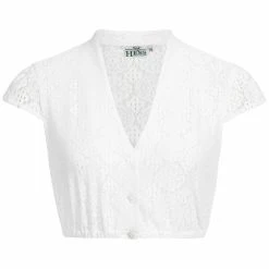 Eine schicke Dirndlbluse Inge in Weiß von der Marke Hess. Die süße Dirndlbluse wurde komplett aus einer hübschen Spitze gefertigt. Zudem besitzt die Bluse einen V-Ausschnitt mit kleinem Schalkragen. Auf der Vorderseite wird die Bluse mit drei dezenten Knöpfen verschloßen. Am Bund befindet sich ein Gummiband, dieses sorgt für den optimalen Halt. Dieses Modell zeigt sich mit einem extra kurzen Arm.