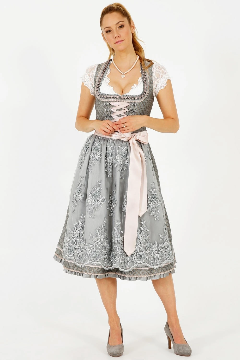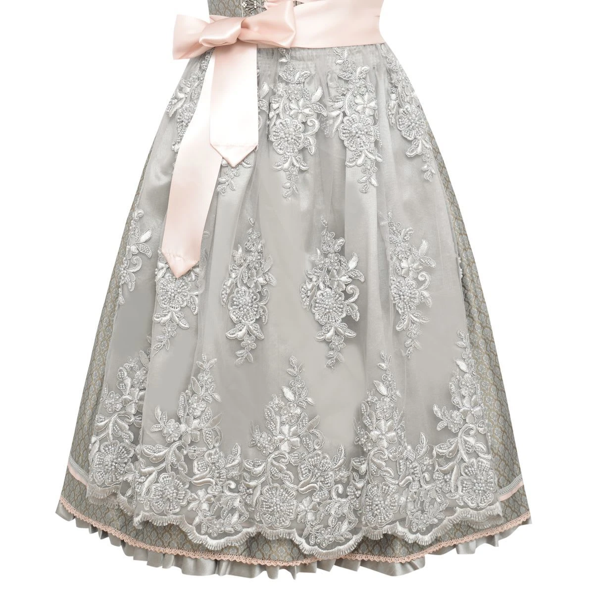 Ein bezauberndes Midi Dirndl Käthe in Beige von Krüger Collection. Das Dirndlkleid ist mit einem geschmackvollen Muster versehen. Der Balkonetté Ausschnitt und der Kragen zieren sich mit einer auffällig, hübschen Zierborte. Durch den Reißverschluss auf der Vorderseite, lässt sich das Dirndl ganz leicht schließen. Mit der zusätzlichen Schnürung wird der Reißverschluss ganz einfach versteckt. Die graue Doppelschürze ist aneinander genäht und schmückt sich mit einem prachtvollen Blumenmuster, das mit schicken Perlen verziert ist. Etwas über dem Saumabschluss ist die Baumwollschürze mit hübschen Zierbordüren besetzt.Alle Dirndl aus unserem Shop sind von renommierten Marken und bester Qualität. Sie suchen ein Dirndl kurz oder Midi Dirndl? Auch lange Dirndl führen wir unter unseren Dirndl Trachten in allen Varianten. Traditionell Dirndl oder moderne Dirndl mit Spitze und knalligen Farben. Ein Dirndl zaubert eine tolle Figur! Daher wird ein weisses Dirndl gern zur Hochzeit getragen. Das Dirndl schwarz ist bei Kellnerinnen sehr beliebt. Zum Volksfest gehört ein Trachten Dirndl für Damen dazu und bei uns finden Sie gewiss ihr Oktoberfest Dirndl. Mit ihrem neuen Wiesn Dirndl Damen ziehen Sie gewiss alle Blicke auf sich! Hinweis zur Abbildung: Sofern nicht anders beschrieben, werden unsere Dirndl ohne Dirndlbluse geliefert. Dirndl und Bluse können Sie bei uns in verschiedenen Größen bestellen, so passt die Tracht perfekt. Unser Tipp: Variieren Sie z. B. zwischen weißen und schwarzen Dirndlblusen, viele unserer Dirndl können mit beiden Farben und verschiedenen Dirndlblusen (z. B. Langarmbluse, Kurzarmbluse) getragen werden. Zudem können fast alle unsere Dirndl für kleines Geld (ca. 15 Euro) beim Schneider angepasst werden wenn es einmal nicht passt. So wird ein wunderschönes Dirndl zu Ihrem perfekt sitzenden Dirndl Unikat!