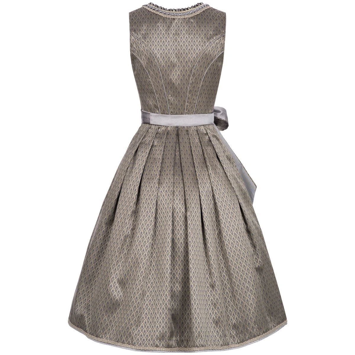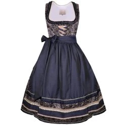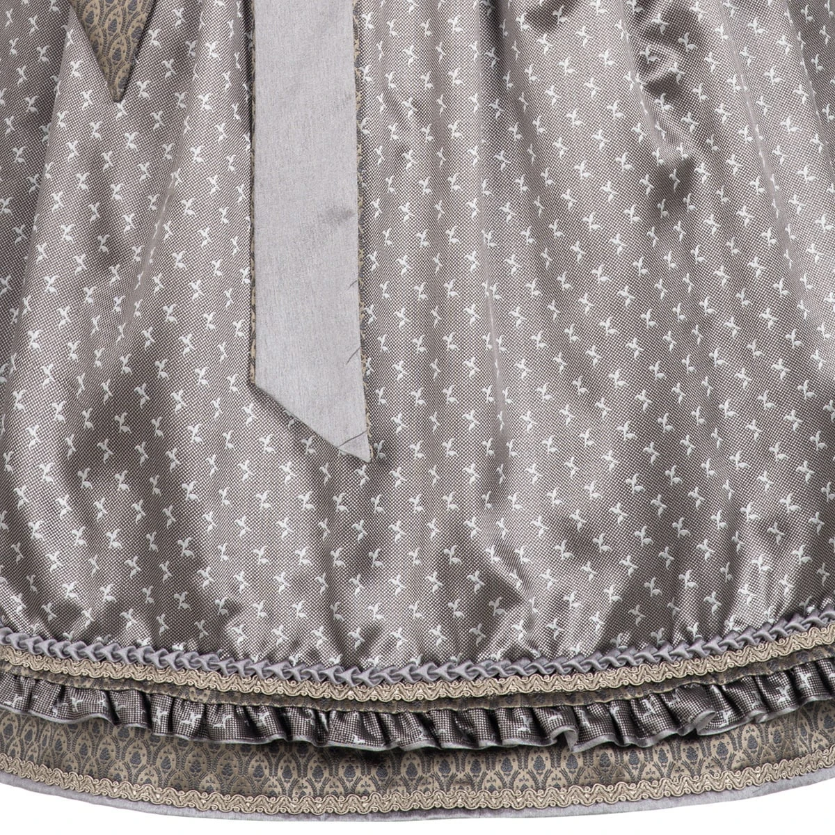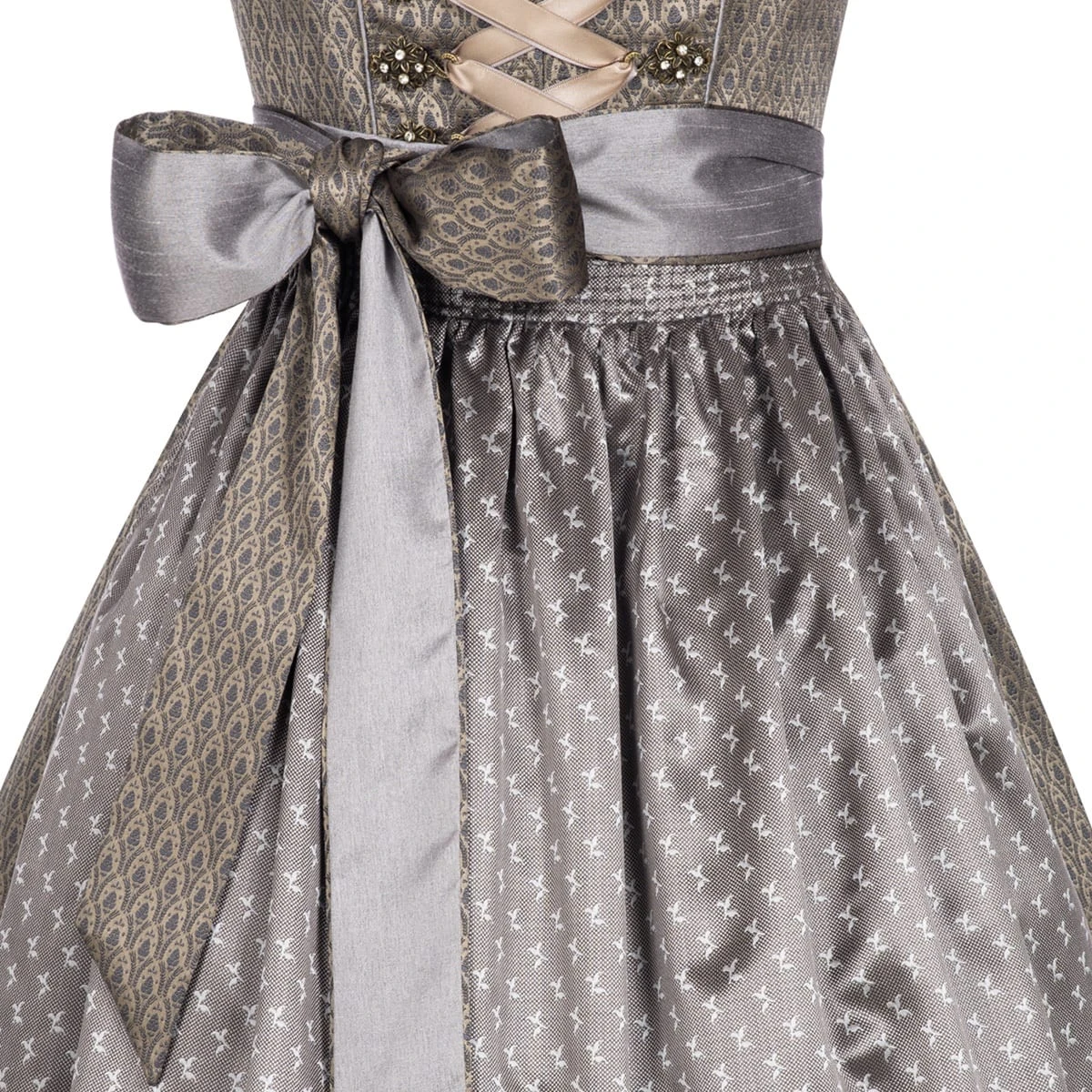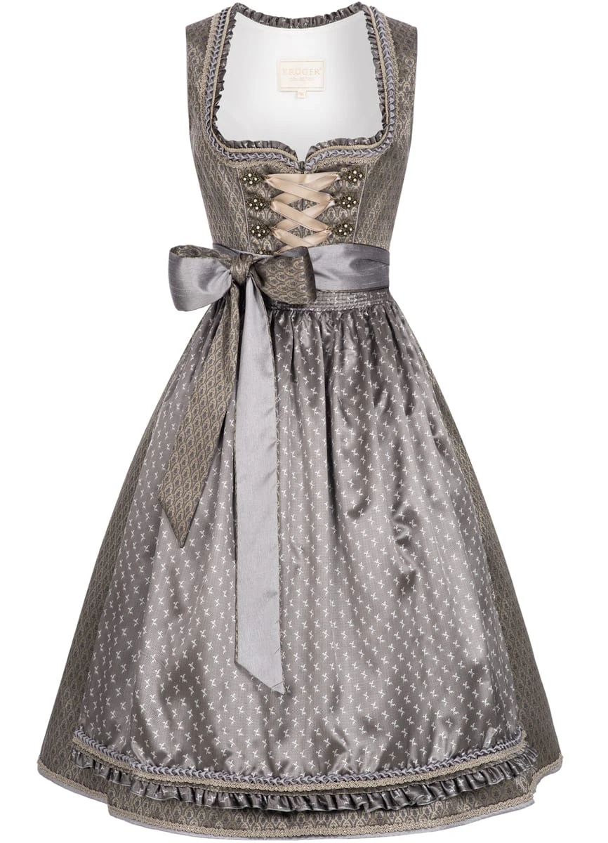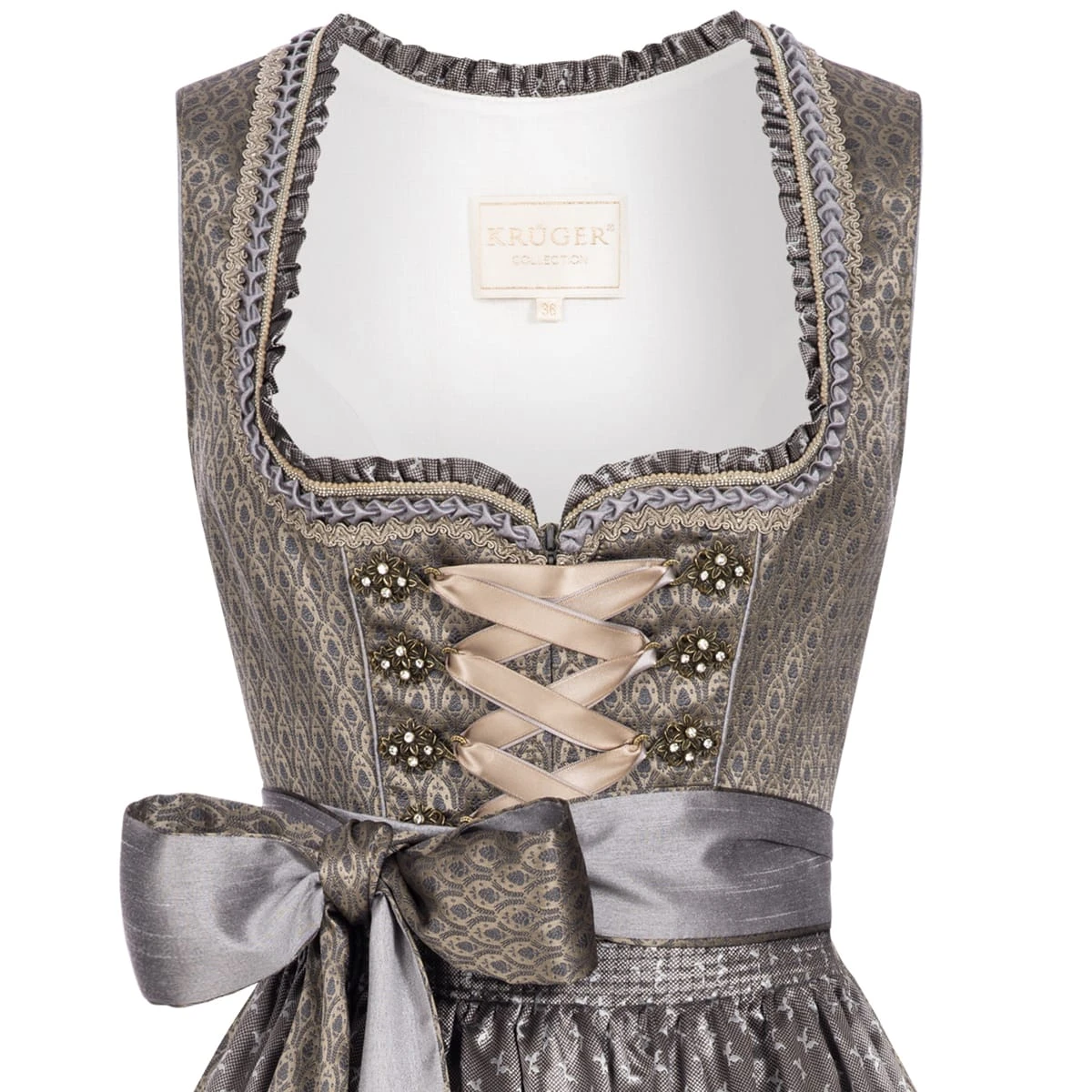 Ein hübsches Midi Dirndl Carmen in Grau von Krüger Collection. Das Dirndlkleid ist mit einem geschmackvollen Muster versehen. Der Herz Ausschnitt und der Kragen sind dekorativ verziert. Durch den Reißverschluss auf der Vorderseite, lässt sich das Dirndl ganz leicht schließen. Mit der zusätzlichen Schnürung wird der Reißverschluss ganz einfach versteckt. Veredelt wird das Dirndl zusätzlich durch die Strasssteine auf den Ösen. Die gemusterte Schürze ist etwas über dem Saumabschluss mit hübschen Zierbordüren besetzt.