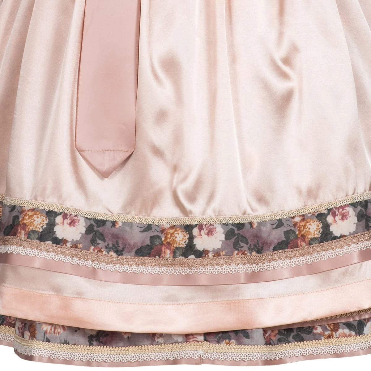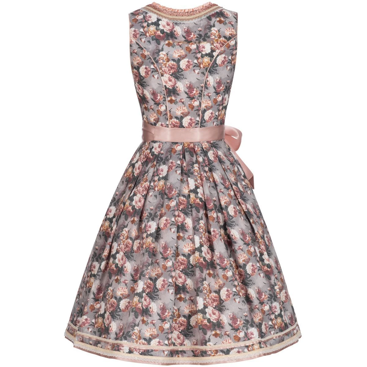 Ein wunderschönes Midi Dirndl Lisl in Mehrfarbig von Krüger Dirndl. Dieses bezaubernde Dirndl zeigt sich in einem hellbraunem mit Blüten verziertem Mieder und Rockteil. Den Ausschnitt zieren verschiedene zarte Borten und Spitzen in verschiedenen Farben. Diese Farben finden sich auch im Muster des Mieders wieder. Eine elegante zierliche Borte ziert den Dirndlrock am Saum. Die Schürze in einem tollen Rosa bietet einen eleganten Kontrast mit der verspielten Bordüre am Abschluss. Der Rock mit praktischen Einschubtaschen misst eine Länge von 60 Zentimetern.