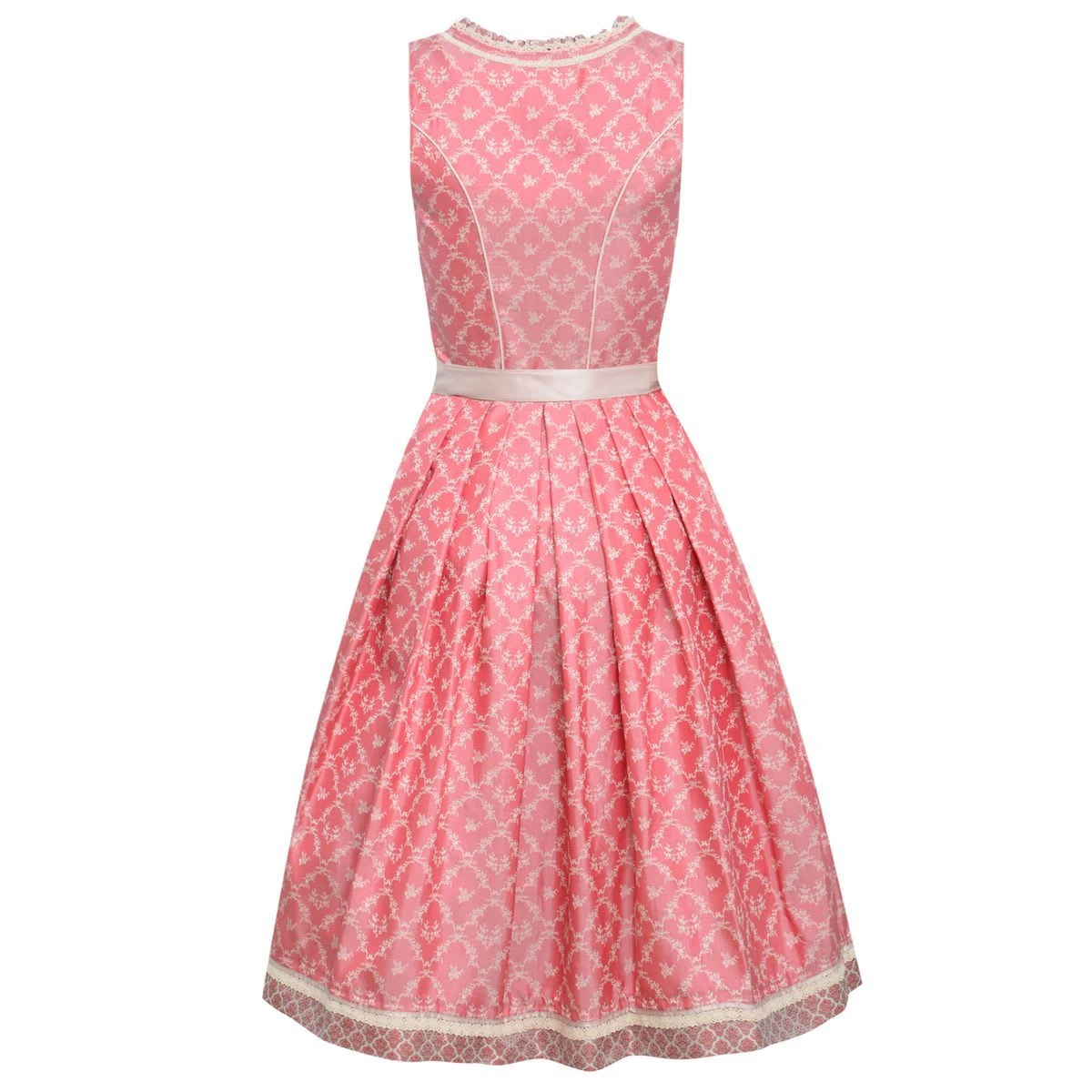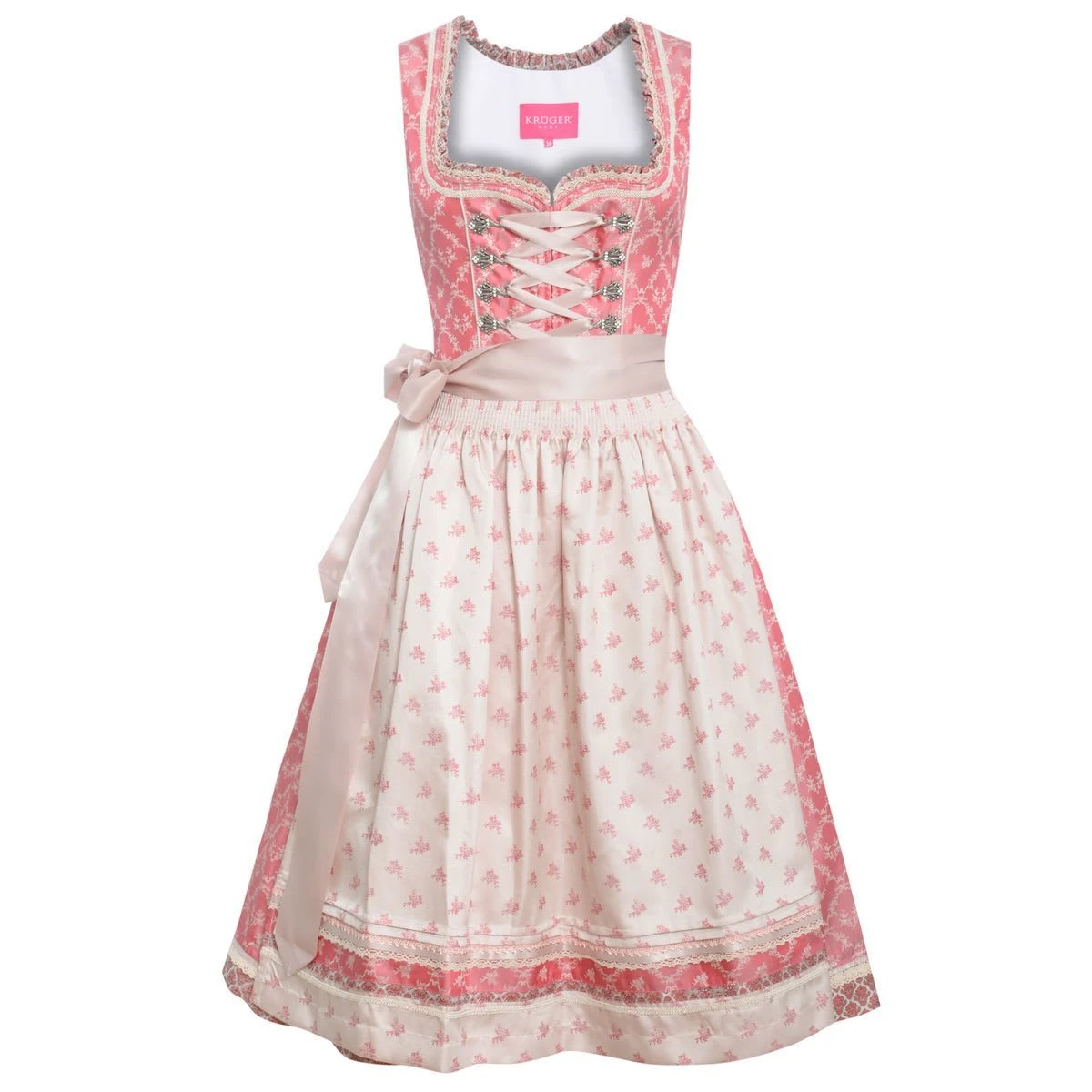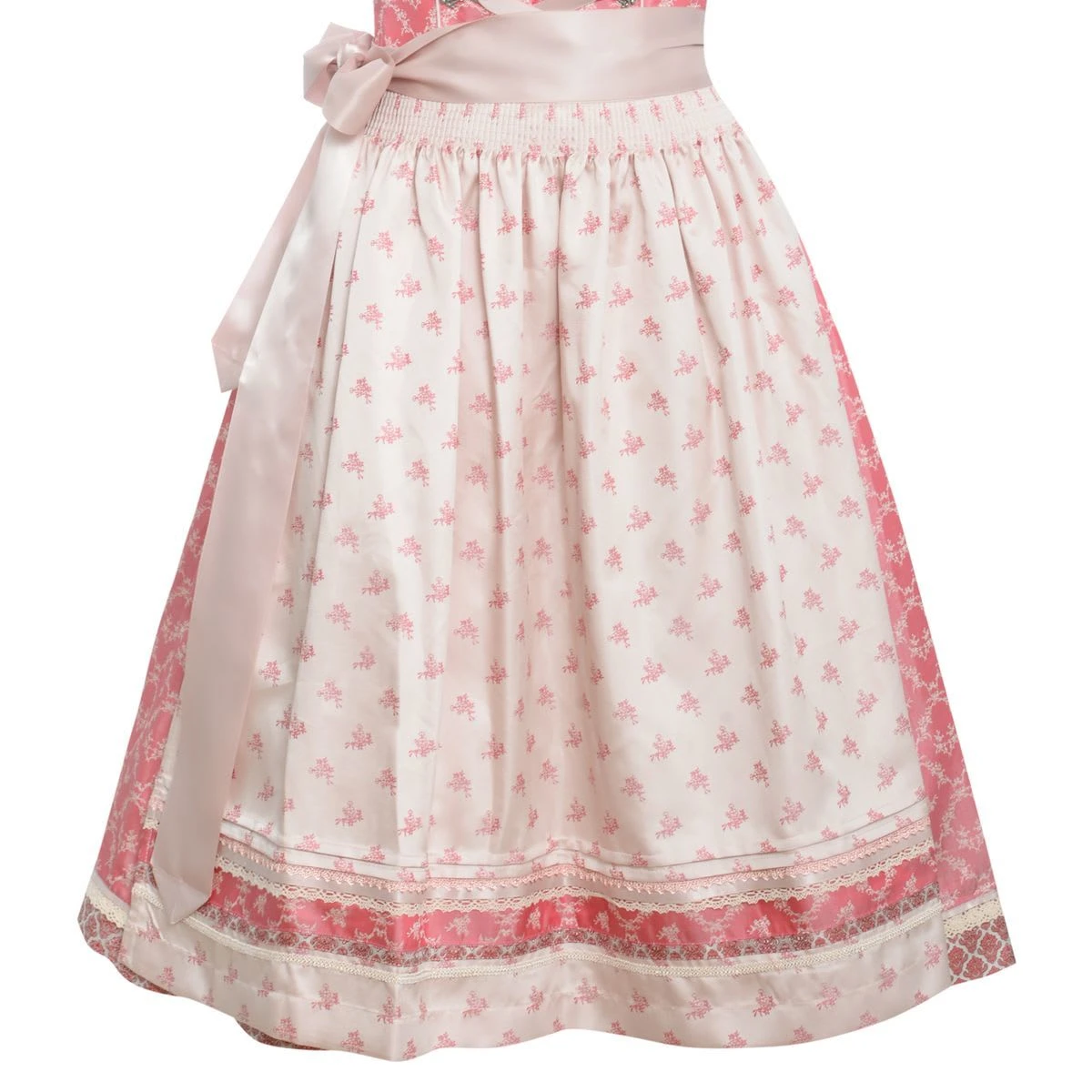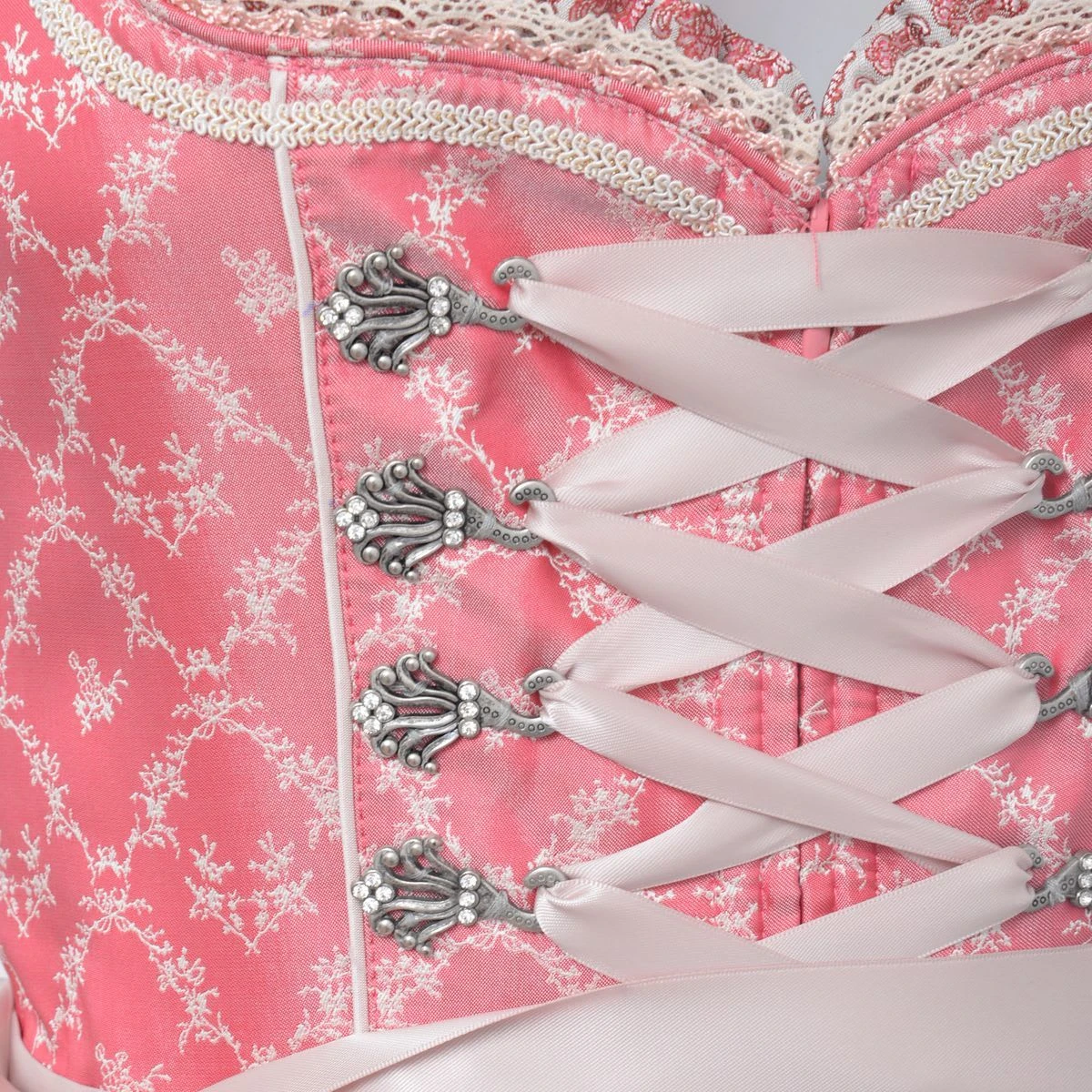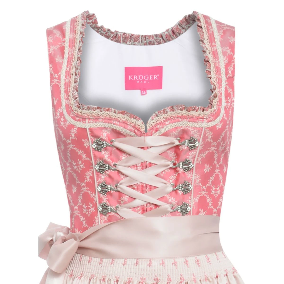 Ein wunderschönes Midi Dirndl Vanessa in Pink aus der Kollektion Krüger Dirndl. Das gesamte Dirndlkleid ist mit einem filigranen Muster versehen. Der Herz-Ausschnitt ist ringsum mit aufwändigen Borten in Rosa und Beige besetzt und zaubert ein traumhaftes Dirndl-Dekolleté. Das Dirndl Kleid ist vorne mit einem Reißverschluss zu öffnen. Seitlich davon sind Metallösen mit weißen Glitzersteinen angebracht. An diesen kann das rosafarbene Satinband geschnürt werden. Die Taftschürze in Rosa ist mit Schürzenbändern an der Taille zu binden und mit einem feinen Blumenmuster versehen. Die Schnürung an der Brust ist in der gleichen Farbe gehalten.Alle Dirndl aus unserem Shop sind von renommierten Marken und bester Qualität. Sie suchen ein Dirndl kurz oder Midi Dirndl? Auch lange Dirndl führen wir unter unseren Dirndl Trachten in allen Varianten. Traditionell Dirndl oder moderne Dirndl mit Spitze und knalligen Farben. Ein Dirndl zaubert eine tolle Figur! Daher wird ein weisses Dirndl gern zur Hochzeit getragen. Das Dirndl schwarz ist bei Kellnerinnen sehr beliebt. Zum Volksfest gehört ein Trachten Dirndl für Damen dazu und bei uns finden Sie gewiss ihr Oktoberfest Dirndl. Mit ihrem neuen Wiesn Dirndl Damen ziehen Sie gewiss alle Blicke auf sich! Hinweis zur Abbildung: Sofern nicht anders beschrieben, werden unsere Dirndl ohne Dirndlbluse geliefert. Dirndl und Bluse können Sie bei uns in verschiedenen Größen bestellen, so passt die Tracht perfekt. Unser Tipp: Variieren Sie z. B. zwischen weißen und schwarzen Dirndlblusen, viele unserer Dirndl können mit beiden Farben und verschiedenen Dirndlblusen (z. B. Langarmbluse, Kurzarmbluse) getragen werden. Zudem können fast alle unsere Dirndl für kleines Geld (ca. 15 Euro) beim Schneider angepasst werden wenn es einmal nicht passt. So wird ein wunderschönes Dirndl zu Ihrem perfekt sitzenden Dirndl Unikat!