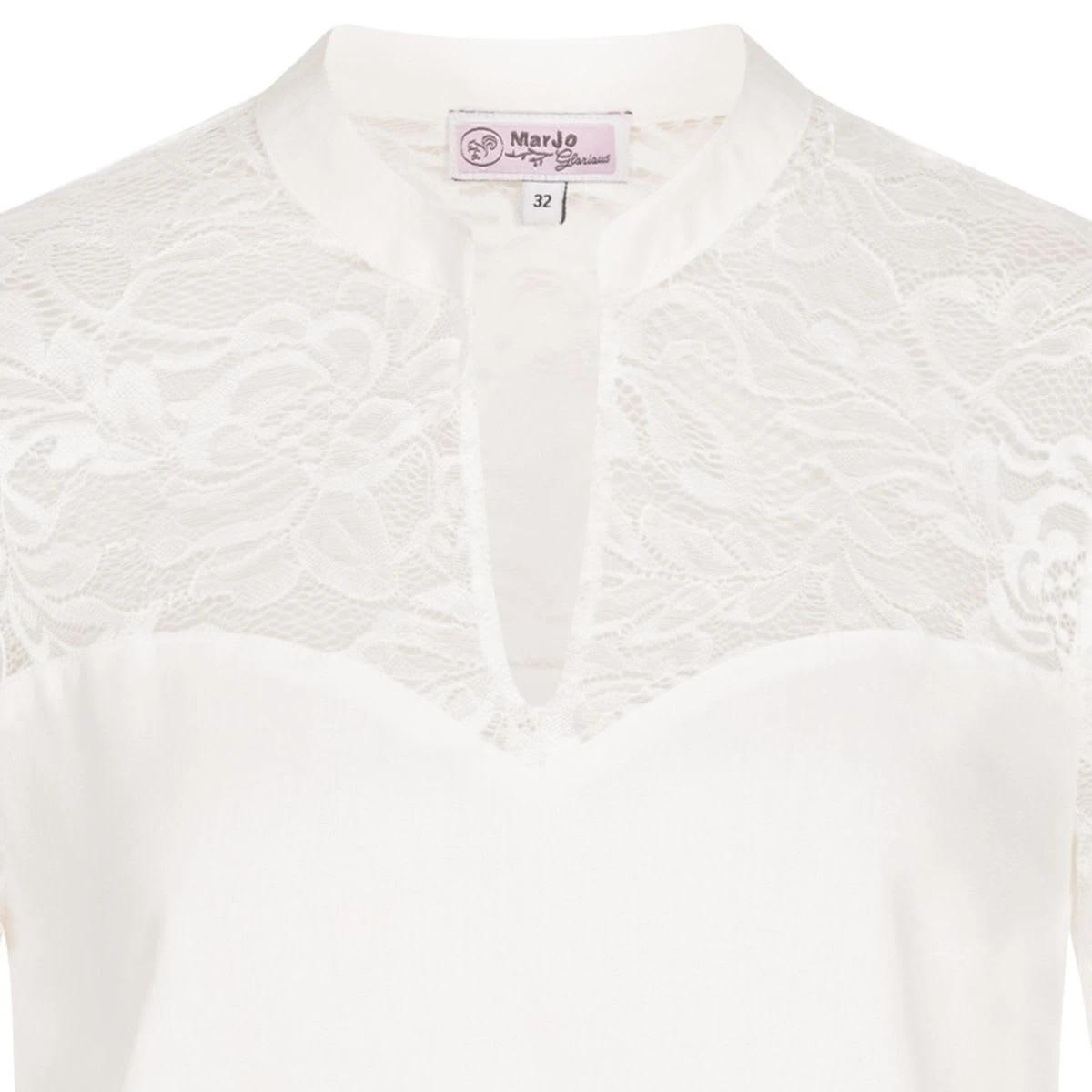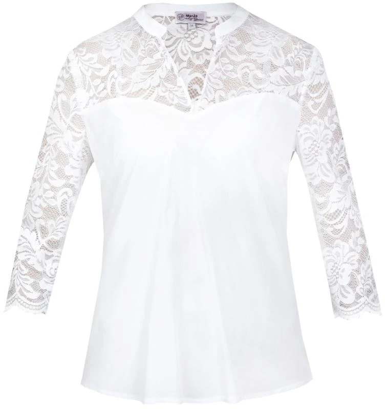 Eine moderne Bluse Janina-Majara in Weiß von Marjo Trachten. Die wunderschöne Bluse über zeigt mit ihren durchsichtigen Schultern und Ärmeln. Sie zeichnet eine schöne Figur und macht somit eine schicke Silhouette. Sie können diese Bluse von der Marke Major trachten gerne zur Lederhose oder zu Jeans aber auch zum trachten Rock tragen.