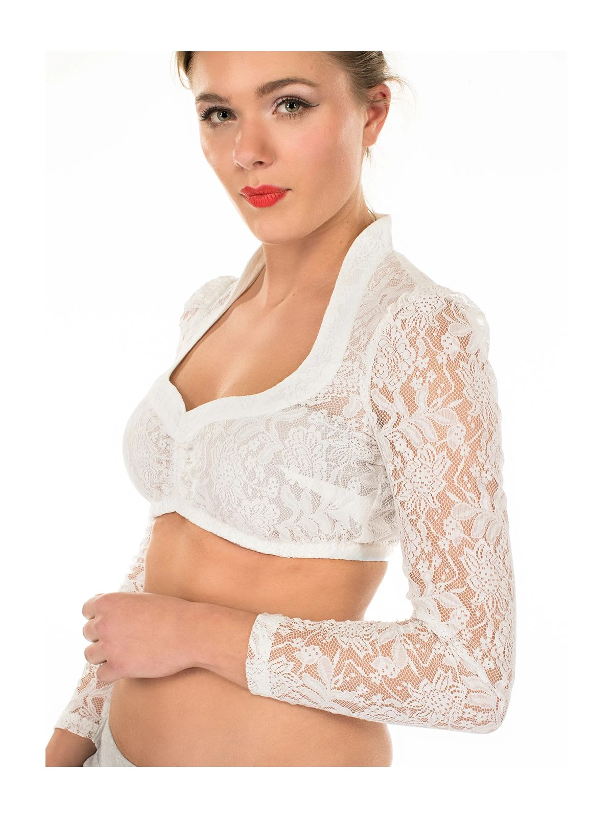Extravagant und super edel. Die neue Dirndlbluse in der Farbe weiss, mit langem Arm. Ein typisches Marjo Dirndlblusen Modell. Innovativ. Neu. Und absolut verführerisch. Elegante Optik durch die feine Spitze un durch die Klare Ausschnittform die in einem Schalkragen endet. Damit bereichern Sie jedes Dirndl und werden mit Sicherheit viele Blicke auf sich ziehen. Einfach traumhaft diese Dirndlbluse. Und der Preis? Genauso traumhaft.•Diese Dirndlbluse fällt bequem aus. •100% Nylon •Chemische Reinigung