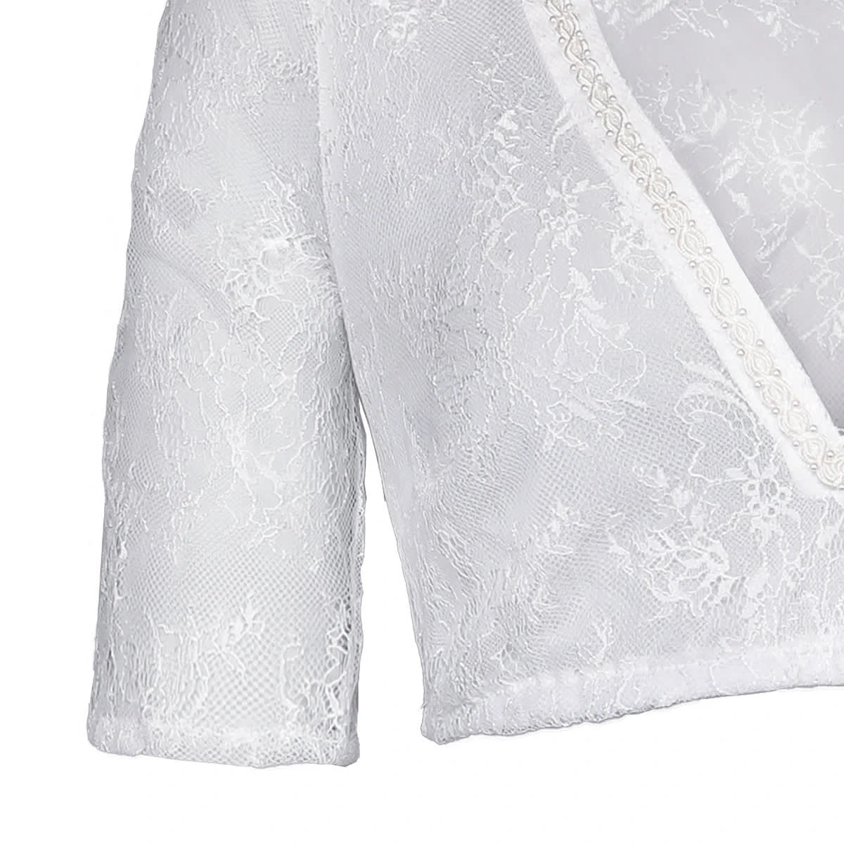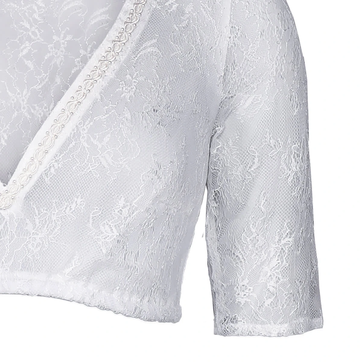 Eine bezaubernde Dirndlbluse Ciara-Vida in Weiß von der Marke Marjo Trachten. Die Dirndlbluse ist ringsum mit sehr hübschen Spitzen versehen. Sie ist dadurch transparent und luftig, leicht zu tragen. Der V-Ausschnitt ist sehr schlicht und dezent gehalten und mit eleganter perlenbesetzter Borte geschmückt.