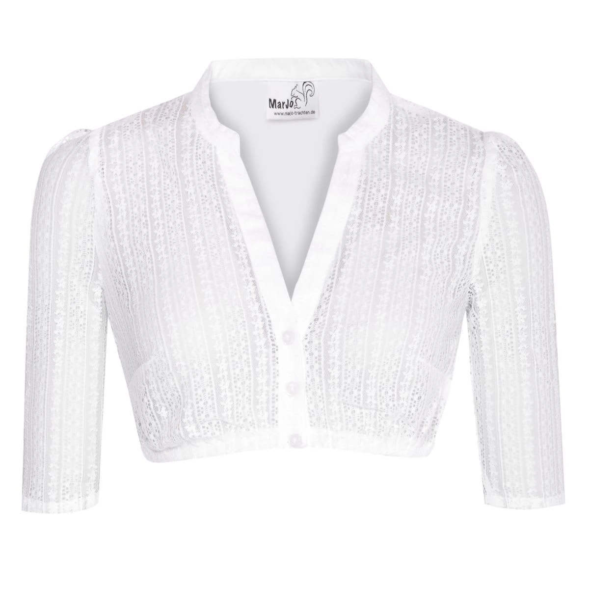 Eine weiße Dirndlbluse Emma-Linda von der Marke Marjo Trachten. Die wunderschöne Dirndlbluse überzeugt mit Qualität und netten Spitzen ringsherum. Die weiße Dirndlbluse hat einen V-Ausschnitt. Die Puffärmel runden den reizenden Gesamteindruck perfekt ab. Diese Bluse passt perfekt zu jeden Dirndl und lässt sich bequem mit Knöpfen öffnen.Zur Wiesn brauchen Sie die passende Dirndlbluse. Bitte achten Sie darauf das die Dirndlbluse zu Ihrem Dirndlausschnitt passt. An dieser Stelle können wir Ihnen folgende Dirndlblusen Hilfestellung geben: Es gibt den Balkonettausschnitt, den eckigen Balkonettausschnitt und den Herzausschnitt sowie den Unterbrustausschnitt und V-Ausshnitt. der tiefest Ausschnitt ist der Unterbrustausschnitt, bei diesem gewähren Sie den meisten Einblick. Im Anschluss kommt der Herzausschnitt, dieser ich leicht zu erkenne, da die Aschnittform wie ein Herz aussieht welches auf dem Kopf steht. Der Balkonettauschnitt ist am Dirndl sehr gut zu erkennen, weil der Ausschnitte gerade von links nach rechts verläuft. Der eckige Balkonett-Auschnitt am Dirndl als auch der Dirndlbluse ist ein 90 Grad Winkel. Der Stehkragen oder auch Schalkragen (Schneewittchenkragen) orientiert sich nur am Kragen. Und passt auch nur zu den Dirndln die ebenfalls einen Stehtkragen haben. Der V-Asuschnitt ist die eleganteste Variante an einer Dirndlbluse. Außerdem sollten Sie darauf achten welche Armlänge ihre Dirndbluse haben sollte. Ein langarm Dirndbluse kann bei kühlerem Wetter sehr warm sein und edel sieht die Dirndbluse auch noch aus. Für ein schönes Dekoltee mit der Dirndlbluse sollten Sie sich eventuell auch einen DirndBH zulegen. Wir können Ihnen den Dirndl Push-UP BH in Weiß von My Choice empfehlen. Dieses Modell ist ein Wundermittel für Ihre Dirndlbluse mit Dirndl. Bei großer BH Größe und ohne Push Wirkung haben wir seit Jahren sehr gute Erfahrung mit dem Modell Hammerschmid Dirndl BH in weiß oder Hammerschmid Dirndl BH Annemarie in weiß. Unsere BH´s sind eine reine Empfehlung.