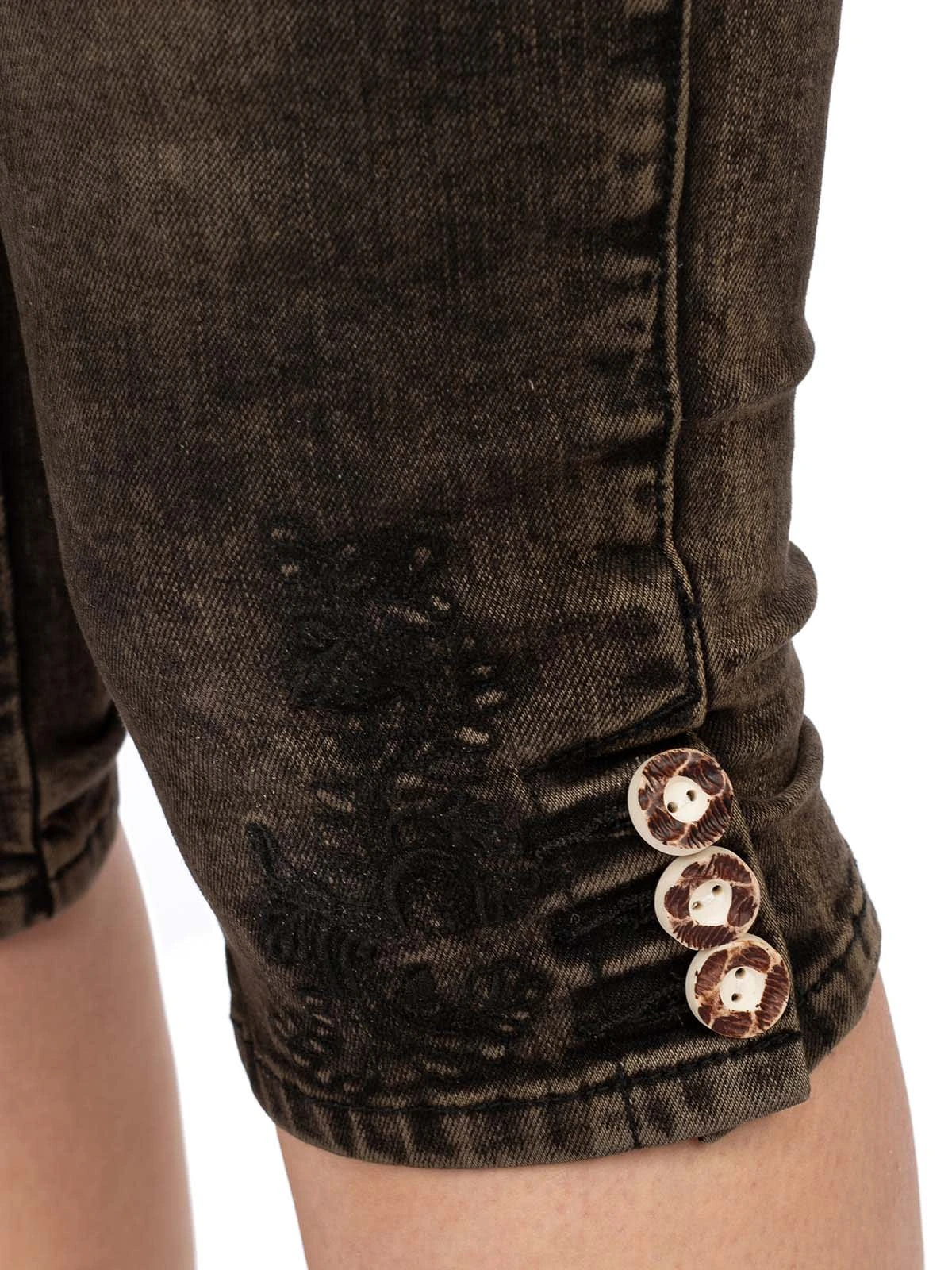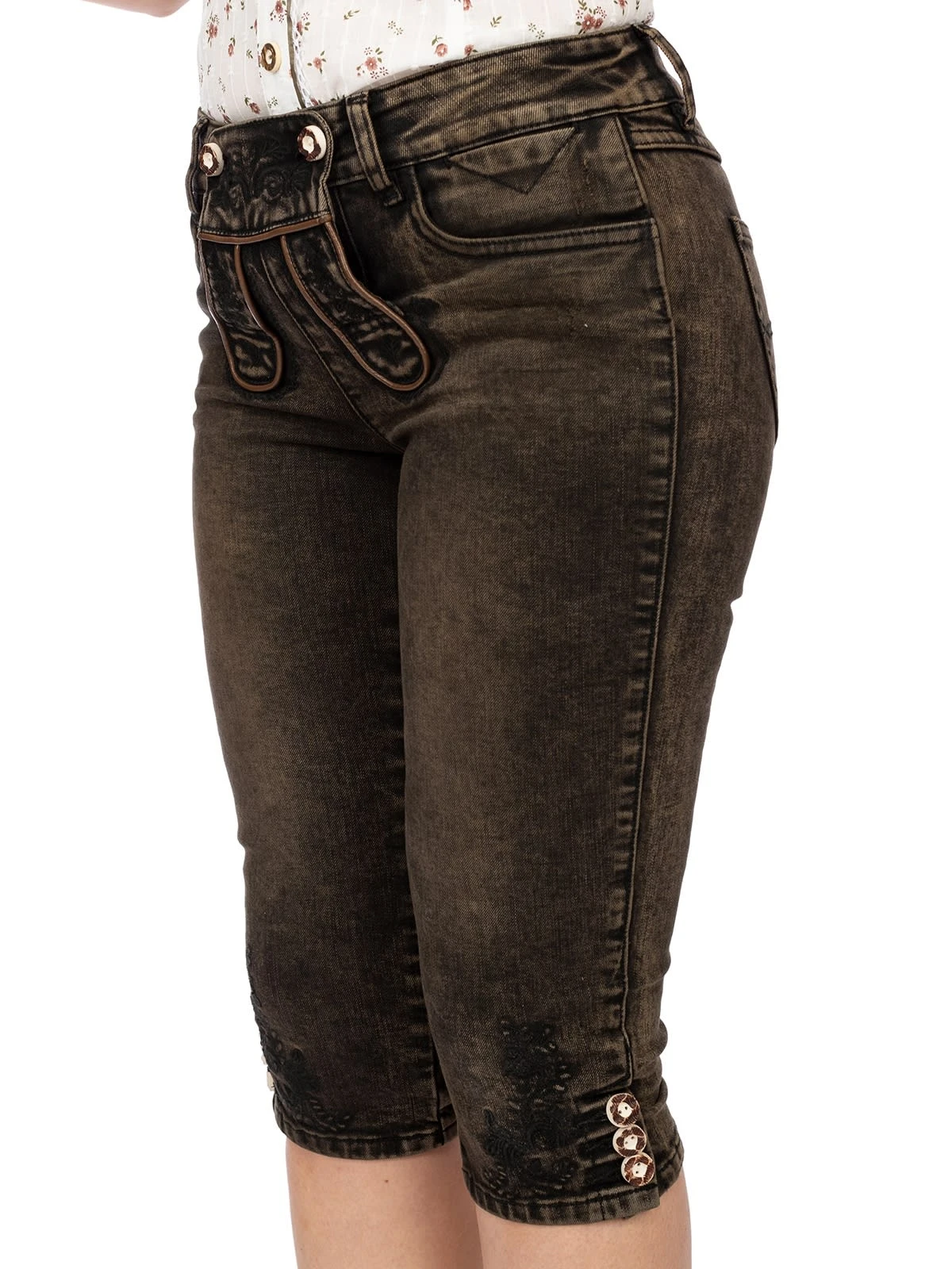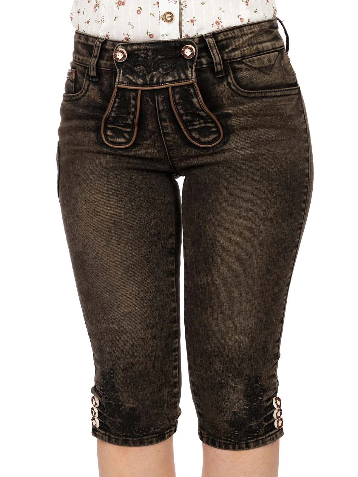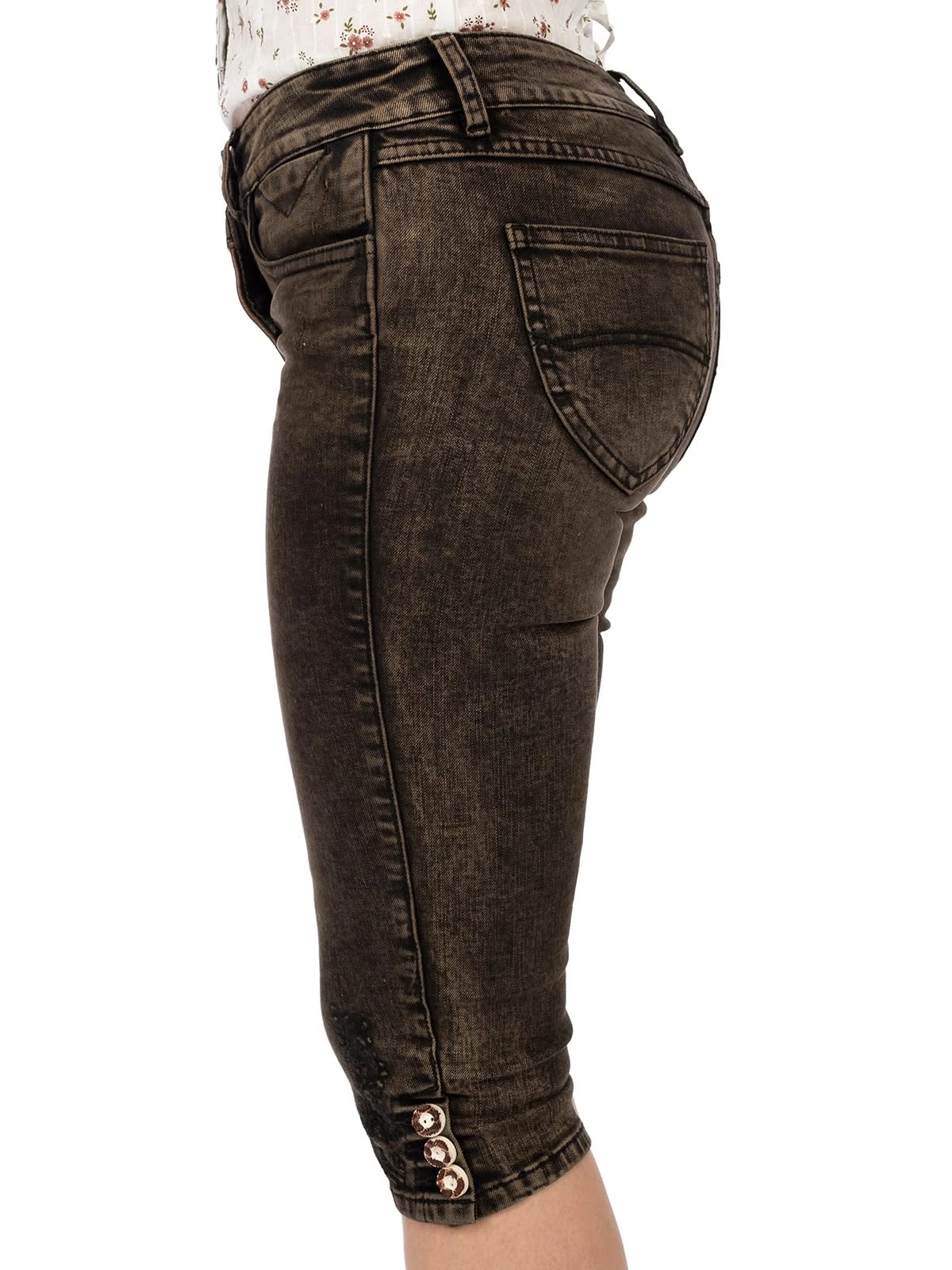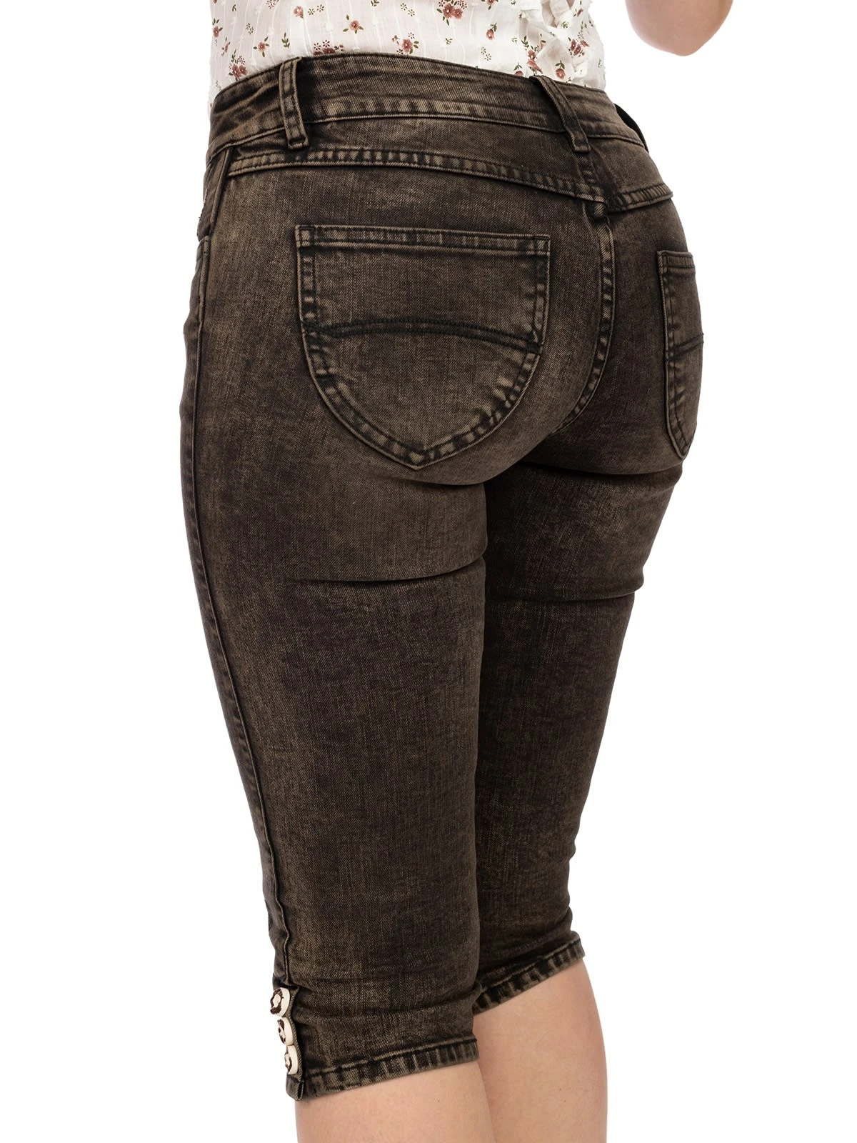 Dunkelbraune Jeans Milla im Kniebund-Look. Ein modisches Trachtenmodell von Marjo ist diese dunkelbraune Jeans im angesagten Kniebund-Style. Die Jeans verfügt vor allem im vorderen Bereich über etliche Details, die sonst nur an einer traditionellen bayerischen Lederhose zu finden sind. Dazu gehören Hirschhornknöpfe am Hosenbeinabschluss sowie im oberen Frontbereich. Die Hose endet knapp unter den Knien.•Diese Trachtenhose fällt größengerecht aus. •70% Baumwolle 25% Polyester 3 % Rayon 2% Elasthan •Maschinenwäsche