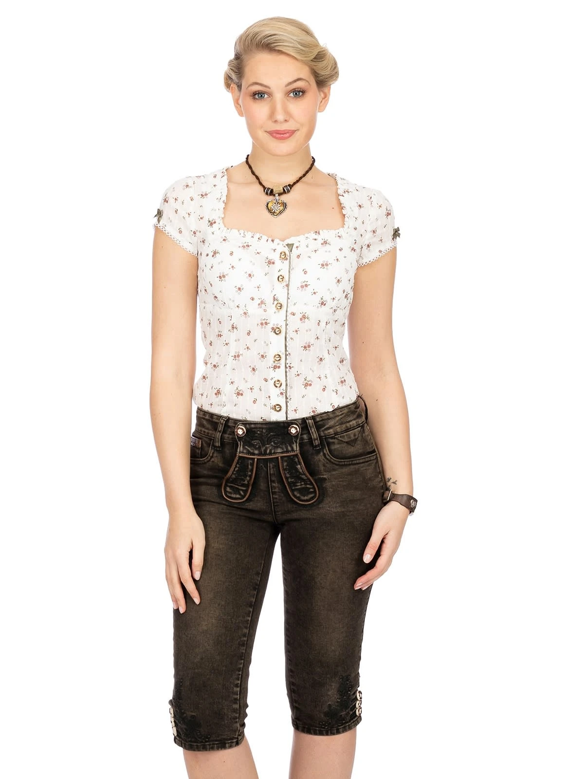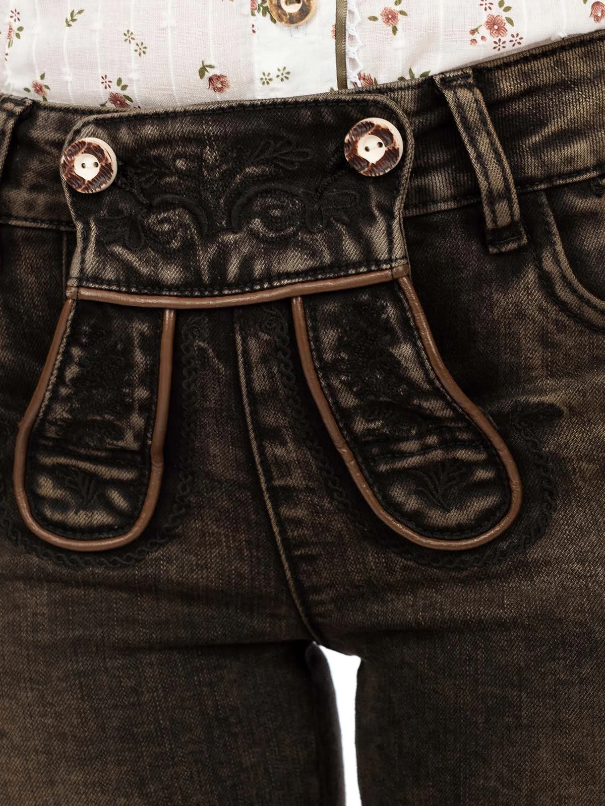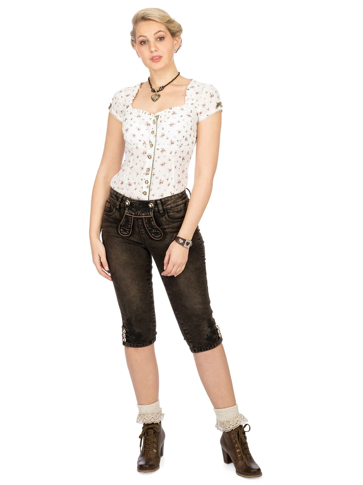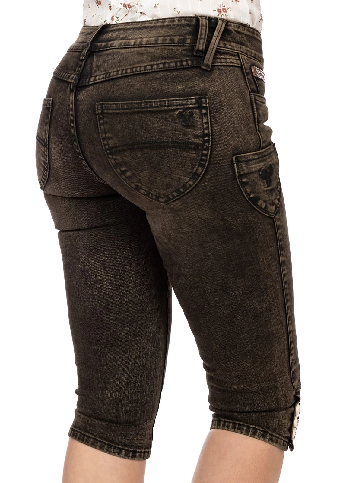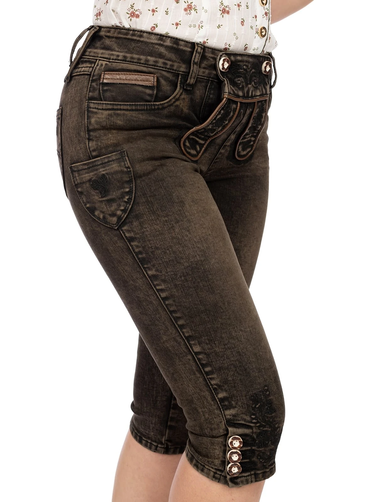 Dunkelbraune Jeans Milla im Kniebund-Look. Ein modisches Trachtenmodell von Marjo ist diese dunkelbraune Jeans im angesagten Kniebund-Style. Die Jeans verfügt vor allem im vorderen Bereich über etliche Details, die sonst nur an einer traditionellen bayerischen Lederhose zu finden sind. Dazu gehören Hirschhornknöpfe am Hosenbeinabschluss sowie im oberen Frontbereich. Die Hose endet knapp unter den Knien.•Diese Trachtenhose fällt größengerecht aus. •70% Baumwolle 25% Polyester 3 % Rayon 2% Elasthan •Maschinenwäsche