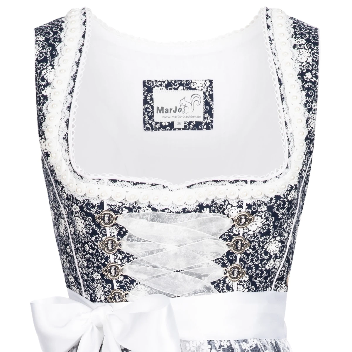 Ein wunderschönes Midi Dirndl Faralda in Dunkelblau von Marjo Trachten. Das dunkelblaue mit Ornamenten verzierte Mieder des Dirndls hat eine tolle mit Perlen geschmückte Borte entlang des Ausschnitts in dezentem Weiß. Dasselbe Muster findet sich als schmückende Borte am Saum des Rockes. Passend dazu ist auch die Schnürung am Mieder mit einem reizenden Satinband in Weiß gehalten. Der Dirndl Rock ist ebenfalls in dunkelblau mit kleinen Punkten gehalten. Passend dazu gibt es eine Schürze, in wunderschöner Spitzenoptik in demselben kräftigen Weiß. Das Schleifenband der Schürze ist ebenfalls aus zartem Weiß. Der Dirndlrock misst eine Länge von 58 cm.