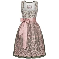 Ein bezauberndes Midi Dirndl Gesa in Grün von Marjo Trachten. Das Dirndl mit Herzausschnitt wird auf der Vorderseite mit einem Reißverschluss verschlossen. Der Kragen und Ausschnitt wurden mit einer hübschen Zierborten geschmückt. Zudem wurden Rosen am Ausschnitt angebracht. Das gesamte Dirndlkleid schmückt sich mit einem Ornament – Muster. Die hübsche Schürze wurde aus Spitze gefertigt und mit floralen Stickereien besetzt. Der Trachtenrock misst eine Länge von 65cm. Der Oberstoff am Oberteil ist ein leicht grau/grün mit Rosen in Rosa. Der Rock ist grün und die Schürze ist Rosa.
