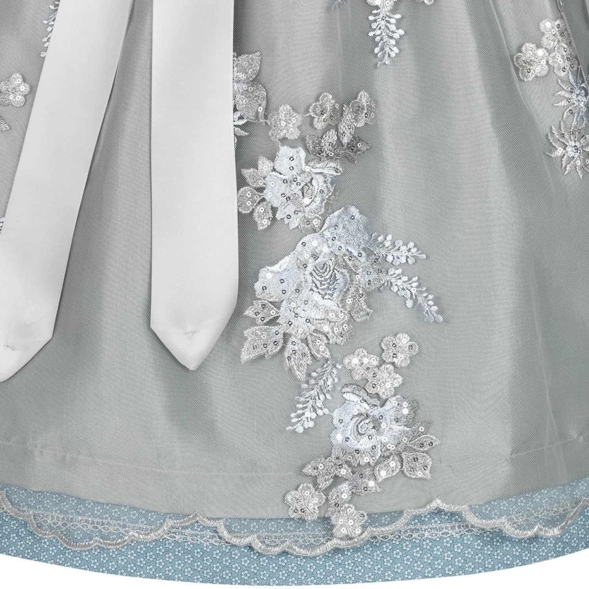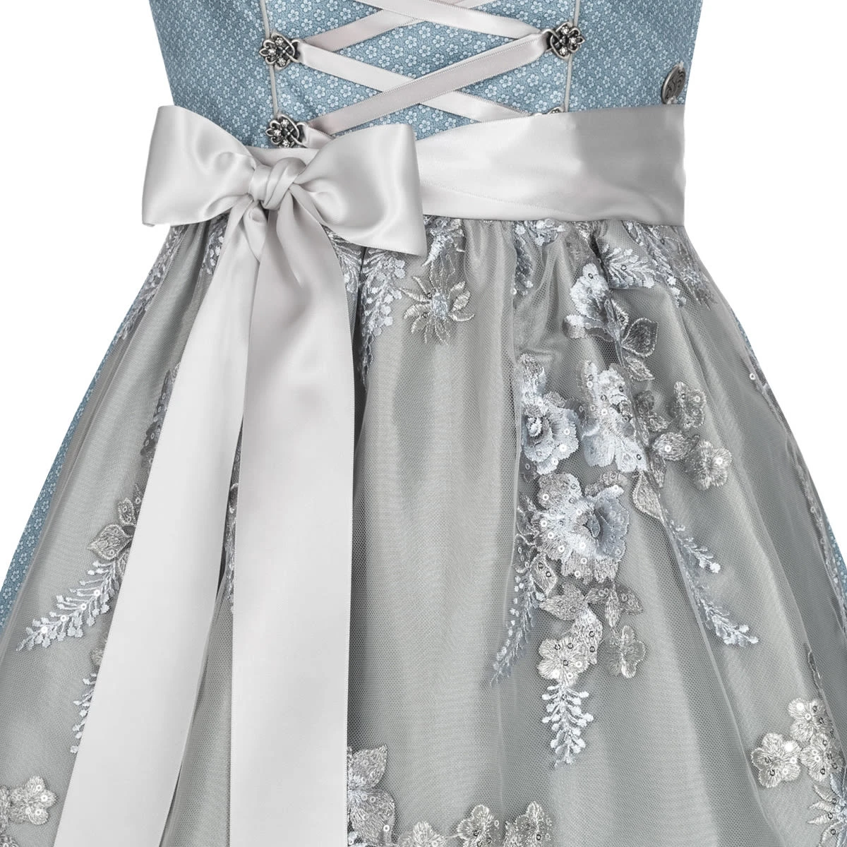 Ein hübsches Midi Dirndl Farina in Hellblau von Marjo Trachten. Das hellblaue Midi Dirndl Farina zeigt sich mit einem hübschen floralem Muster. Der dezente Herz-Ausschnitt zaubert ein traumhaftes Dekolleté. An der Seite wird das Dirndl mit einem Reißverschluss verschlossen. Der Ausschnitt ziert sich mit hübschen Zierborten. Zudem wurden Strasssteine angebracht. Die Doppelschürze schmückt sich mit Pailletten. Der Dirndlrock mit Einschubtasche ist 58 cm lang.
