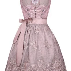 Ein hübsches Midi Dirndl Nara in Mauve von Marjo Trachten. Das Dirndl mit Herzausschnitt wird auf der Vorderseite mit einem Reißverschluss verschlossen, dieser besitzt einen hübschen Anhänger. Die Schnürung mit Satinband zeigt sich auf der Vorderseite. Der Kragen und Ausschnitt wurden mit einer schlichten Strassstein-Borte geschmückt. Am Ausschnitt wurden zusätzlich zwei Schleifen mit Herzanhänger angebracht. Das gesamte Dirndlkleid schmückt sich mit einem floralen Muster. Die doppellagige Schürze wurde aus Spitze gefertigt und mit Perlen und Pailletten besetzt. Der Trachtenrock misst eine Länge von 58cm.