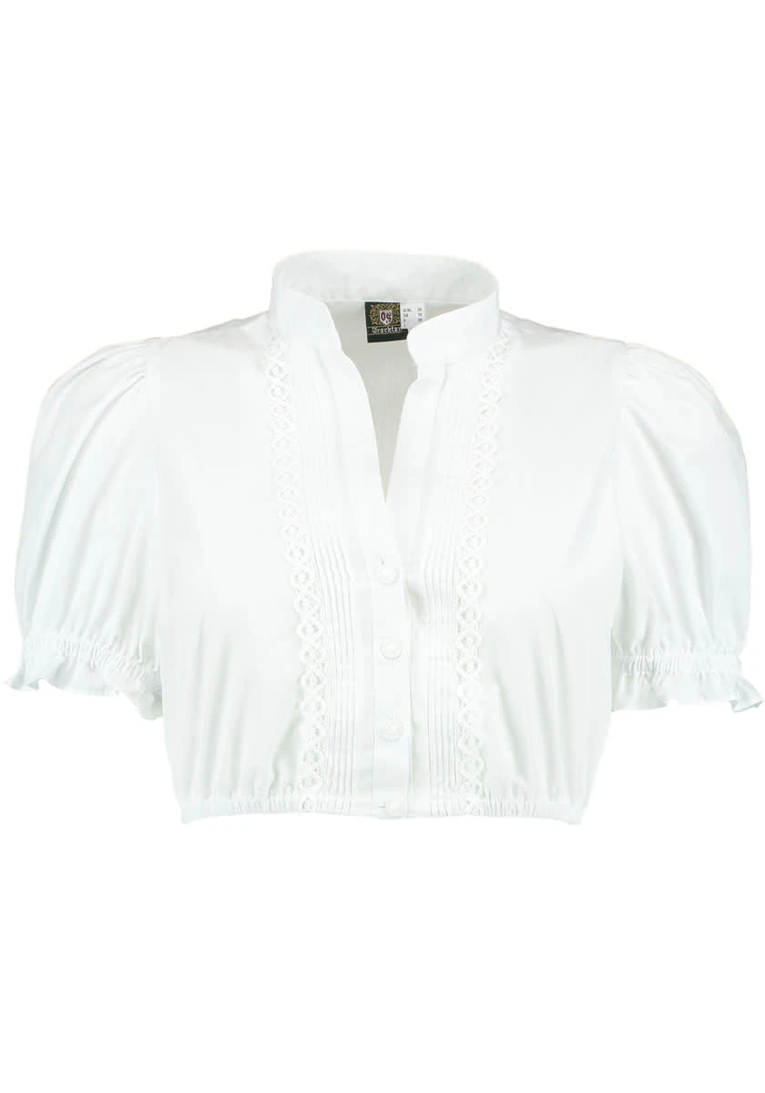 Dirndlbluse von OS Trachten. Die Trachtenmarke mit einem tollen Preis-Leistungs-Verhältnis. Die Bluse ist mit einer hochwertigen Spitze (Made in Germany) verziert und zusätzlich mit 6 Biesen auf der Vorderseite geschmückt. Die traditionellen Zwirnknöpfe stammen aus einer alteingesessnen Knopffabrik, die nur hervorragende Qualität liefert. Die Gummizüge in den Ärmeln und am Bauch passen perfekt. Der modische Stehkragen rundet das schön Bild dieses Trachtenhighlights ab.