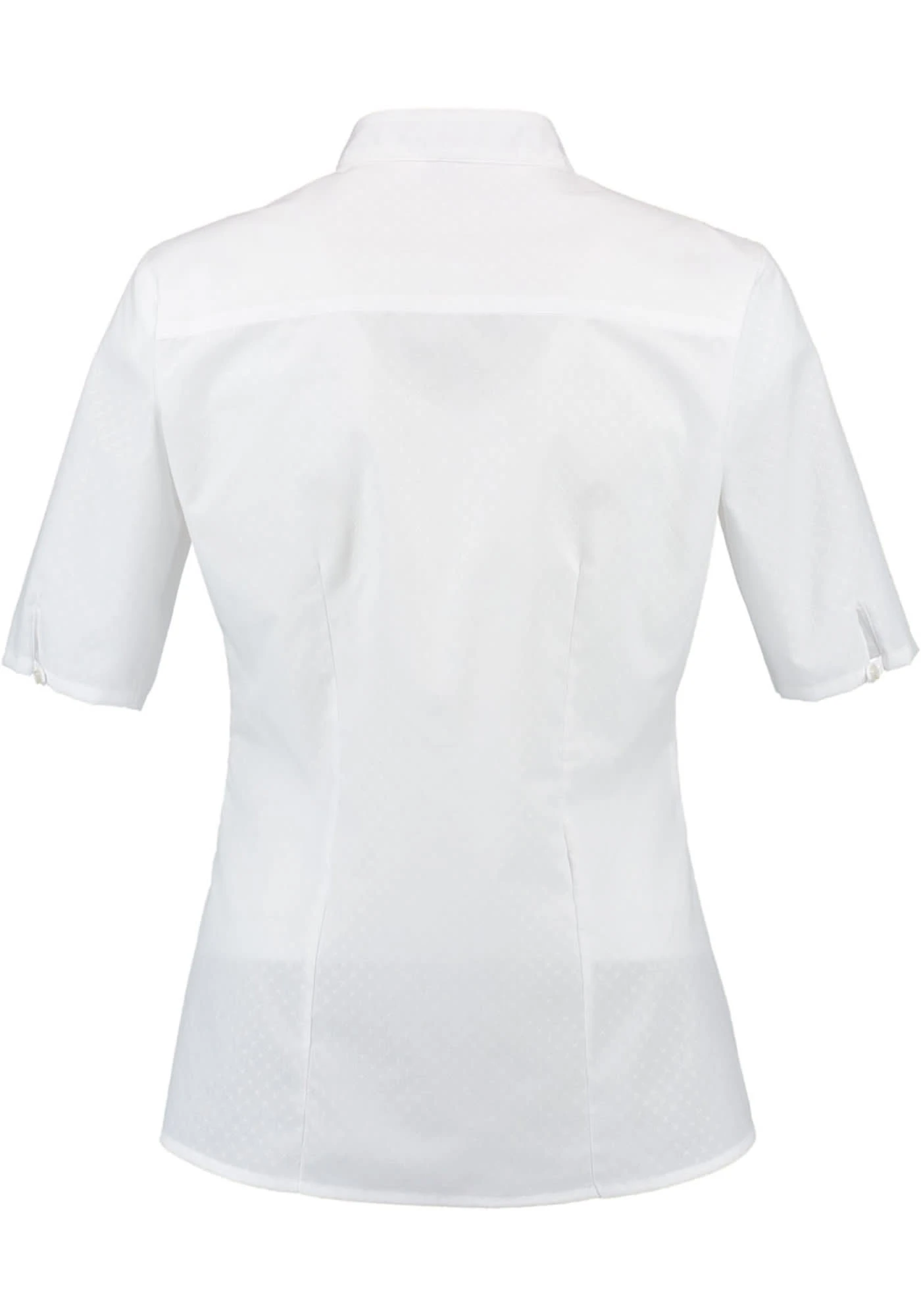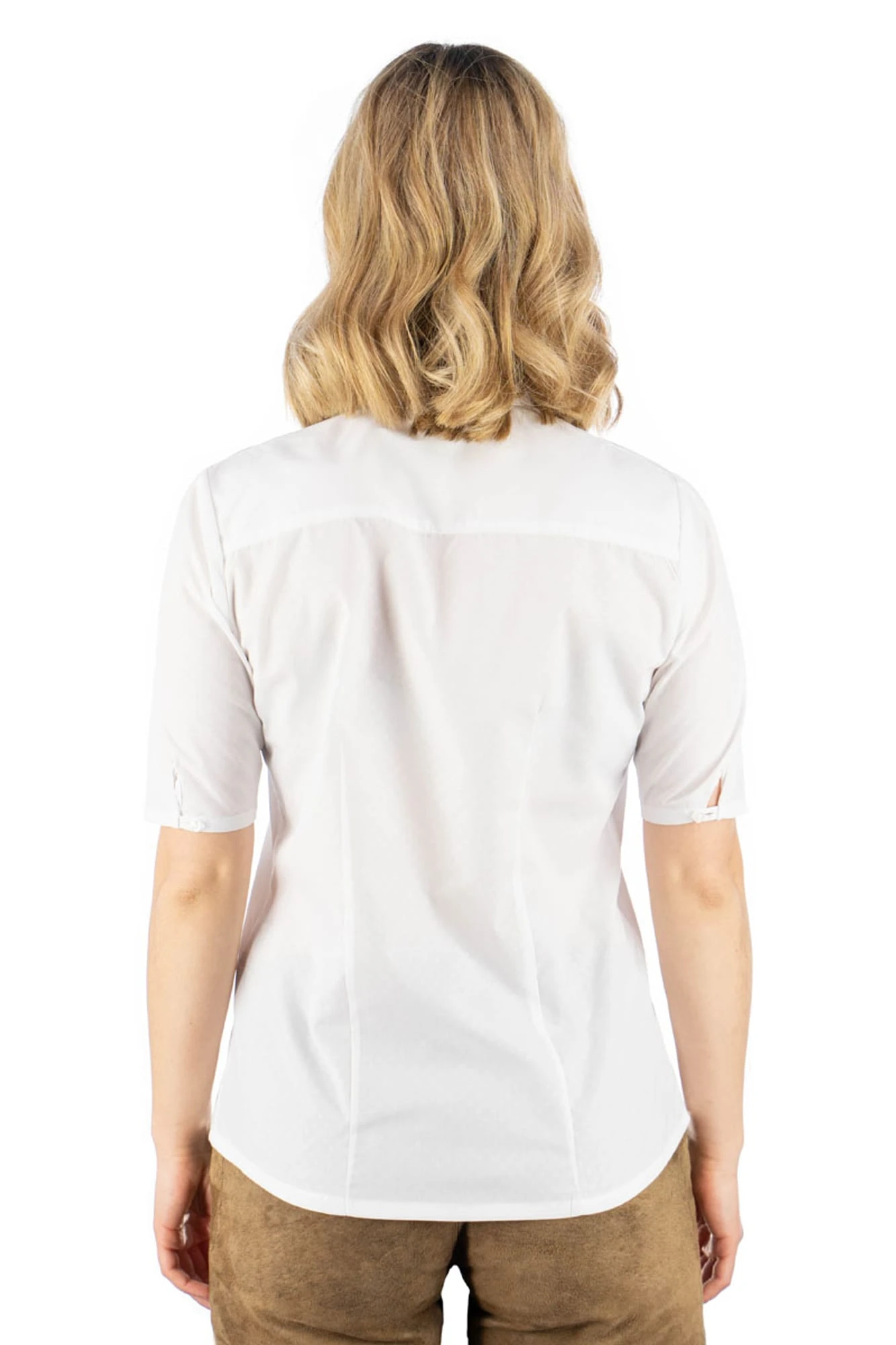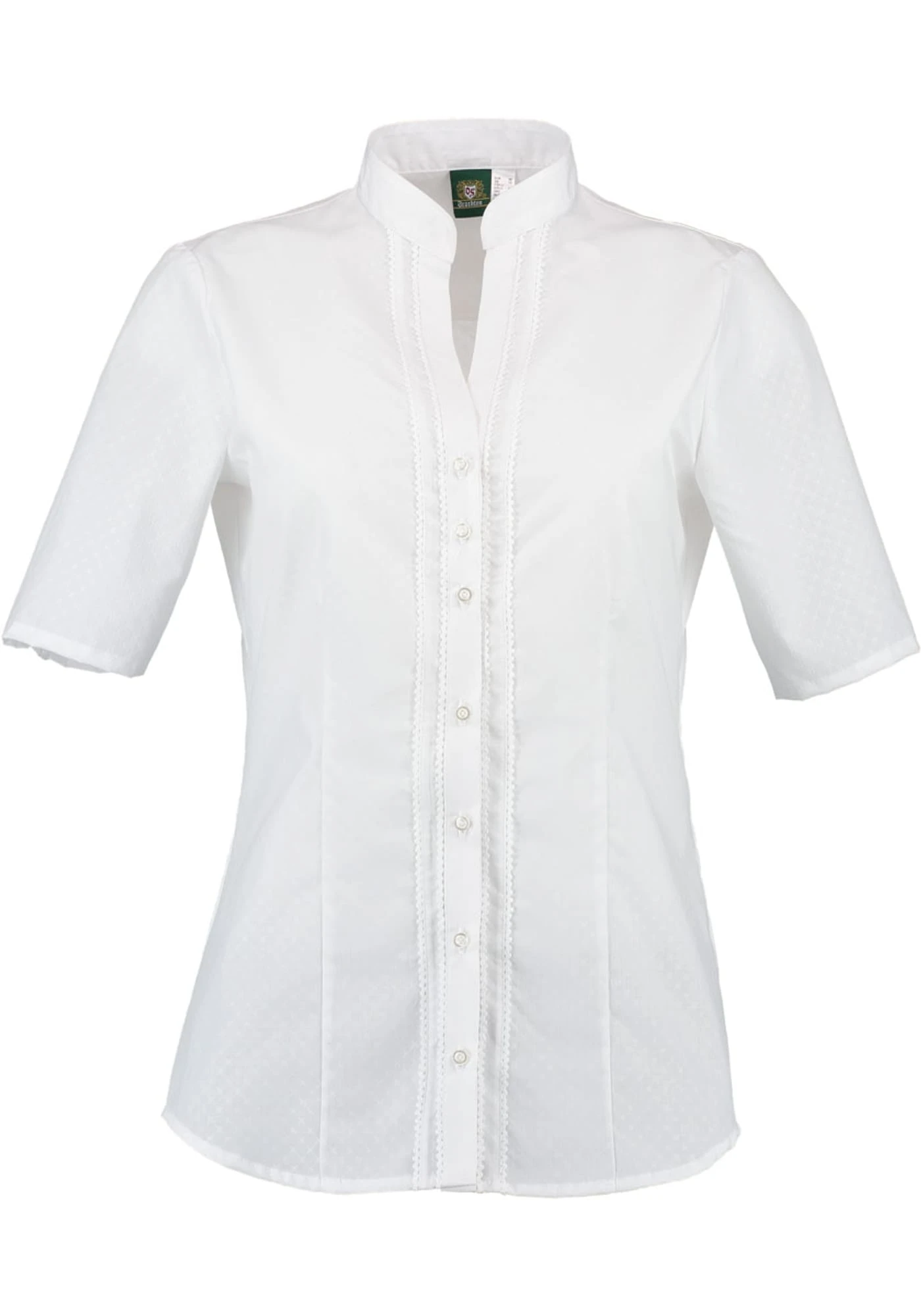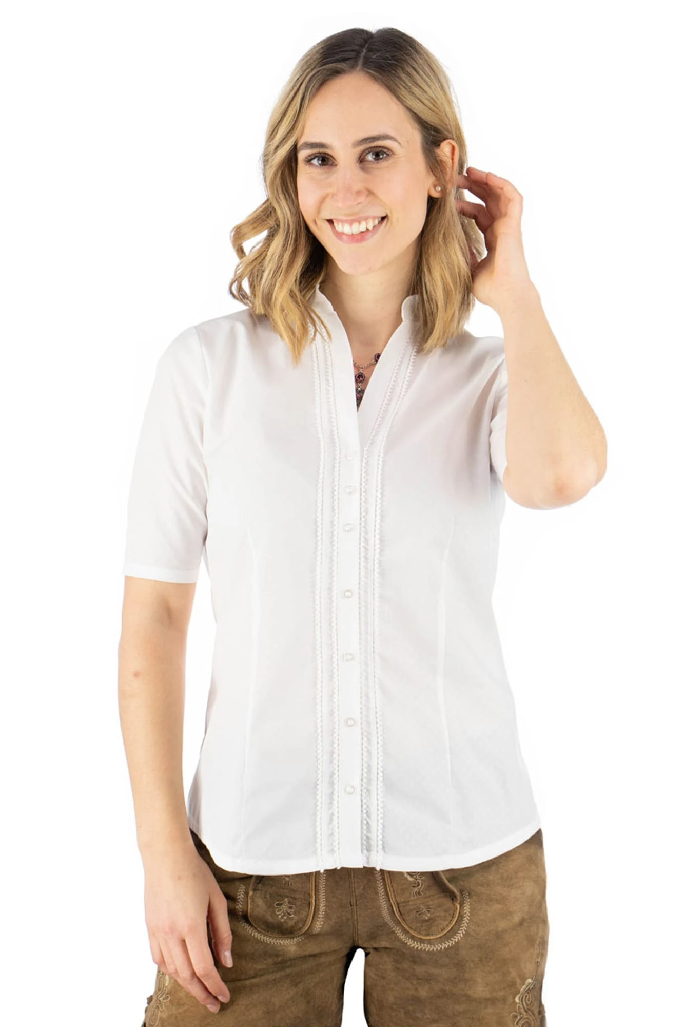 Die perfekte Kombination für eine schöne Halspartie: Stehkragen und V-Ausschnitt. Ob solo oder mit Trachtenjanker getragen wirkt dieser Ausschnitt sehr vorteilhaft. Die 1/2-Arm-Bluse von OS Trachten weist noch weitere feminine Attribute auf: dezente Rüschen umspielen die Knopfleiste; die Abnäher in Vorderteil und Rücken zaubern eine gute Figur. Da Sie diese weiße Bluse zu vielen Trachtenoutfits und zur Jeans kombinieren können, werden Sie sich über die leichte Pflege freuen: das hochwertige Mischgewebe ist waschmaschinenfest und auch ohne Bügeln wieder glatt. In Europa gefertigt.