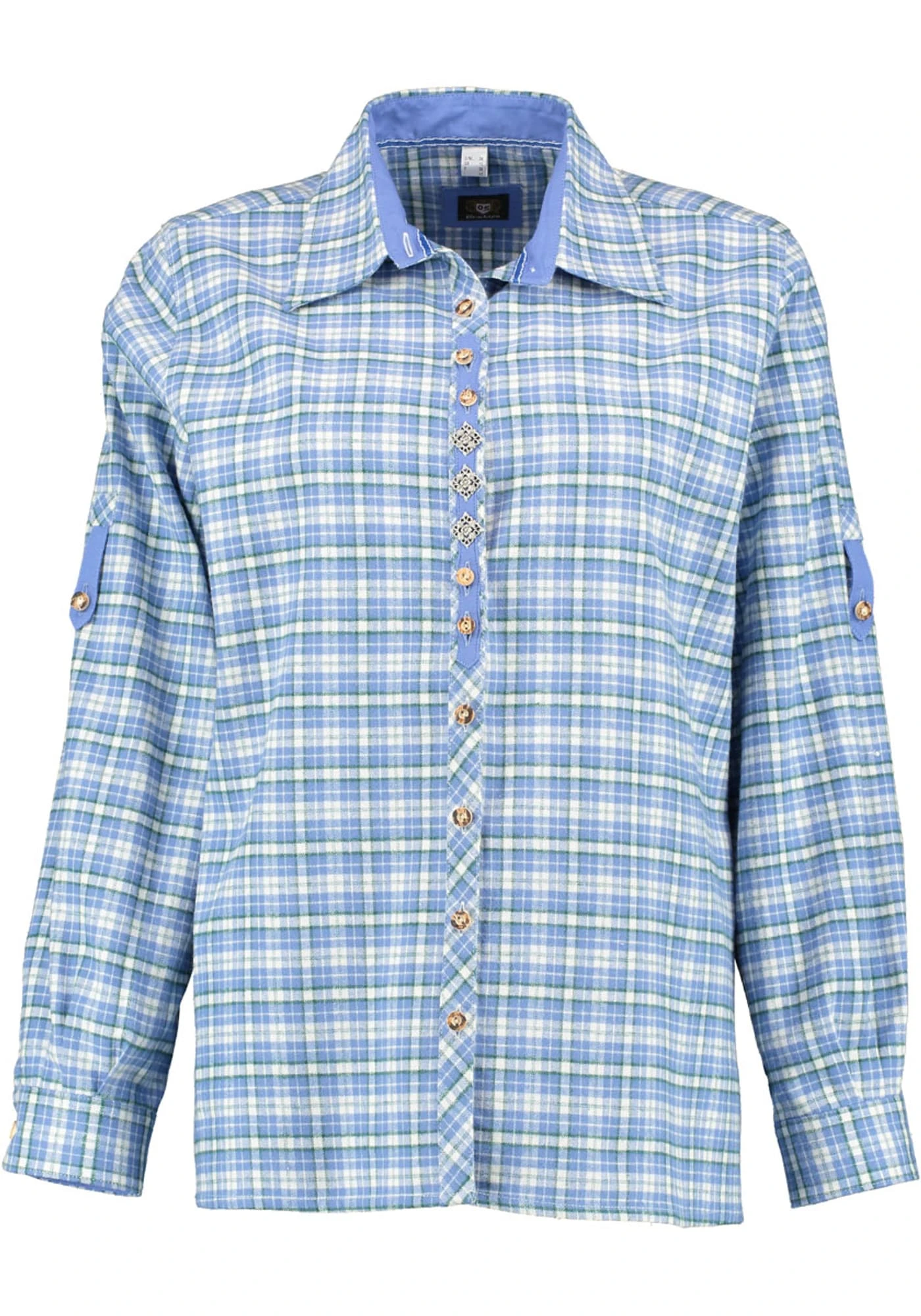 Die Knöpfe in Hirschhorn-Optik und kleine Schmuckelemente lenken den Blick auf die Knopfleiste dieser Karo-Blusen von OS Trachten. Sie haben die Auswahl aus drei Farben und 11 Größen. Aus reiner Baumwolle – leicht angeraut ergibt das den kuschelig-weichen Flanell.