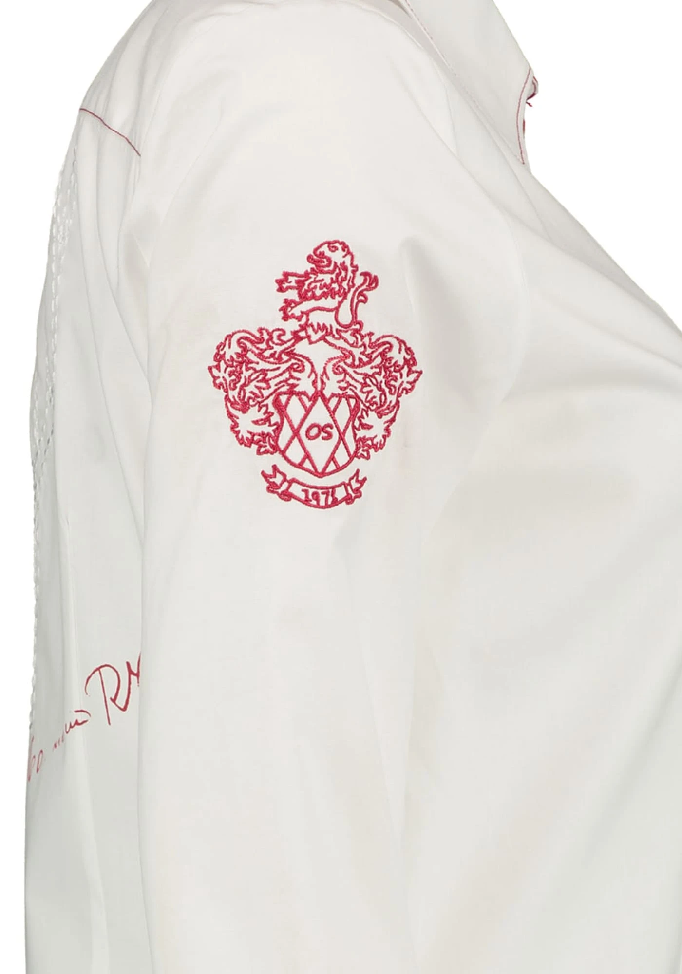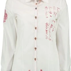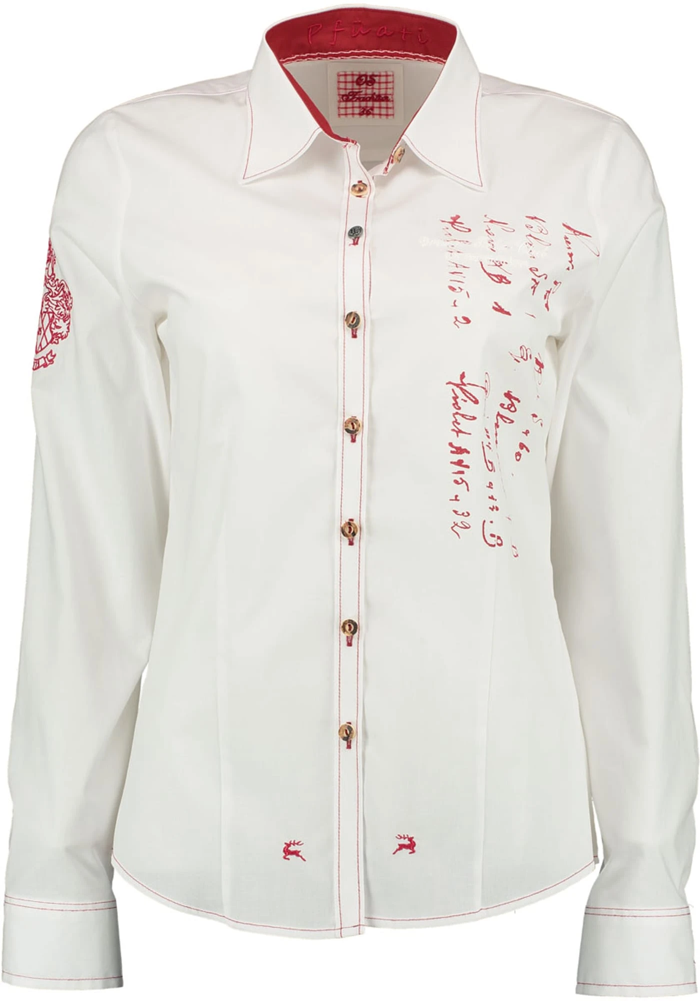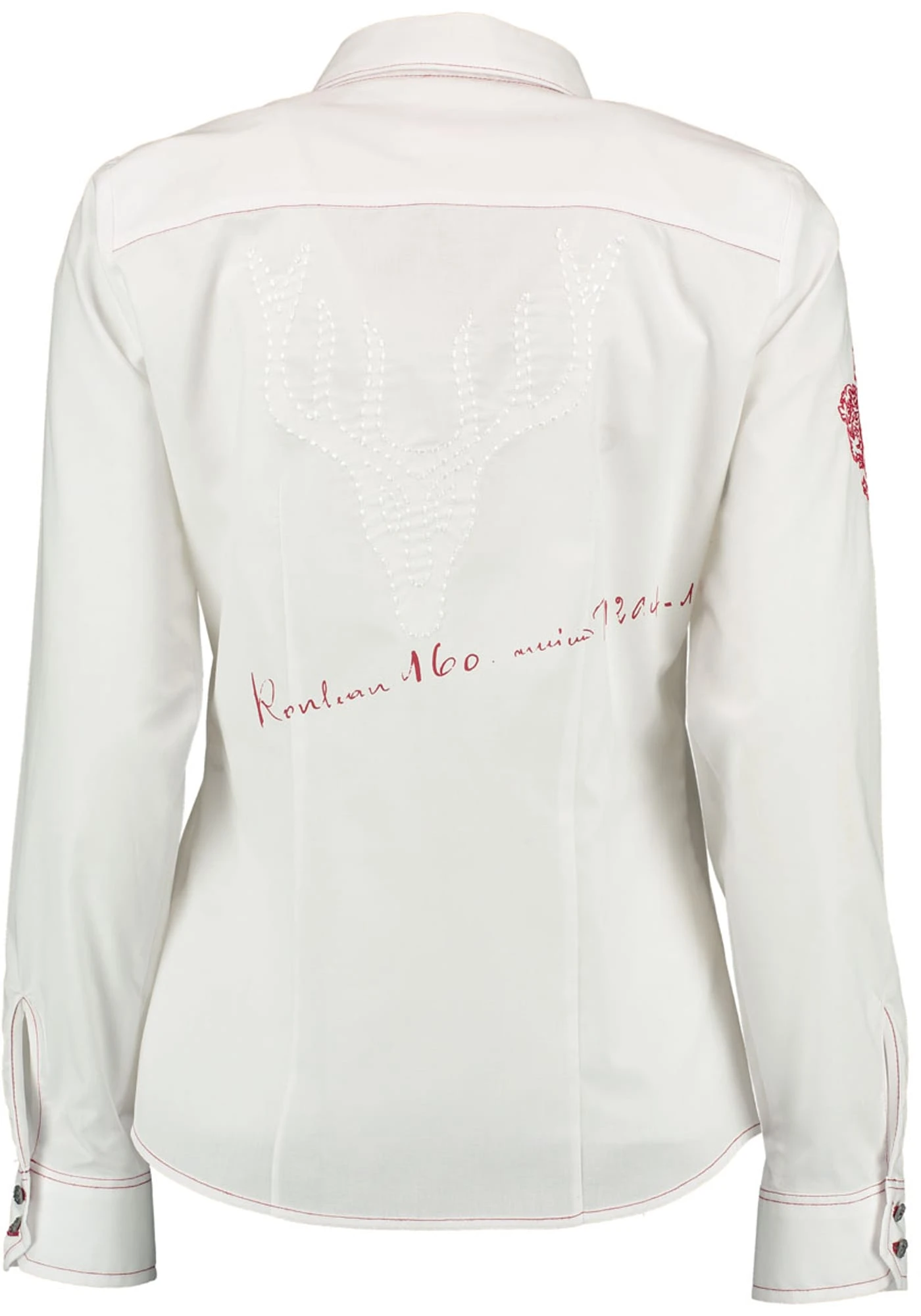 Vom Kragen bis zum Saum mit Rot abgesetzt ist diese weiße Bluse von OS-Trachten. Alle wichtigen Nähte sind mit rotem Garn genäht, interessant ist der rote Druck auf dem linken Vorderteil, dezent dagegen das Ton-in-Ton applizierte Hirschgeweih auf dem Rücken. Eine Bluse, die es verdient, einfach solo über einer Jeans getragen zu werden. Aus Baumwolle mit etwas Elasthan für mehr Bewegungsfreiheit.