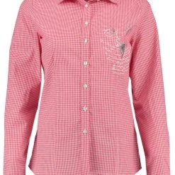 Ein Blusen-Highlight von der Marke OS Trachten. Mit dem Haifischkragen, den echten Perlmuttknöpfen und der schmalen Knopfleiste ist dieses Vichykarobluse topmodisch ausgestattet. Eine wertvolle Hirschdruckapplikation wird durch einen leicht trachtigen Schriftendruck ergänzt. Auf der Rückepasse und der Rückenpartie sind wiederum reichverzierte Herzmotive appliziert. Die Glanzeffekte der Applikationen lassen das Stück ganz besonders wirken. Made in Europe.