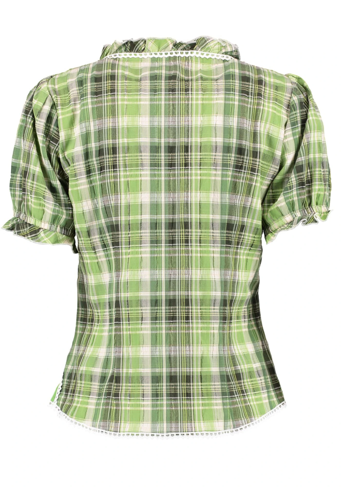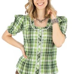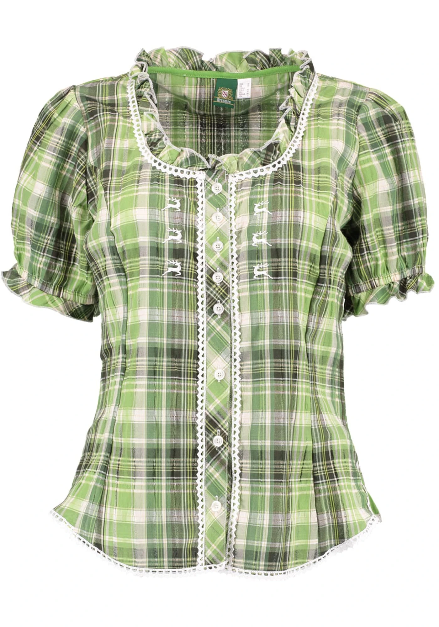 Harmonische Karos und verspielte Rüschen: Gleich in fünf Farbstellungen hat OS-Trachten diese feminine Halbarmbluse entwickelt. Der offene, runde Ausschnitt und die Knopfleiste sind zudem aufwendig mit weißer Litze geschmückt. Das i-Tüpfelchen zum Thema Tracht setzen die sechs gestickten Hirsche rechts und links der Knopfleiste. Mit zwei Abnähern im Rücken ist die Bluse figurgünstig tailliert, für zusätzliche Bewegungsfreiheit sorgt ein wenig Elasthan im Gewebe. Apropos Gewebe: Sie können die Bluse beqem im Schongang Ihrer Waschmaschmaschine waschen, tropfnass aufhängen und am nächsten Morgen wieder anziehen. Qualität aus Europa.