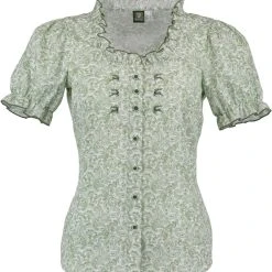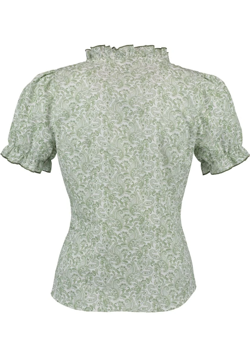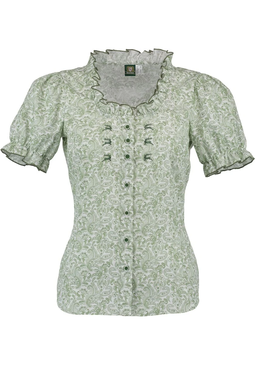 In einem zauberhaften hellgrünen Paisley bedruckt, macht diese Bluse mit ihren gekräuselten kurzen Ärmeln Lust auf das Frühjahr. Fröhlich sind auch die kleinen Hirsch-Stickereien links und rechts der Knopfleiste. Für ein schönes Dekolleté sorgt der ebenfalls gekräuselte Ausschnitt. Vom Trachtenspezialisten OS Trachten in reiner Baumwolle gefertigt. Von Größe 34 bis 58 lieferbar.