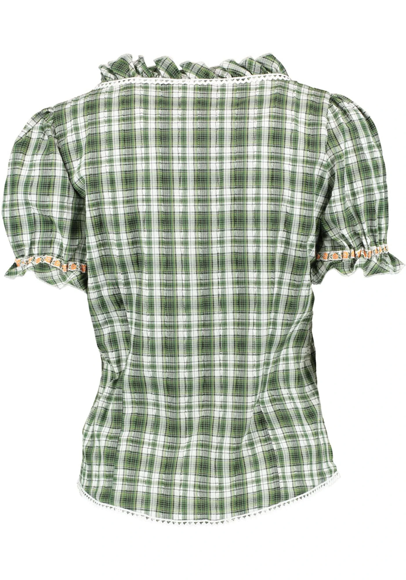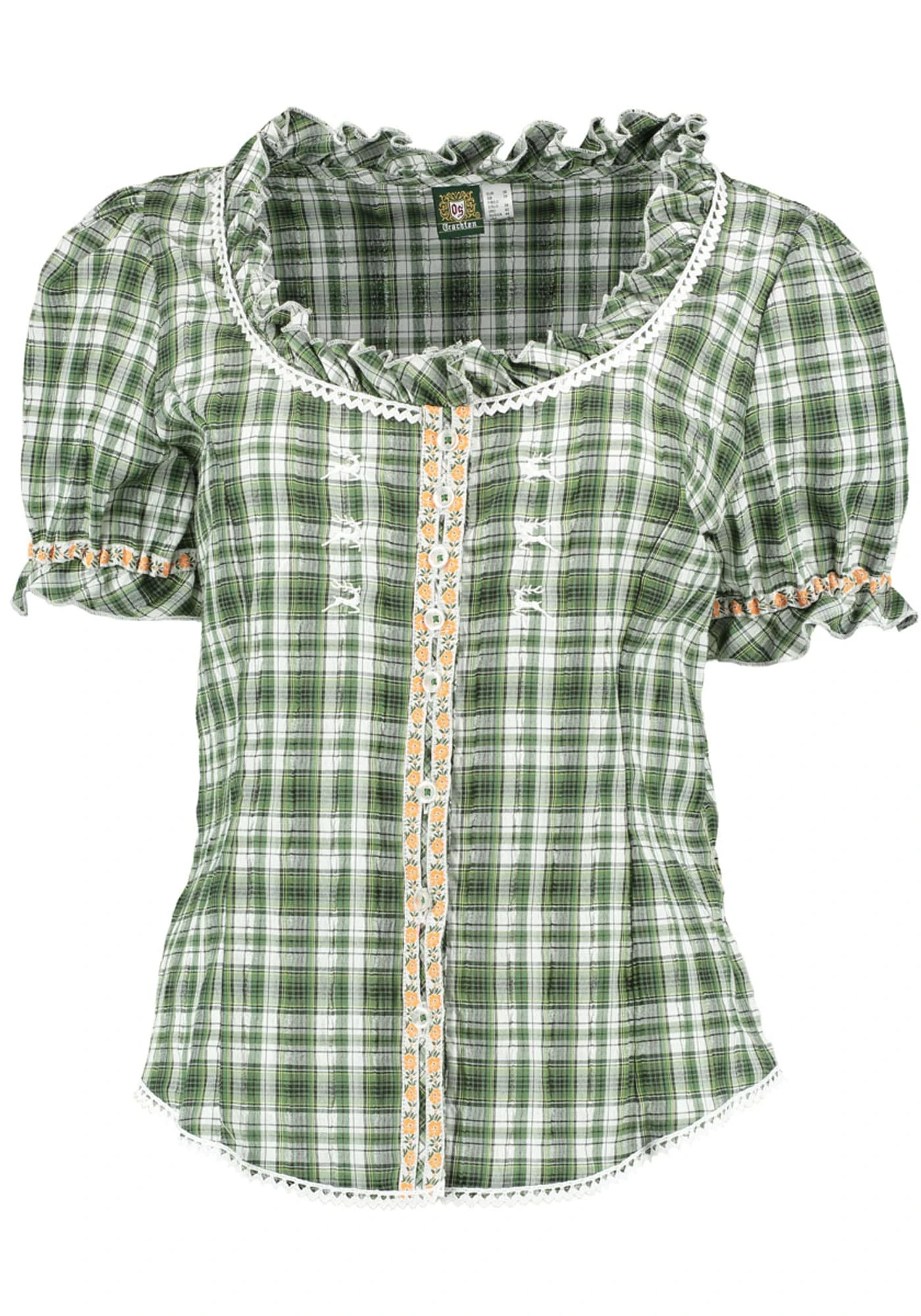 An dieser karierten Trachtenbluse mit den typischen “Puffärmeln” werden Sie mehr als einen Sommer Freude haben. Sie haben die Auswahl aus drei frischen Karos, jeweils mit weißer Litze abgesetzt. Ein besonderer Hingucker sind die mit Blumen bestickten Webbändchen entlang der Knopfleiste. Typisch für OS Trachten: die dezente Stickerei fröhlich springender Hirsche. Die Taillierung der Bluse macht von Größe 34 bis 54 eine gute Figur. Aus pflegeleichtem Mischgewebe.