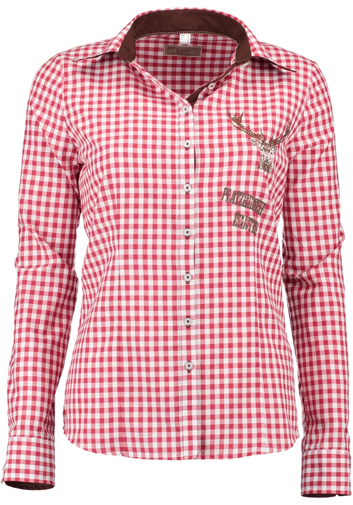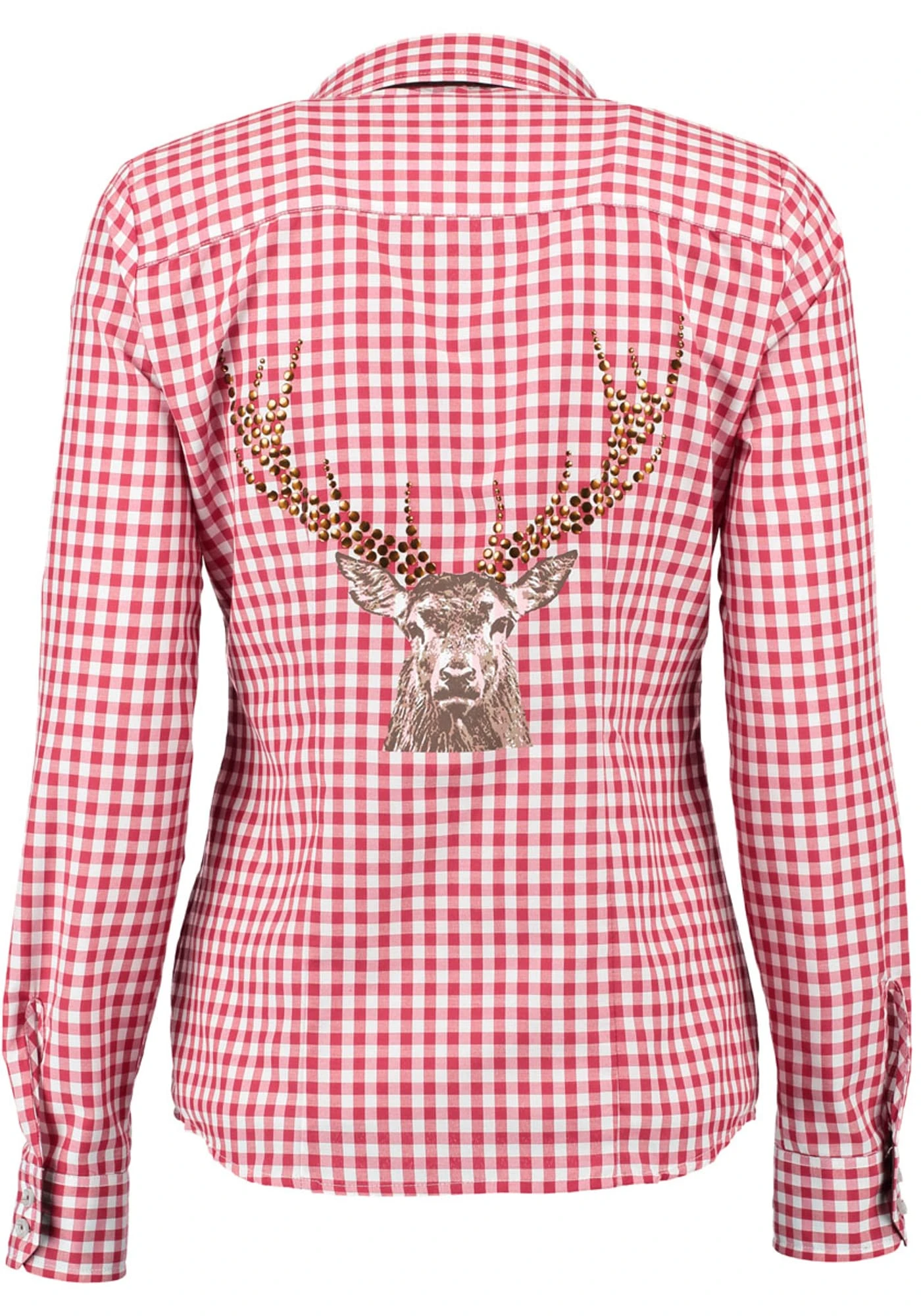 Von der Marke OS Trachten wird eine hochwertig verzierte Trachtenbluse angeboten, die man auch gut sportlich zur Jeans tragen kann. Die Hirschgeweihe auf dem linken Vorderteil und auf dem Rücken sind in einer Nietenoptik ausgeführt. Diese ergänzt sich gut zu den gedruckten Hirschknöpfen. Der zünftige Spruch “Platzhirsch Wanted” unterstreicht die freche junge Produktaussage dieser Bluse.